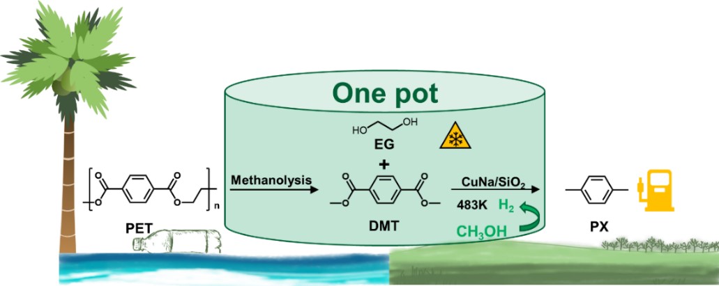 赵晨教授团队开发一种在无氢条件下,一锅法将聚对苯二甲酸乙二醇酯(PET)定量转化为对二甲苯(PX)和乙二醇(EG)的低成本工艺。该工艺使用甲醇作为解聚与供氢溶剂,改性非贵金属Cu/SiO2为催化剂,集合PET醇解、甲醇脱氢与DMT选择性加氢脱氧过程为一体,实现了废弃聚酯塑料直接转化为汽油燃料和防冻液成分。