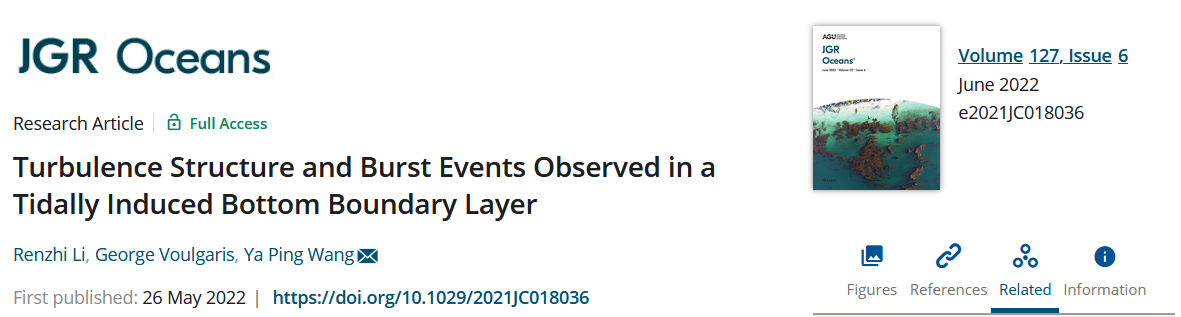 河口海岸学国家重点实验室汪亚平教授团队在长江口外水下三角洲前缘15 m处进行了多个潮周期的座底式和船载锚系观测,获得了高质量水沙动力资料,开展感潮河口近底部边界层的湍流结构和间歇性猝发事件研究,研究成果6月14日以“Turbulence Structure and Burst Events Observed in a Tidally Induced Bottom Boundary Layer”发表在国际重要学术期刊Journal of Geophysical Research: Oceans上。