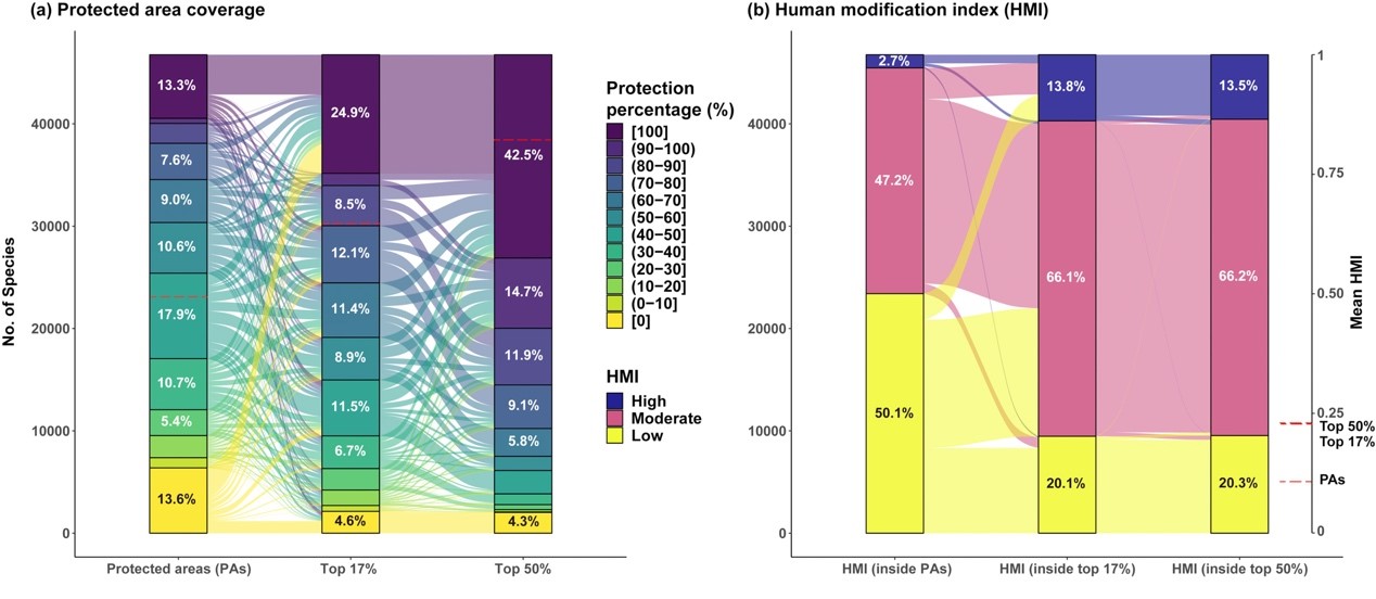 图示为(a)全球46752个树种在当前保护区(PAs)、树种多样性最高的前17%(top 17%,《生物多样性公约CBD》提出的2020年全球保护区目标)和前50%(top 50%,“半个地球”倡议提出的2050年全球保护区目标)区域内的受保护程度及其变化情况(%),以及(b)这些物种在前述区域内的分布区所对应的人类影响综合指数(Human Modification Index, HMI;0代表无人类影响,1代表完全的人类产物)。人类影响综合指数划分为三个等级:低(0 ≤ HMI ≤ 0.1), 中(0.1 < HMI ≤ 0.4), 和高(0.4 < HMI ≤ 1.0)。