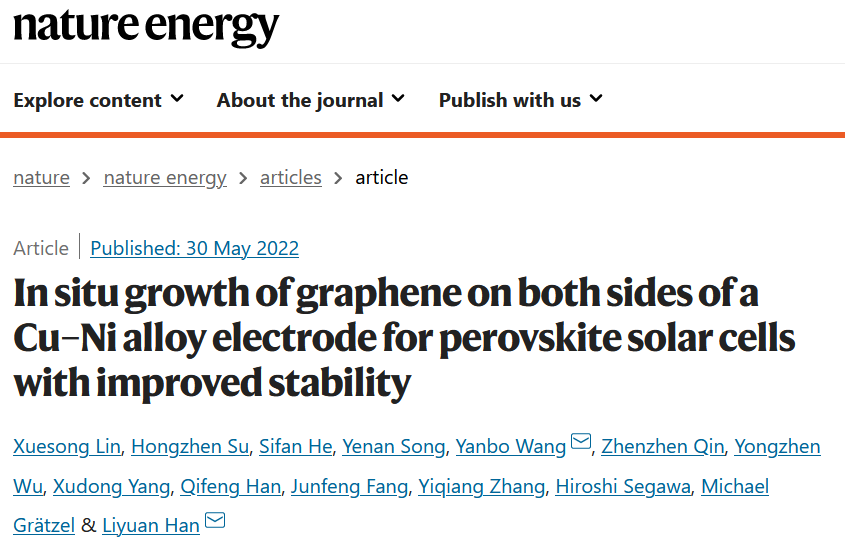 纳光电中心宋也男副研究员联合上海交大韩礼元团队在钙钛矿太阳电池稳定性方面取得了重要进展,相关成果于5月30日以“In situ growth of graphene on both sides of a Cu–Ni alloy electrode for perovskite solar cells with improved stability”为题在线发表在国际高水平期刊Nature Energy中。华东师大纳光电中心的硕士生何思凡为共同第一作者。