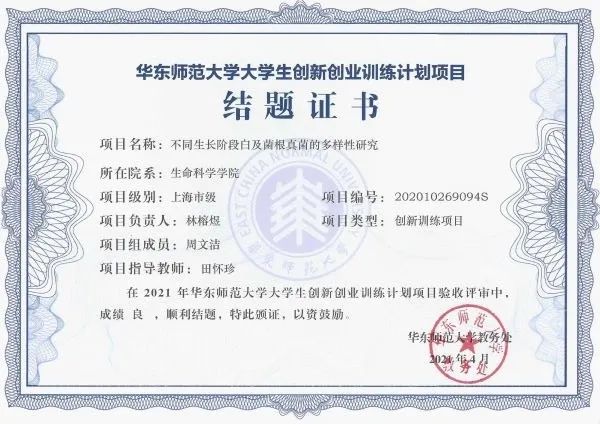 课堂之外,她积极参与各类研究课题,提升自己的实验技能和专业素养,曾分别以课题组长和成员身份完成两项上海市创新创业项目——《不同生长阶段白及种子菌根真菌多样性的研究》和《抑制乳制品中腐败菌的益生菌筛选》,参与“立德树人”人文社会科学重点研究基地建设项目,并带领成员完成相关校级创新创业项目。