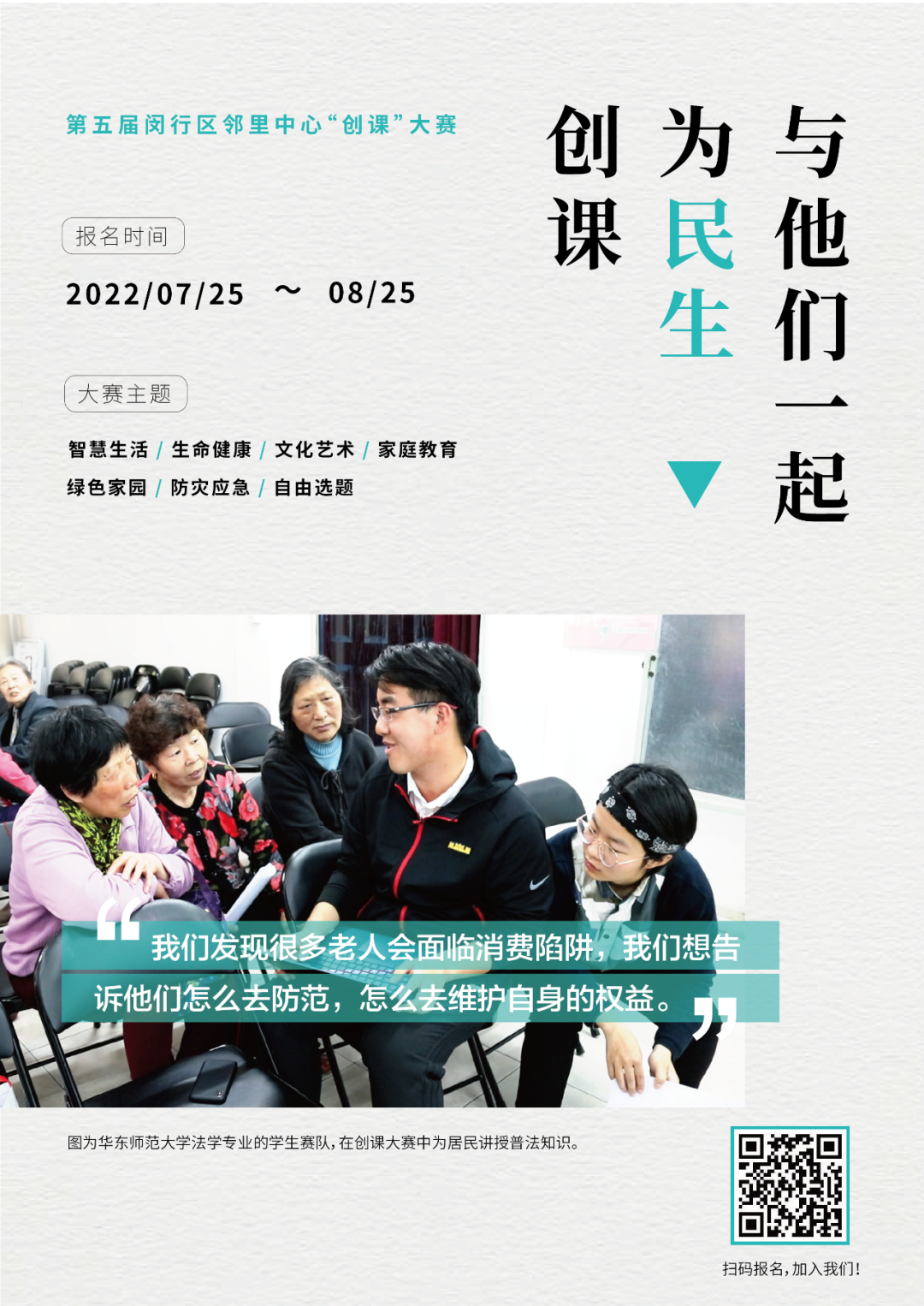 本届大赛继续秉承“问需于民”“能者为师”等服务理念,聚焦疫情防控中老年人的实际需求,结合第三届、第四届“创课”大赛的成果经验和当前新冠疫情防控常态化需要,倡导青年学生开发以线上微课为主、线下课程为辅的社区教育系列微课,尤其是助力老年人“智慧生活”的精品课程,满足闵行社会治理需要和社区居民多样化学习需求,提高老年人生活质量。