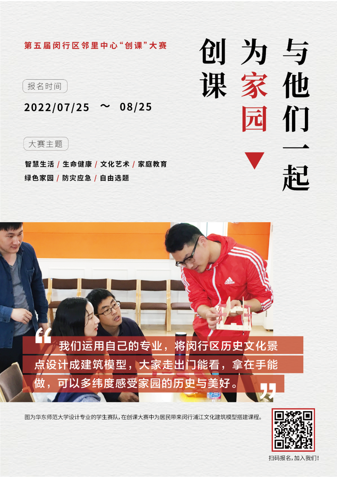 *参赛者可根据相关主题阐述,结合自身专业或兴趣选择其中一个主题报名参赛。以上阐述所涉及的课程范围较大,建议各参赛团队突破对社区课程的固有认知,洞察居民实际需求,以问题为导向,找寻更接地气的课程开发切入点。