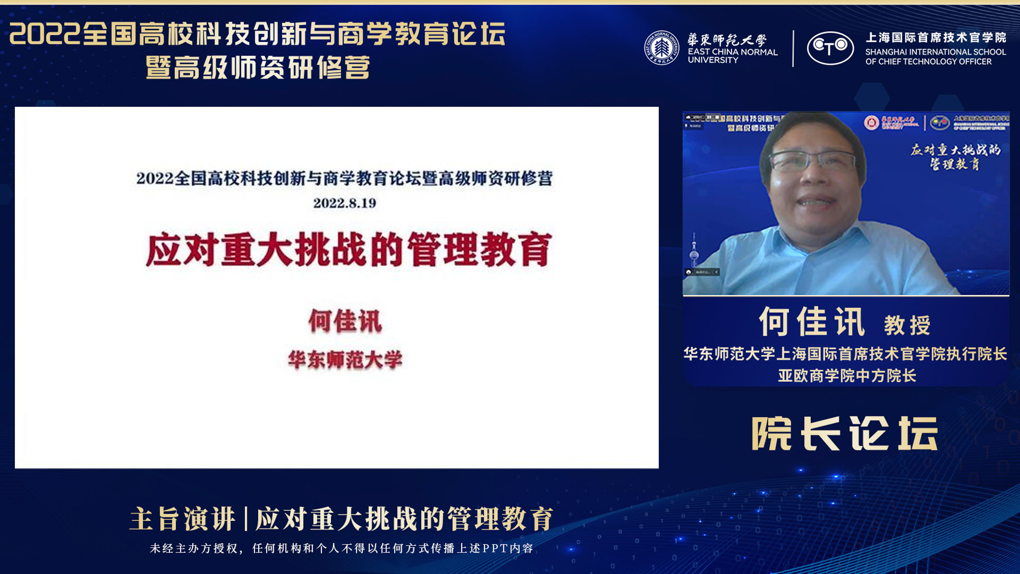 由万象城awcsport官网主办的“第二届2022全国高校科技创新与商学教育论坛暨高级师资研修营”8月19日在线举行,以“应对重大挑战的管理教育”为年度主题,邀请国内外高校一流专家发表主旨演讲并进行专题授课。首日论坛直播吸引了近8万人次收看。万象城awcsport官网党委常委、副校长顾红亮教授、万象城awcsport官网校长助理吴瑞君教授分别主持上午的校长论坛和下午的院长论坛。