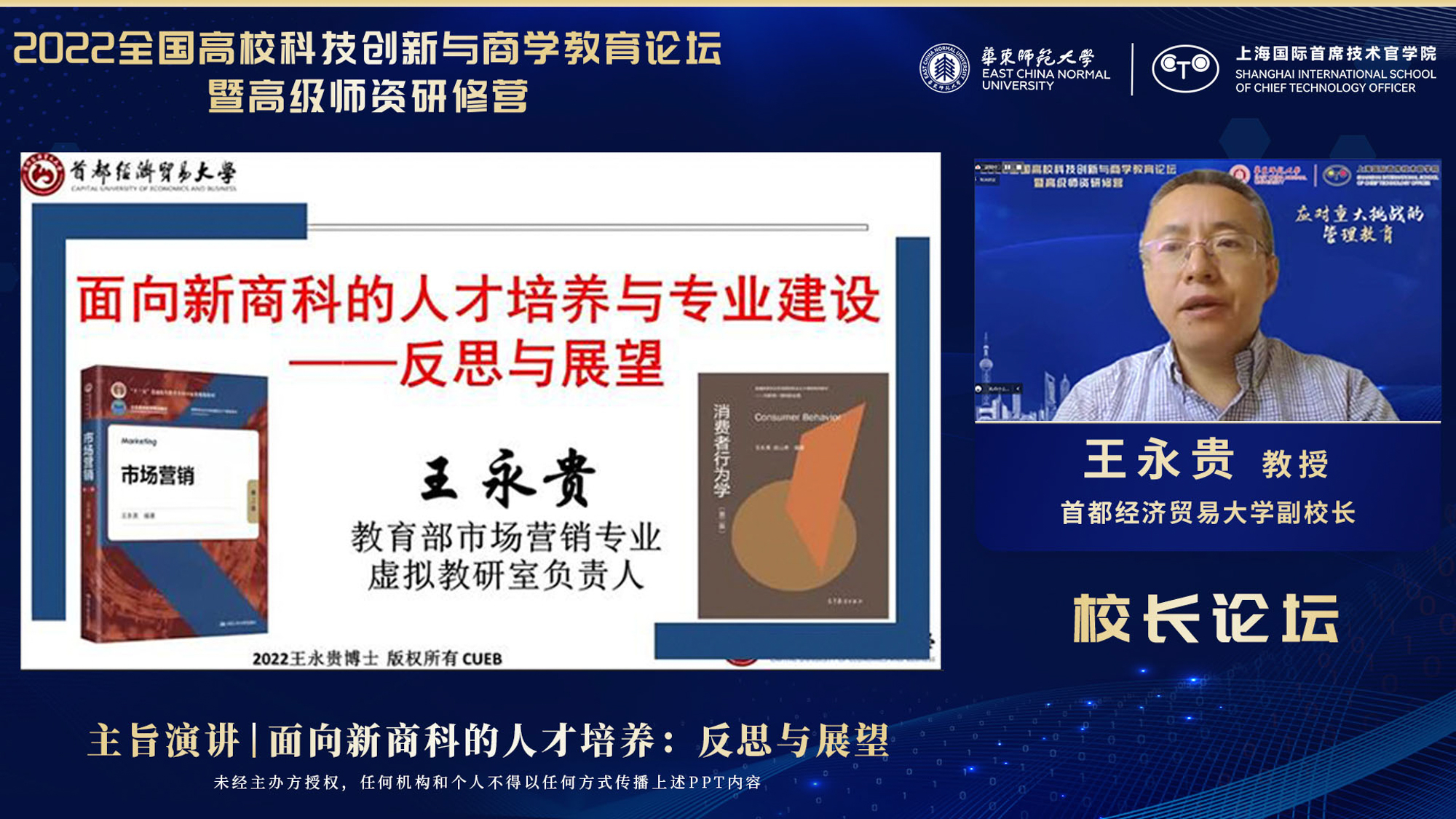 首都经贸大学副校长王永贵教授作了题为“面向新商科的人才培养:反思与展望”的主旨演讲。他对“数字经济与人才培养大变革”的新背景和新商科进行介绍,反思商科教育,总结了立德树人根本任务与专业建设的目标,强调重在建设、重在实效、重在机制,概括了枯燥口号性、事实脱节性、盲目随意性、相对粗放性等多个问题。他还提出“教什么”和“怎么教”,引出了GAP框架,最后进行了强调战略、创新、共创、数智、交叉、制度和人才思维的新商科建设和人才培养的展望,强调“让每个专长者有路可走”。
