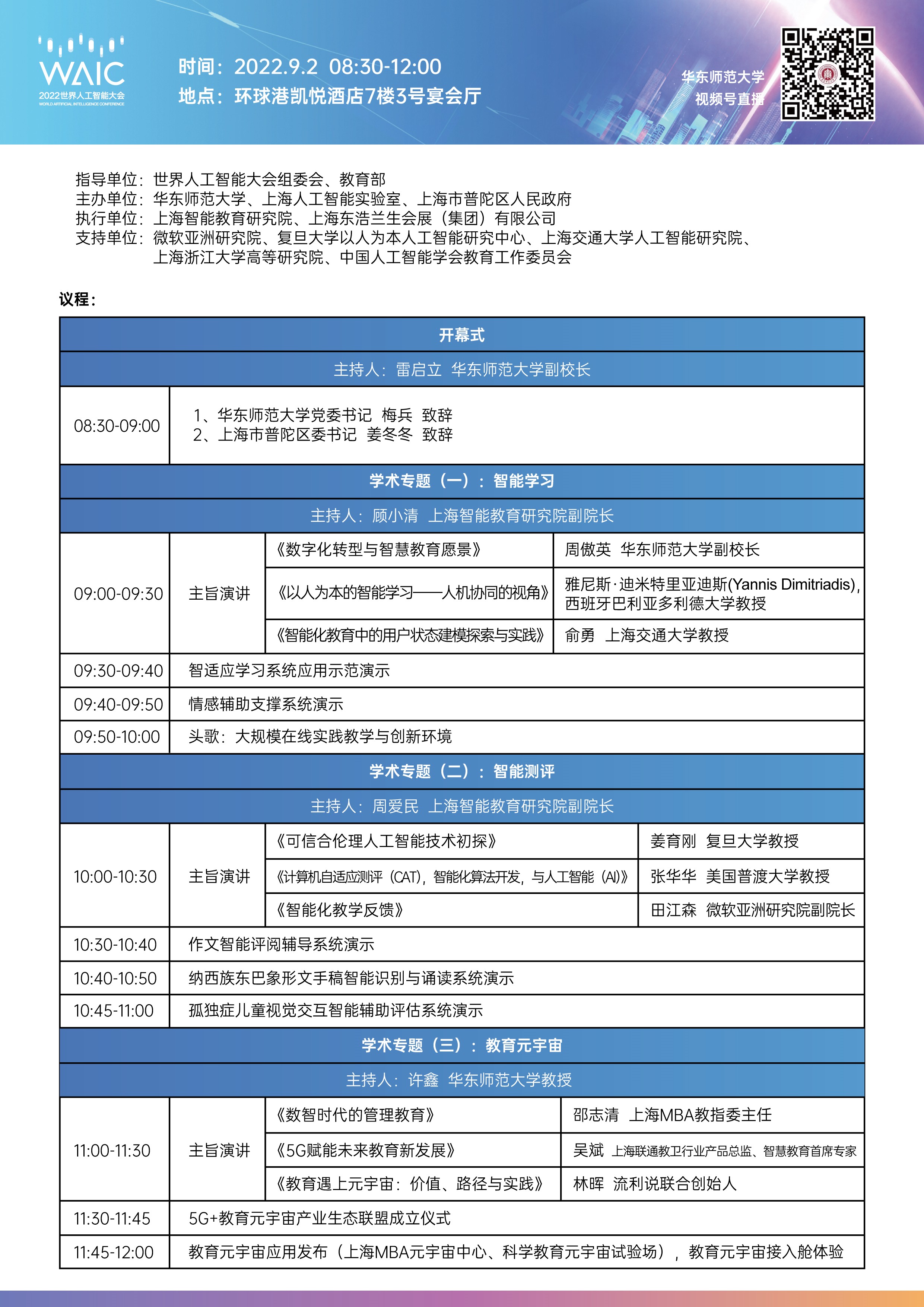 2022世界人工智能大会来了,由华东师大领衔主办的2022世界人工智能大会教育论坛即将启幕。本次论坛以“引领学习变革 智创教育未来”为主题,聚焦智能学习、智能测评、教育元宇宙三大领域。论坛邀请到教育部、上海市相关领导及20余位国内外知名专家学者进行主旨演讲、前沿报告、高端对话和发布重磅研究成果。论坛将以线下会场与线上直播、元宇宙会场相结合的方式进行。