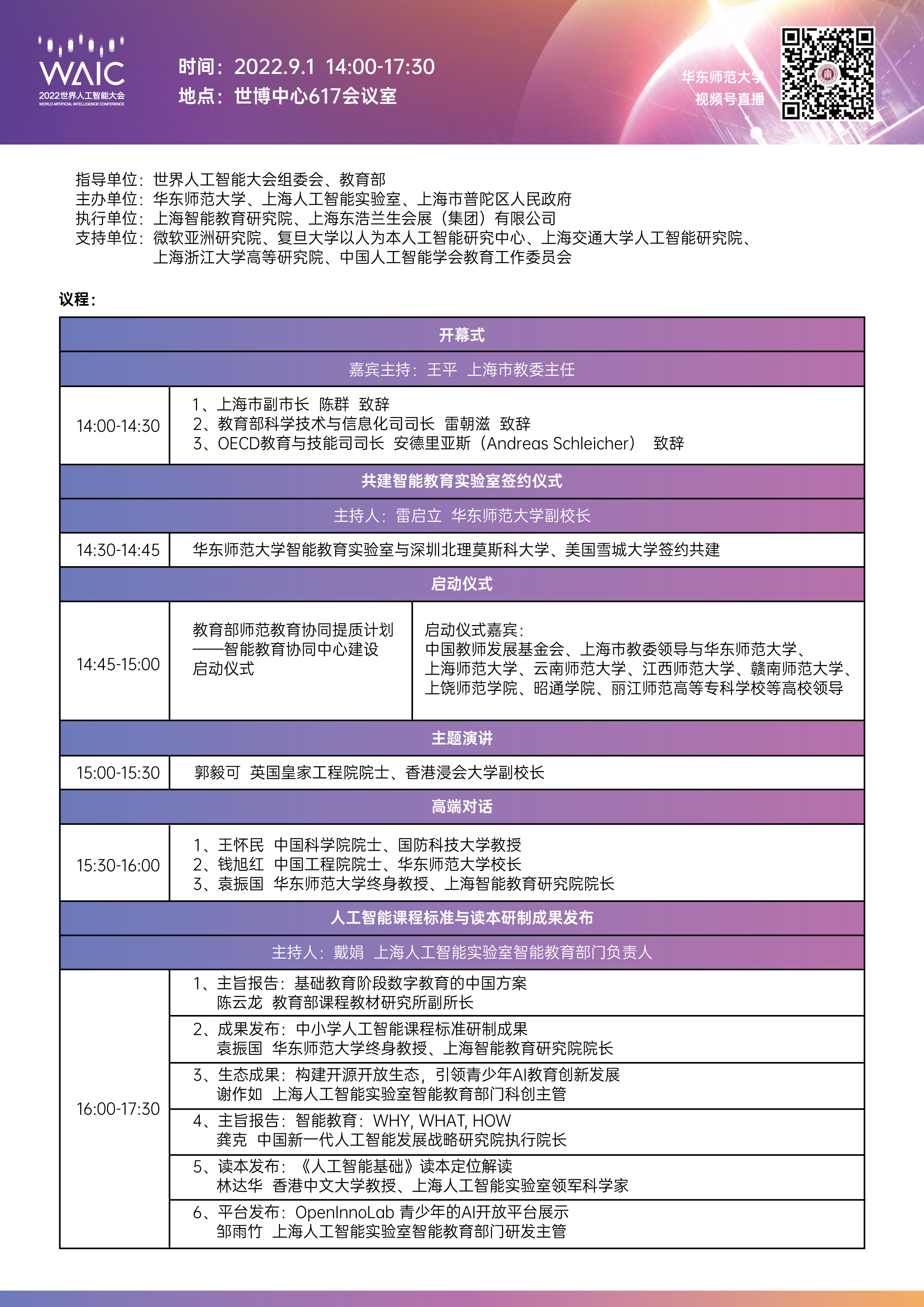 论坛邀请到教育部、上海市政府领导,以及近30位国内外知名专家学者通过主旨演讲、前沿报告、高端对话、发布成果等形式进行交流研讨,并进一步促进国内外高校、企业、研究机构的合作共建,以推动全球智能教育协同发展,为教育创新发展全方位赋能。