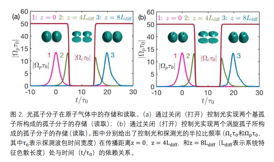 通过对里德堡-EIT系统建立数学模型并进行超出平均场近似的理论分析和计算,课题组发现体系具有很强的非局域克尔非线性效应。利用非局域非线性与衍射效应的平衡,在该系统中可产生稳定的(2+1)维(其中“2”表示两个横向的空间维度,“1”表示一个传播方向的空间维度)光孤子分子,他们可由基孤子或涡旋孤子的无接触相互作用而形成。这些光孤子分子具有比单个光孤子大得多的几何尺寸(约80微米),极低的产生功率(微瓦量级),以及很好的可操控性。同时,课题组还发现,基于非局域非线性与色散和衍射效应的平衡,在该系统中也可产生稳定的(3+1)维(其中“3”表示两个横向的空间维度和一个时间维度,“1”表示一个传播方向的空间维度)高维光孤子分子。这些光孤子分子不仅具有很低的产生功率,还能以远低于真空光速的速度(约为真空光速的10的负5次方量级)传播。此外,通过主动操控(关闭和打启)系统中的控制激光场,可实现这些光孤子分子的存储和读取(图2),并具有较高的存储效率和保真度。