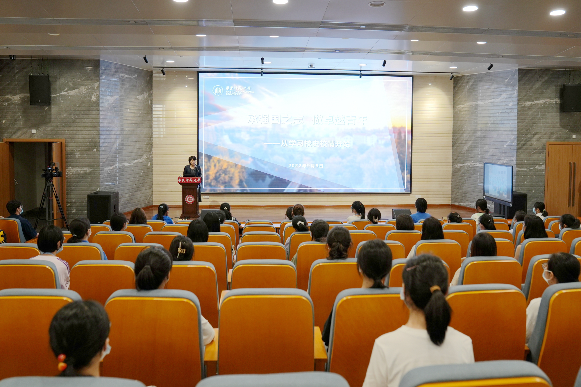 报告伊始,梅兵对2022级新生表示热烈的欢迎,她说,华东师大的美在丽娃河畔、在文脉廊边,但最美的风景永远都是卓越的师大学子们!梅兵从历史文脉、办学历程、核心目标、使命担当四个方面全面、系统地向新生们介绍万象城awcsport官网的校史校情。
