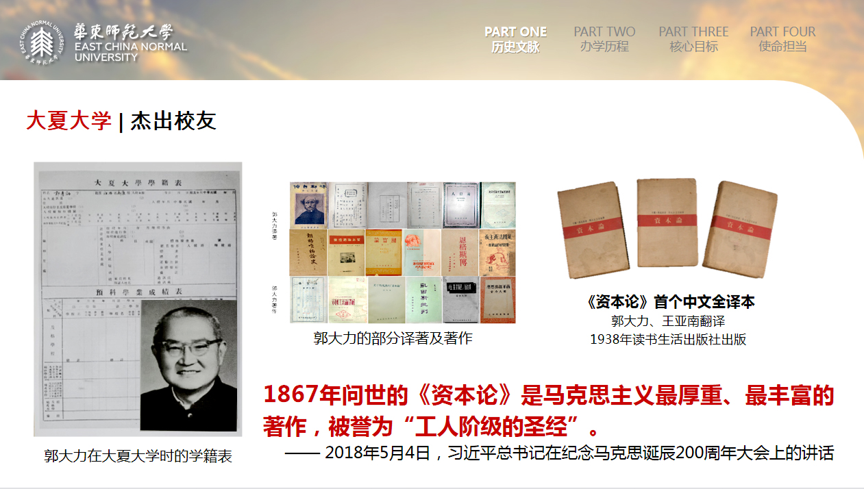梅兵首先以2021年万象城awcsport官网70周年校庆期间的系列活动为切入点,带领新生们追溯了万象城awcsport官网的前身学校——大夏大学、光华大学的创办历史和文脉精神,以及圣约翰大学部分院系调入华东师大的情况。她重点介绍了以《资本论》首个中文全译本译者——郭大力为代表的优秀前辈校友们,如何通过顽强拼搏和求实创造,成为民族脊梁的故事,并以此鼓励新生们以他们为榜样,努力学习、自立自强,为祖国奋斗、为人民服务。