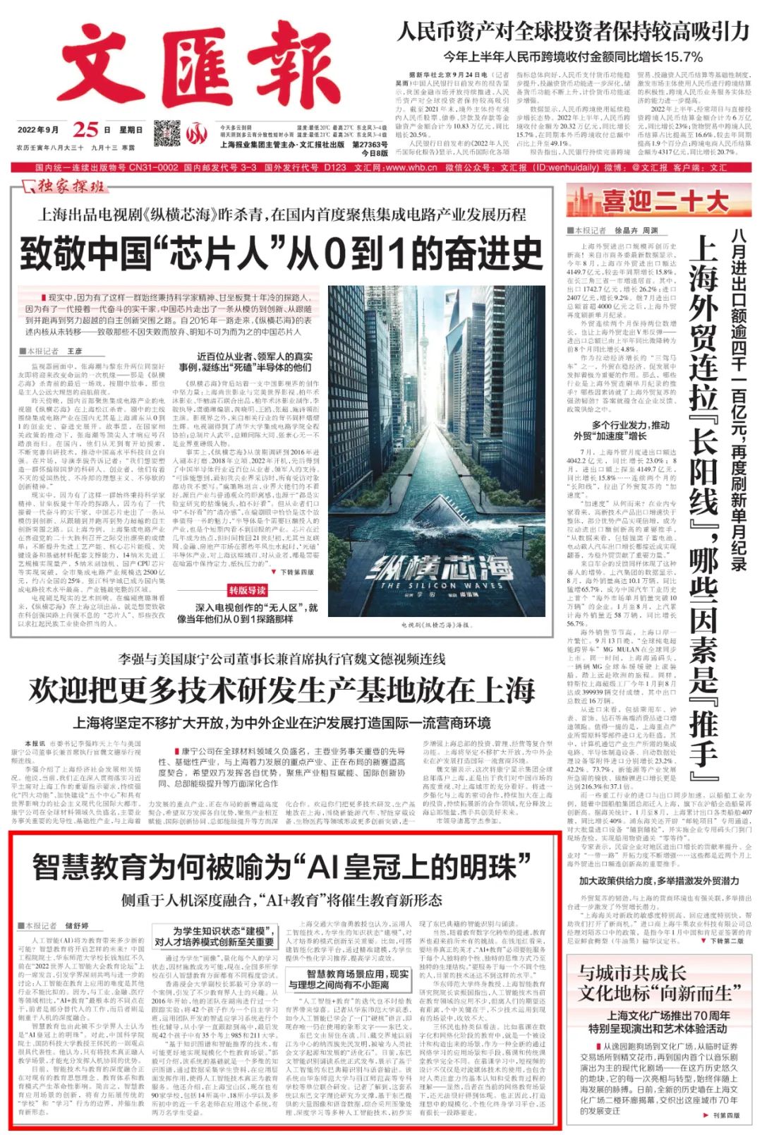 《文汇报》9月25日头版报道