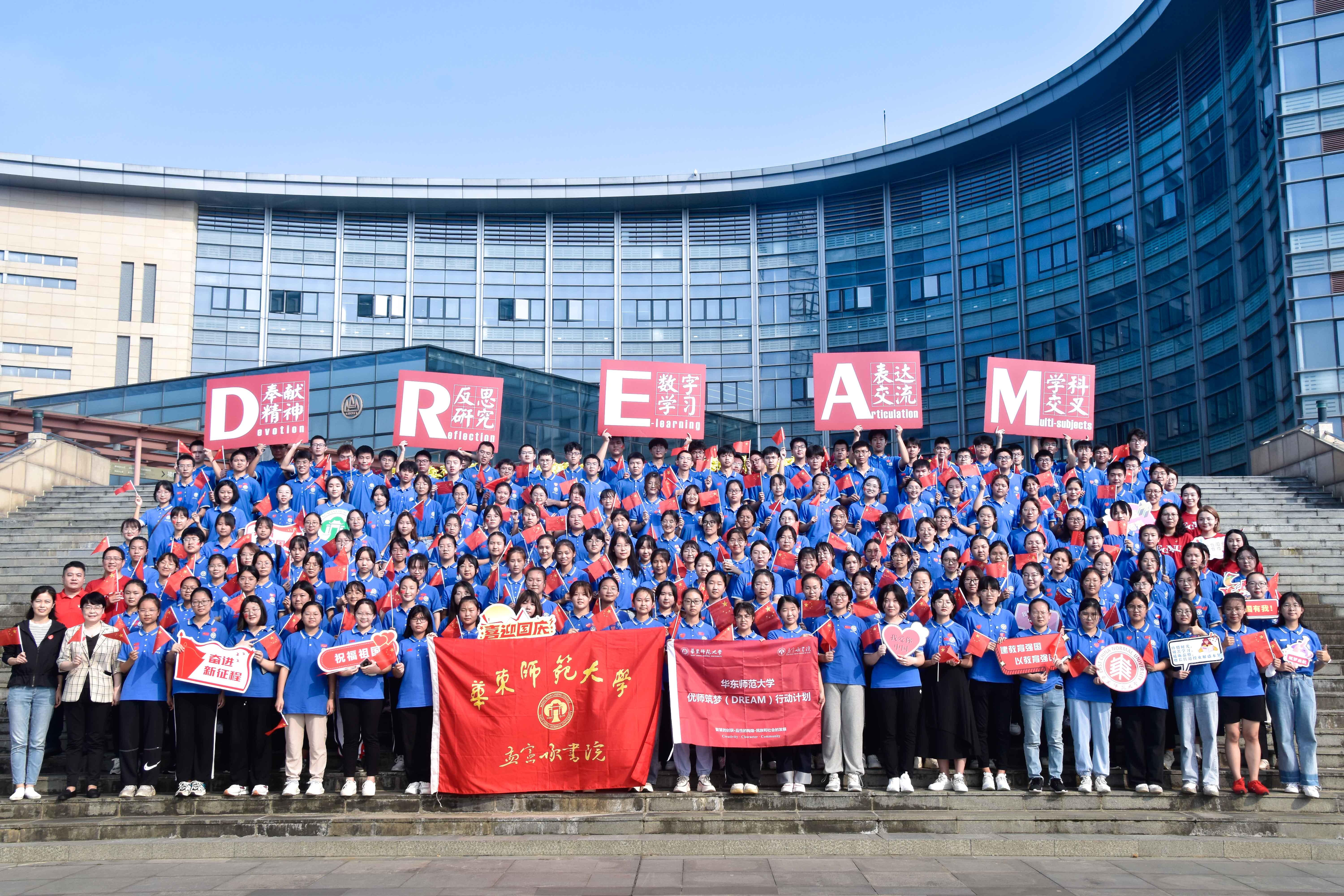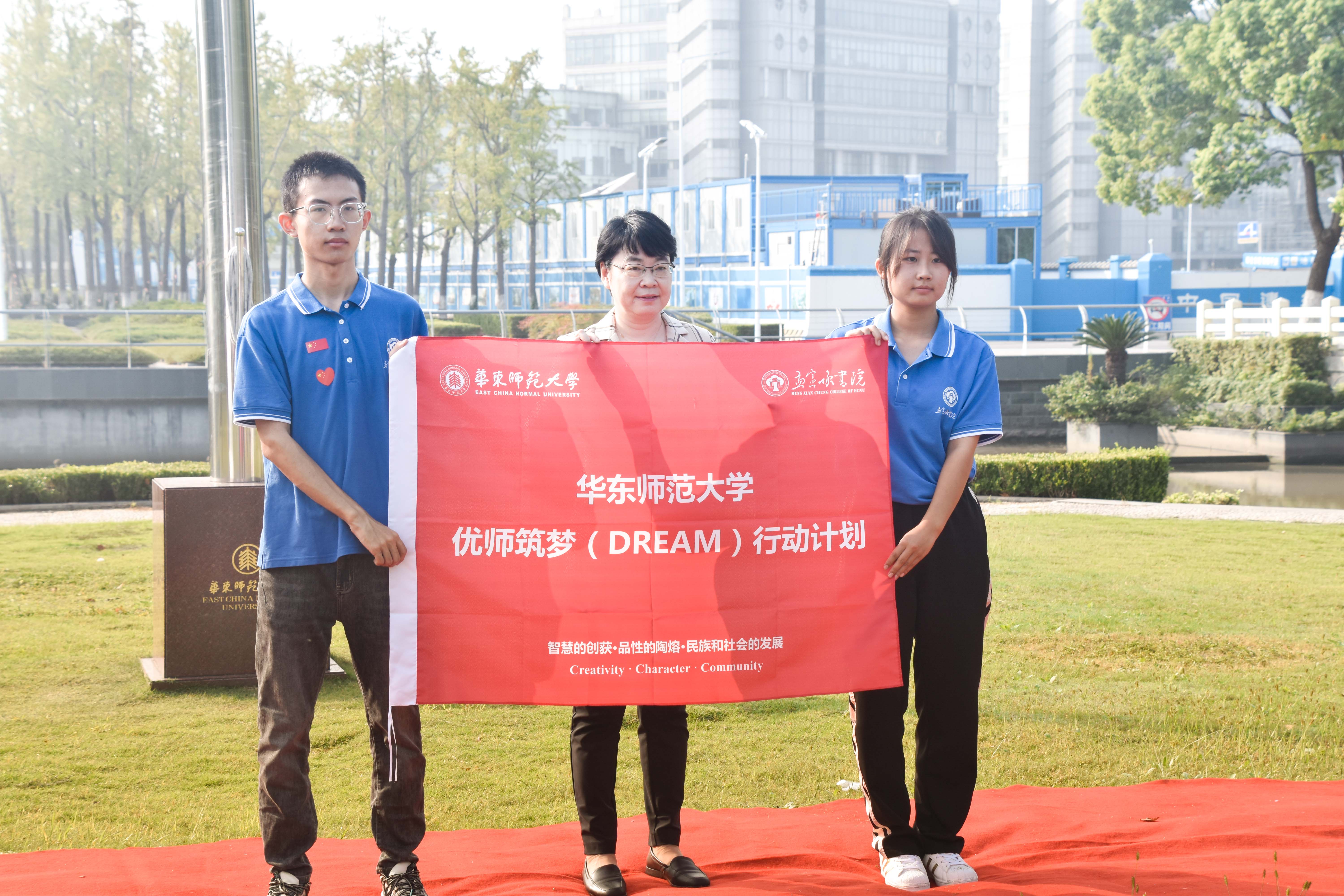 在闵行校区升旗仪式现场,孟宪承书院党委书记兼院长吴薇为2022级“优师计划”师范生授旗,并宣布新一轮“华东师大优师筑梦(DREAM)行动计划”正式启航。