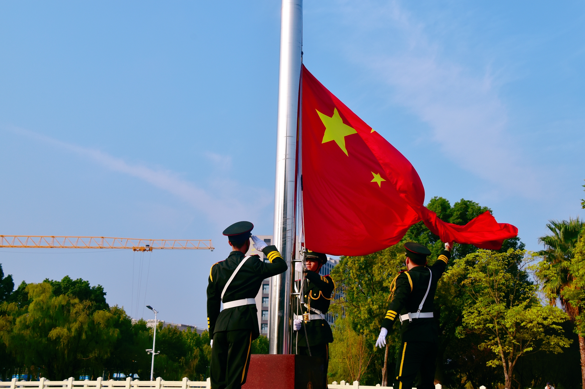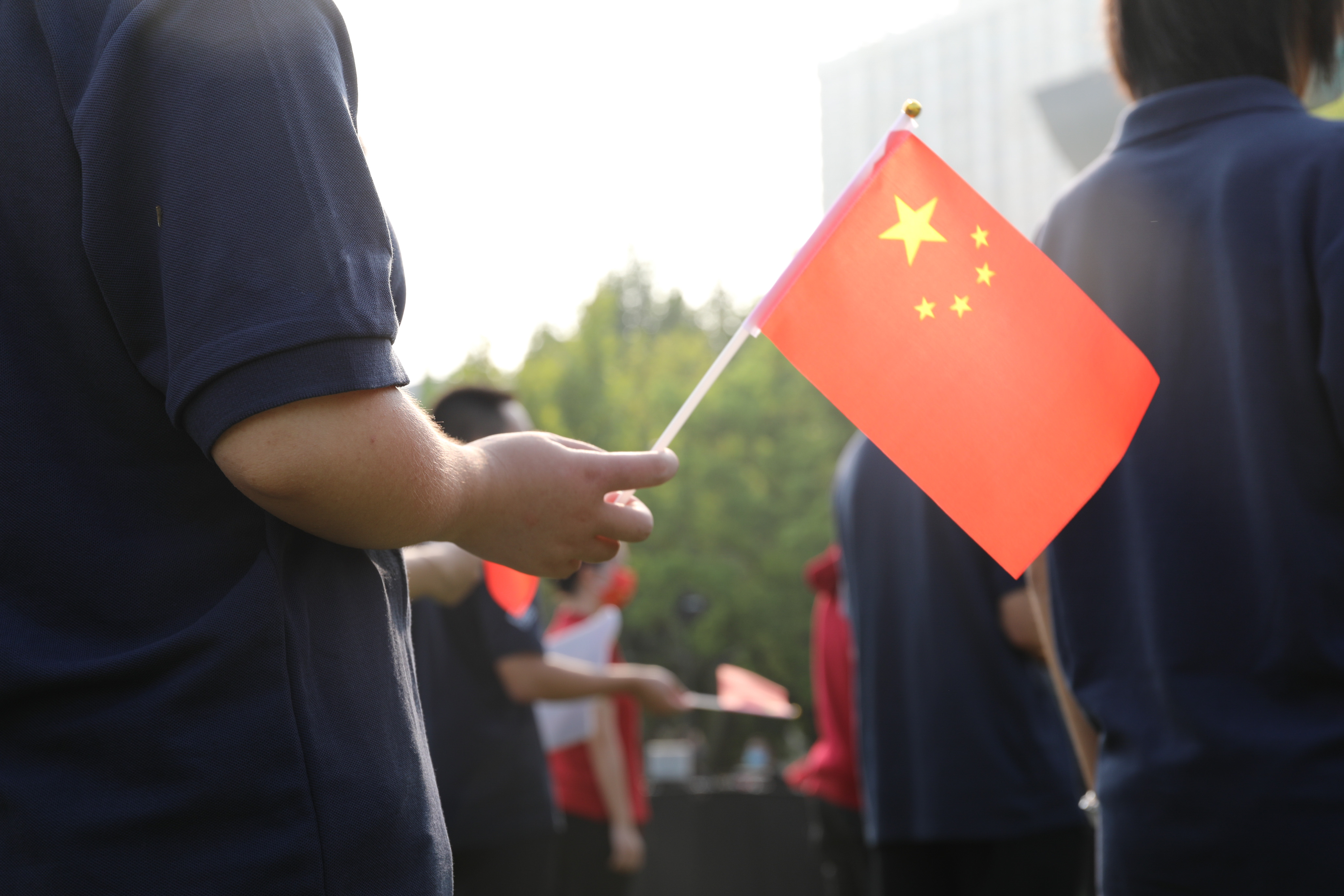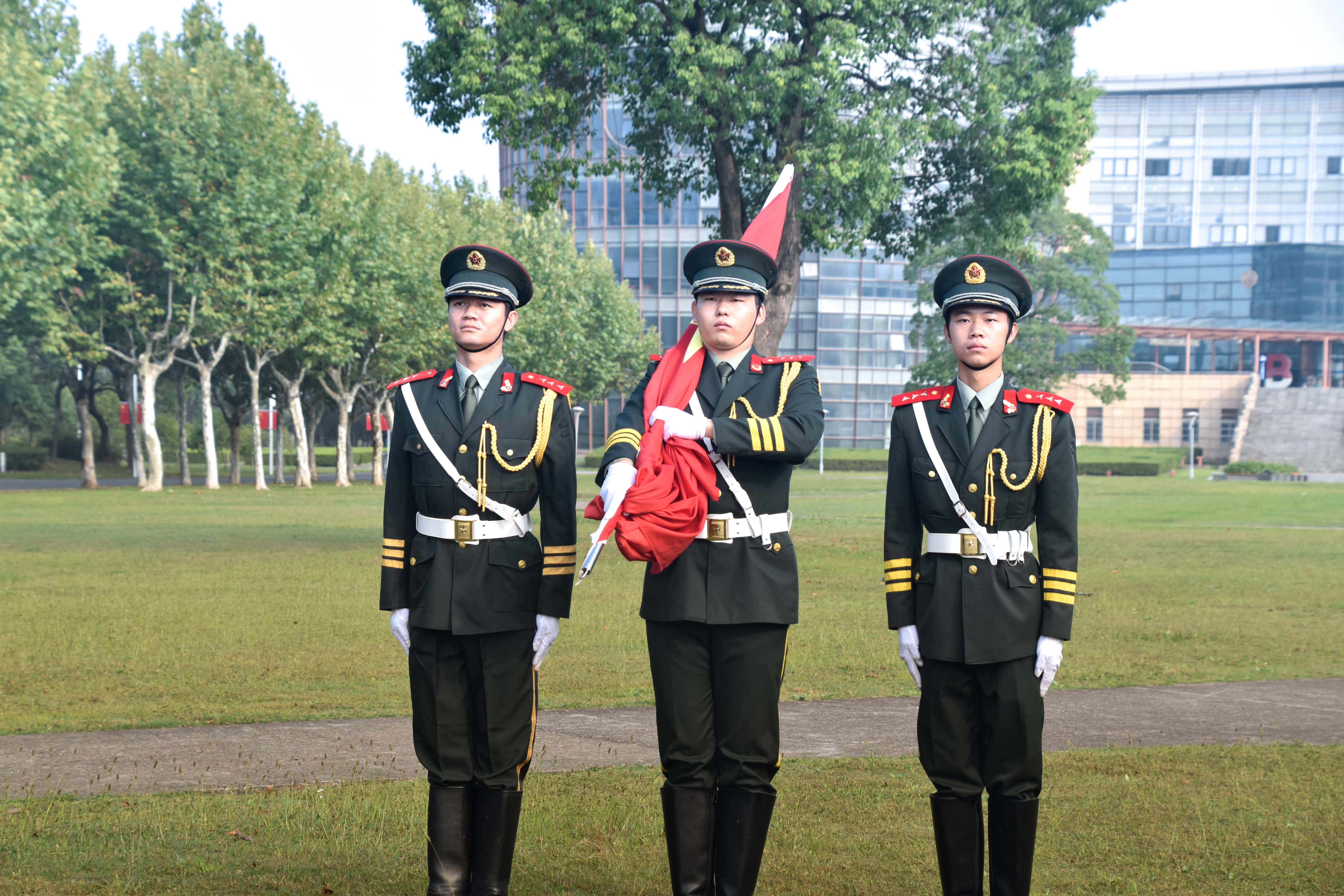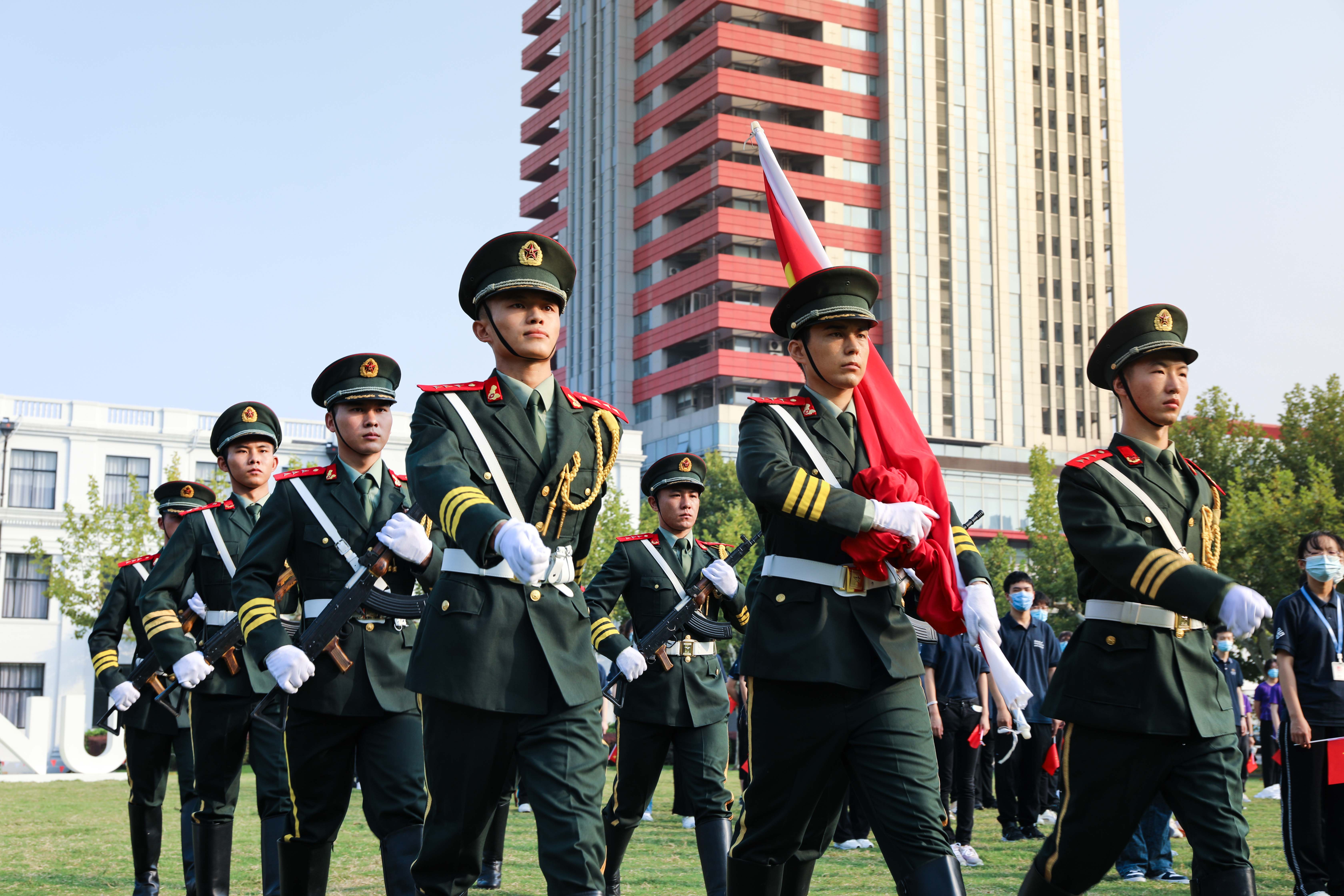 来自教育学部、经济与管理学部、信息学部、孟宪承书院、国际汉语文化学院等450余名师生、“优师计划”师范生共同参加了仪式。踏着激昂的音乐,迈着整齐的步伐,英姿飒爽的学生国旗护卫队以饱满的精神迈入场地,将五星红旗缓缓升上蔚蓝的天空。现场师生高唱国歌、行注目礼,那随风飘扬的五星红旗,是师生们真挚爱国之情的象征与寄托。