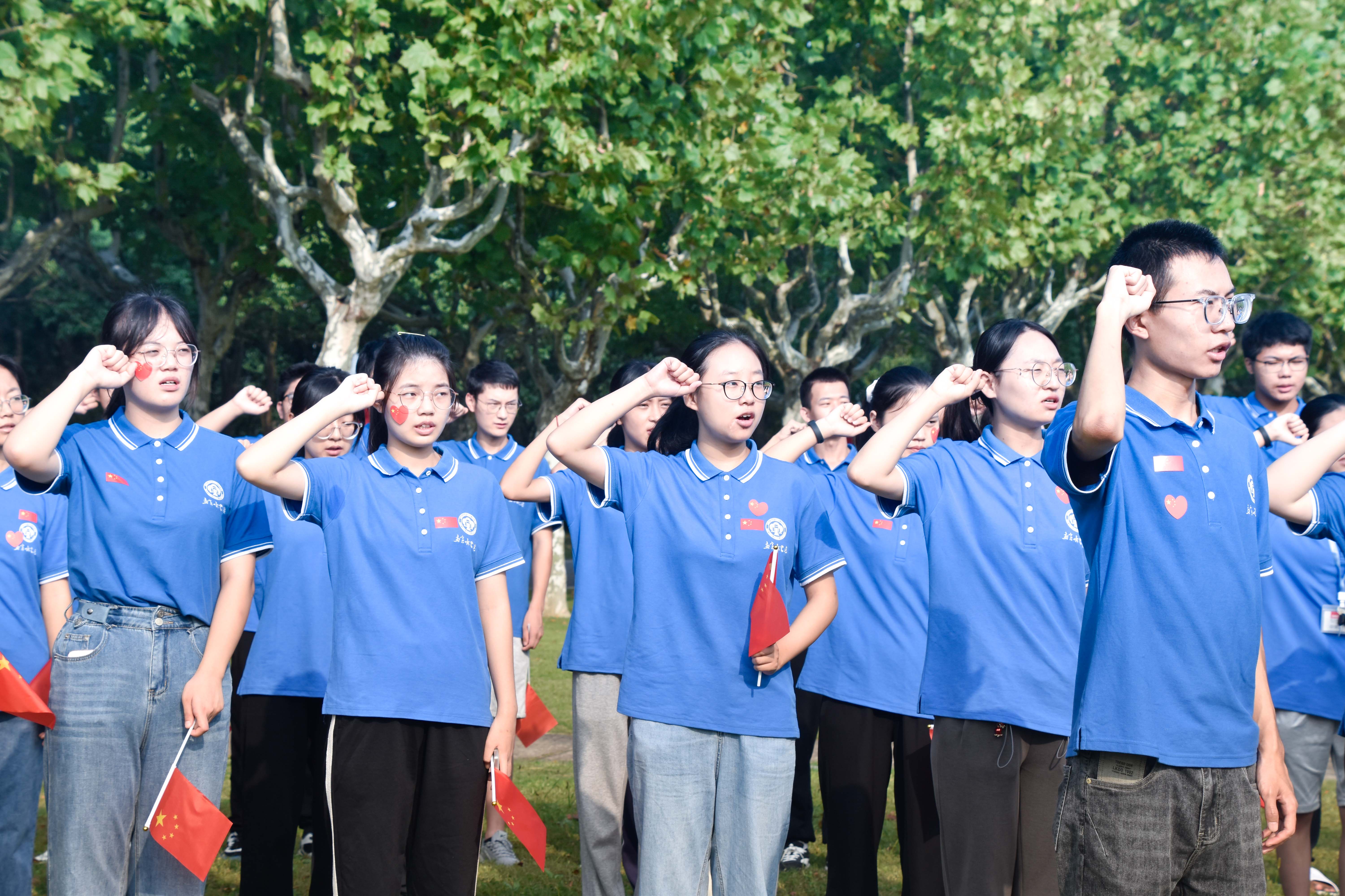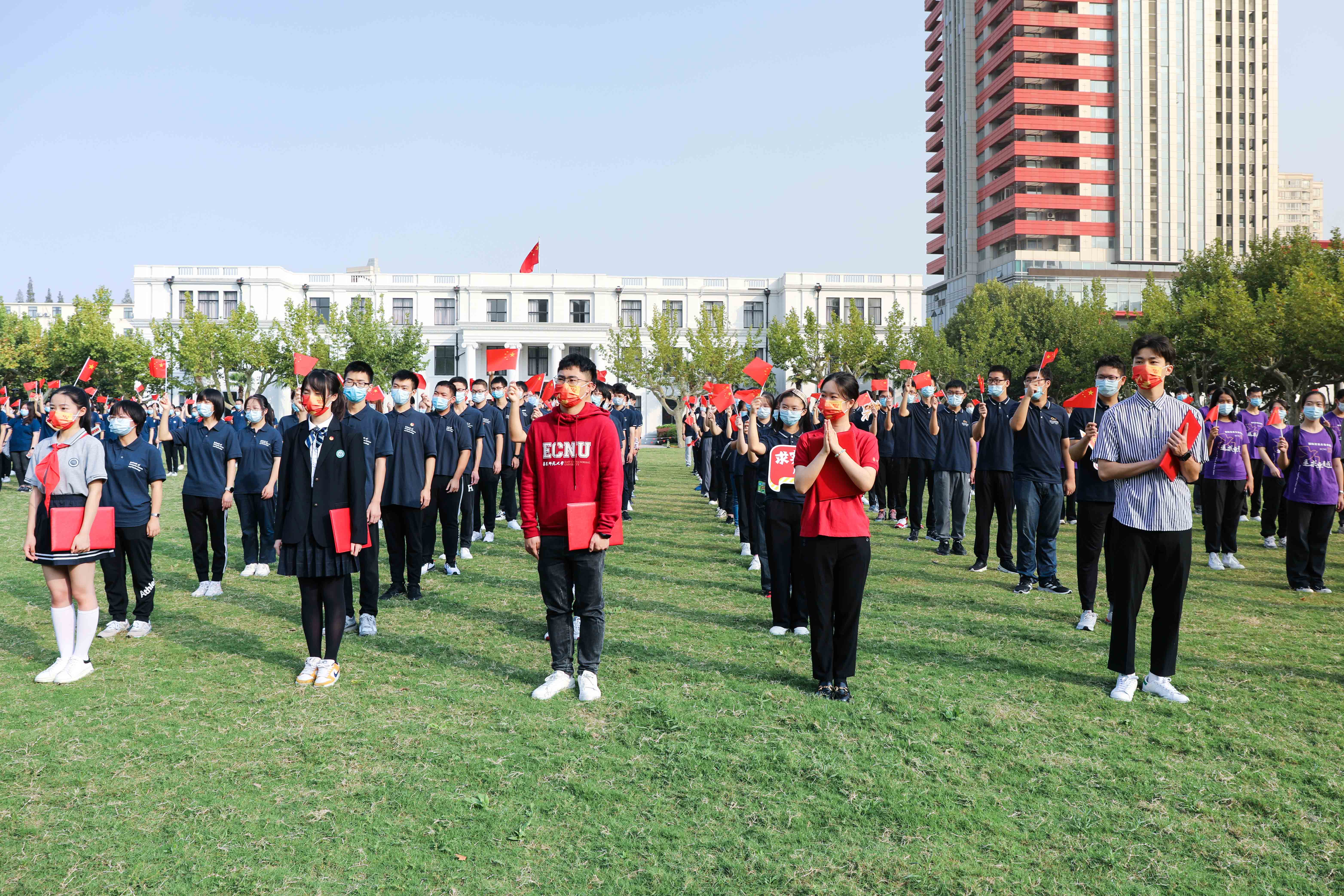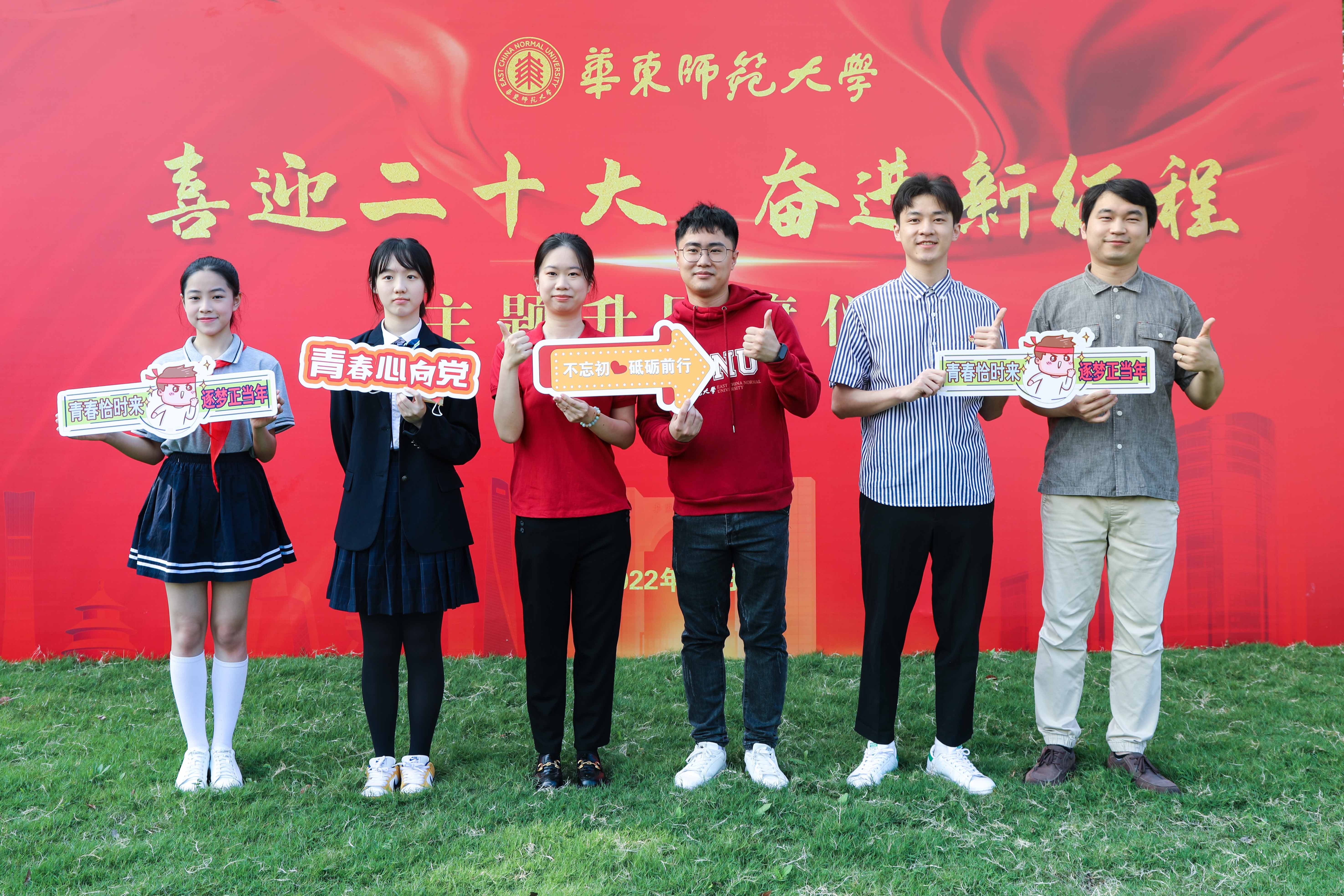 在普陀校区活动现场,来自华东师大附属中学的学生代表、华东师大学生及青年教师代表齐聚国旗下,他们中有少先队员、共青团员、也有中共党员,他们以青春之声告白祖国,以青年之力勇担重任。
