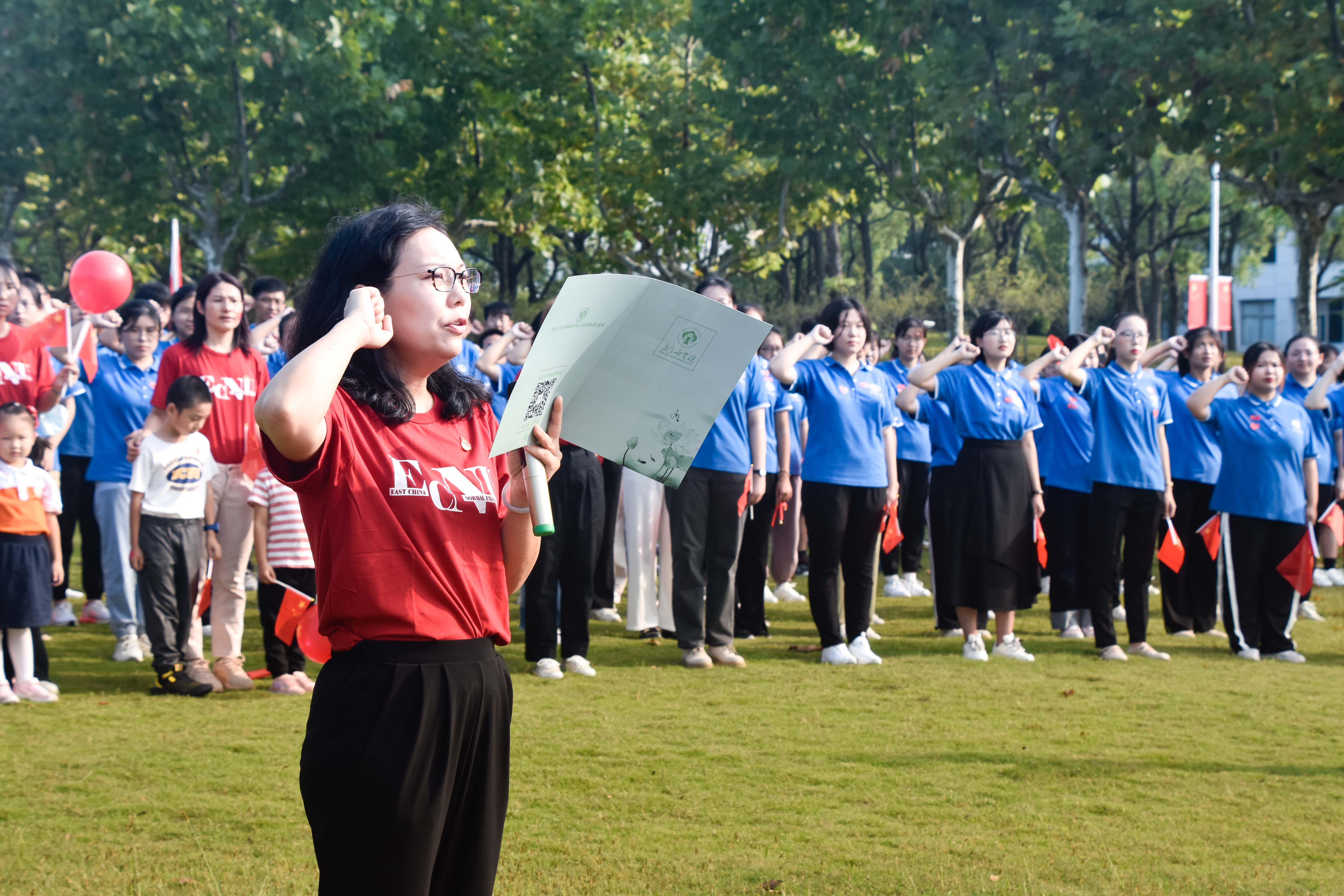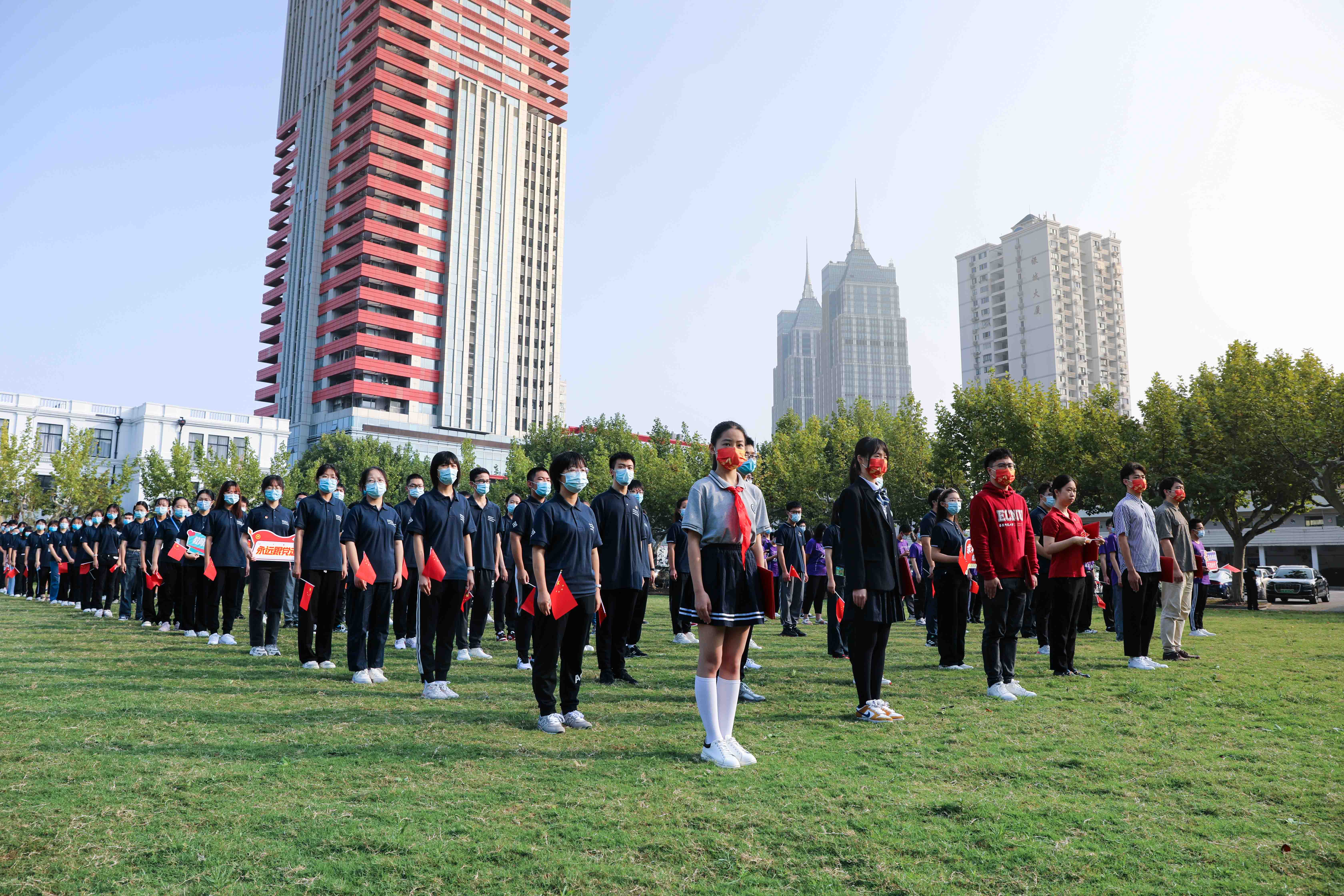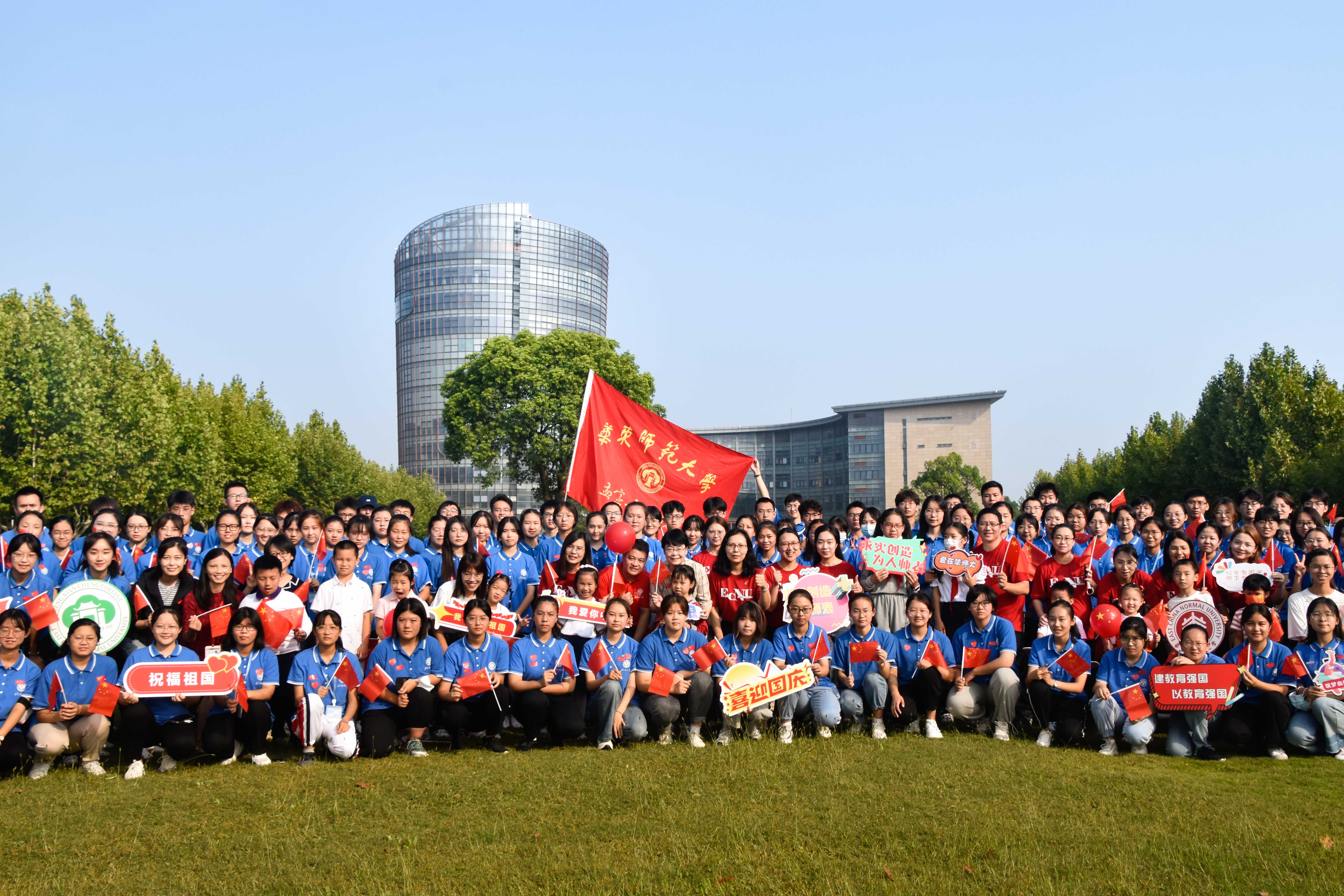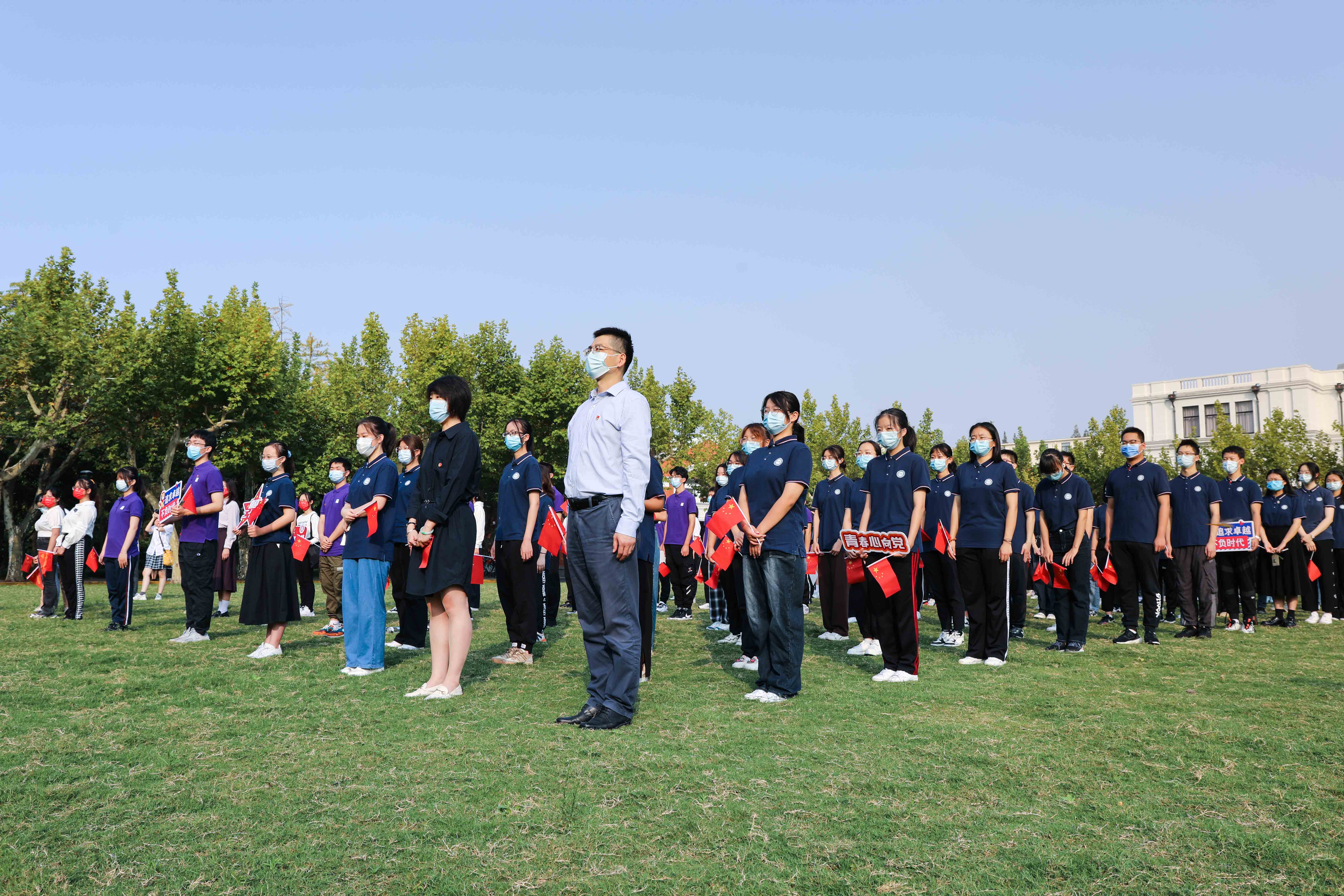 在普陀校区活动现场,来自华东师大附属中学的学生代表、华东师大学生及青年教师代表齐聚国旗下,他们中有少先队员、共青团员、也有中共党员,他们以青春之声告白祖国,以青年之力勇担重任。