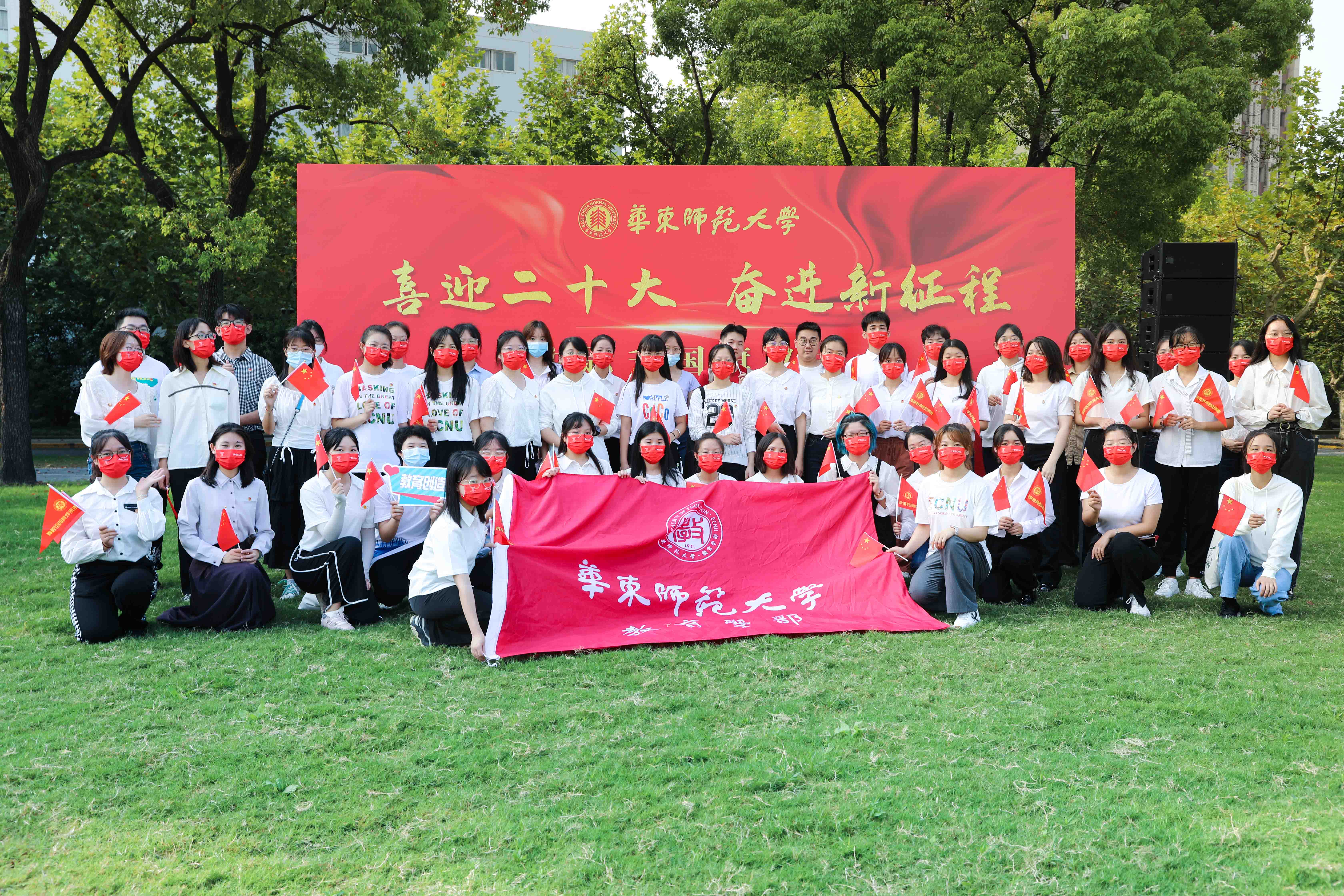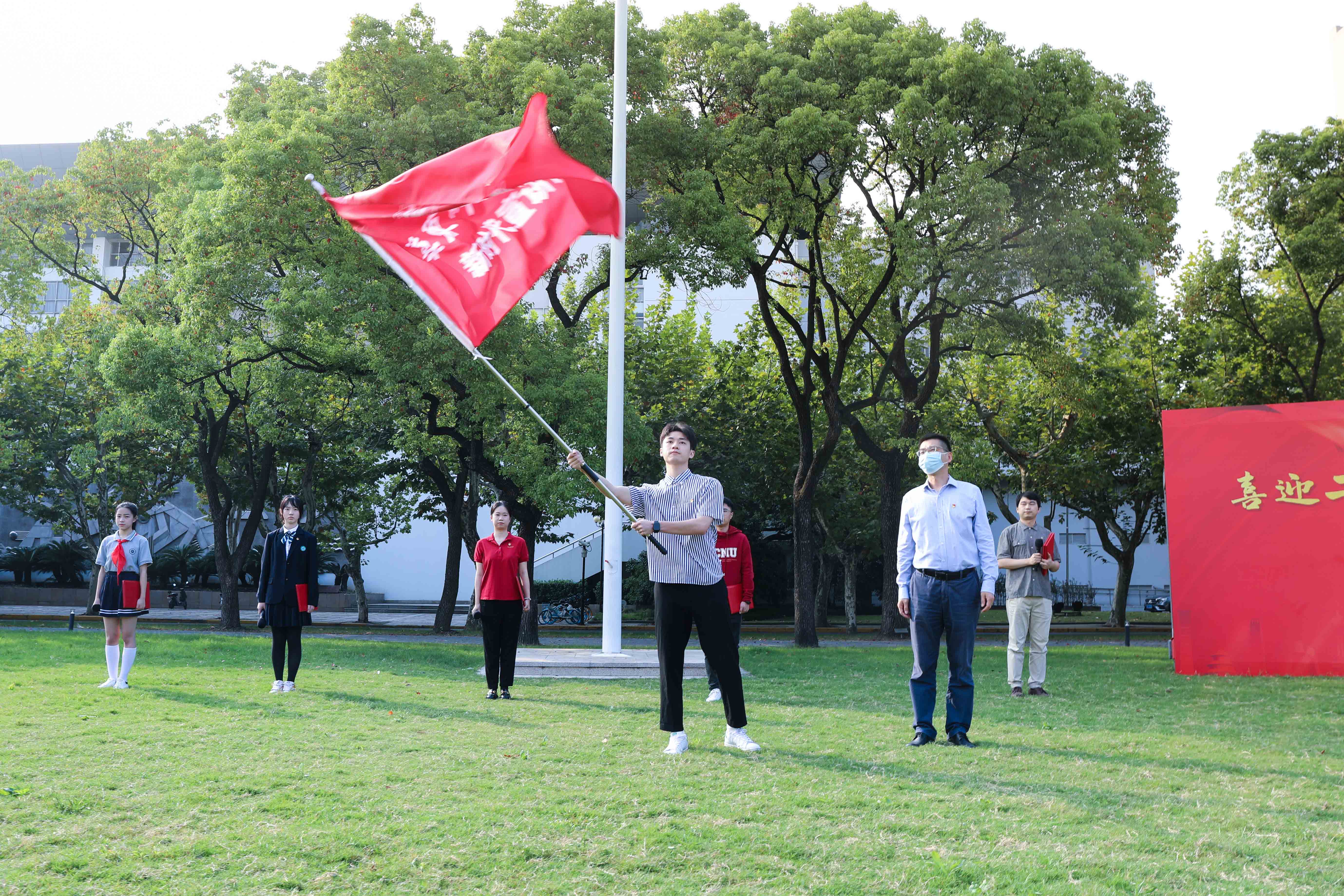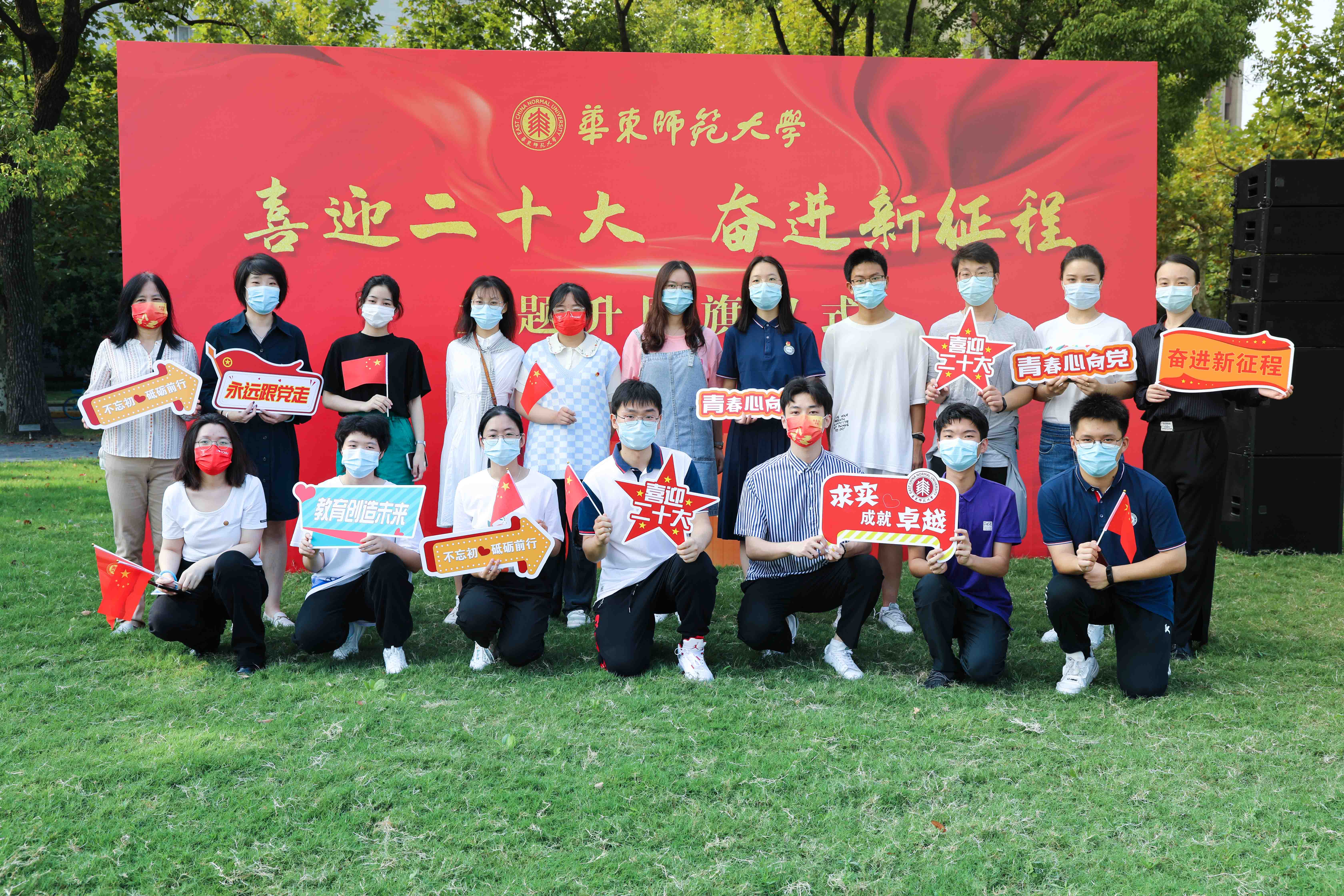 喜迎二十大,以青年之声,传播正能量,让党的思想理论走进校园、走进社区,强化青年的责任与担当。升国旗后,华东师大“新时代宣讲团”出征仪式举行,校党委常委、副校长顾红亮为“新时代宣讲团”授旗。