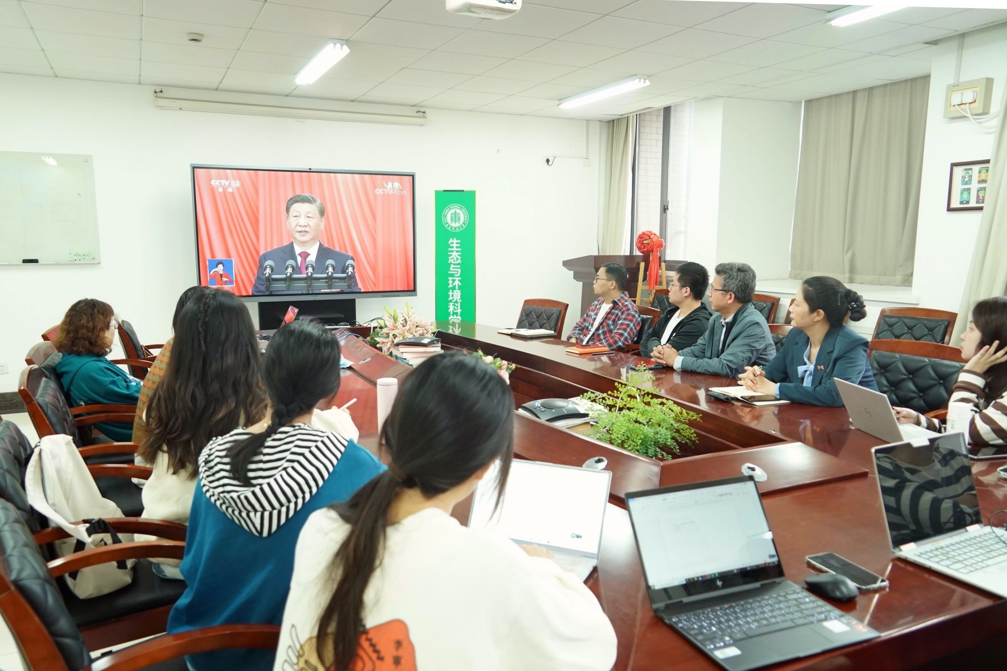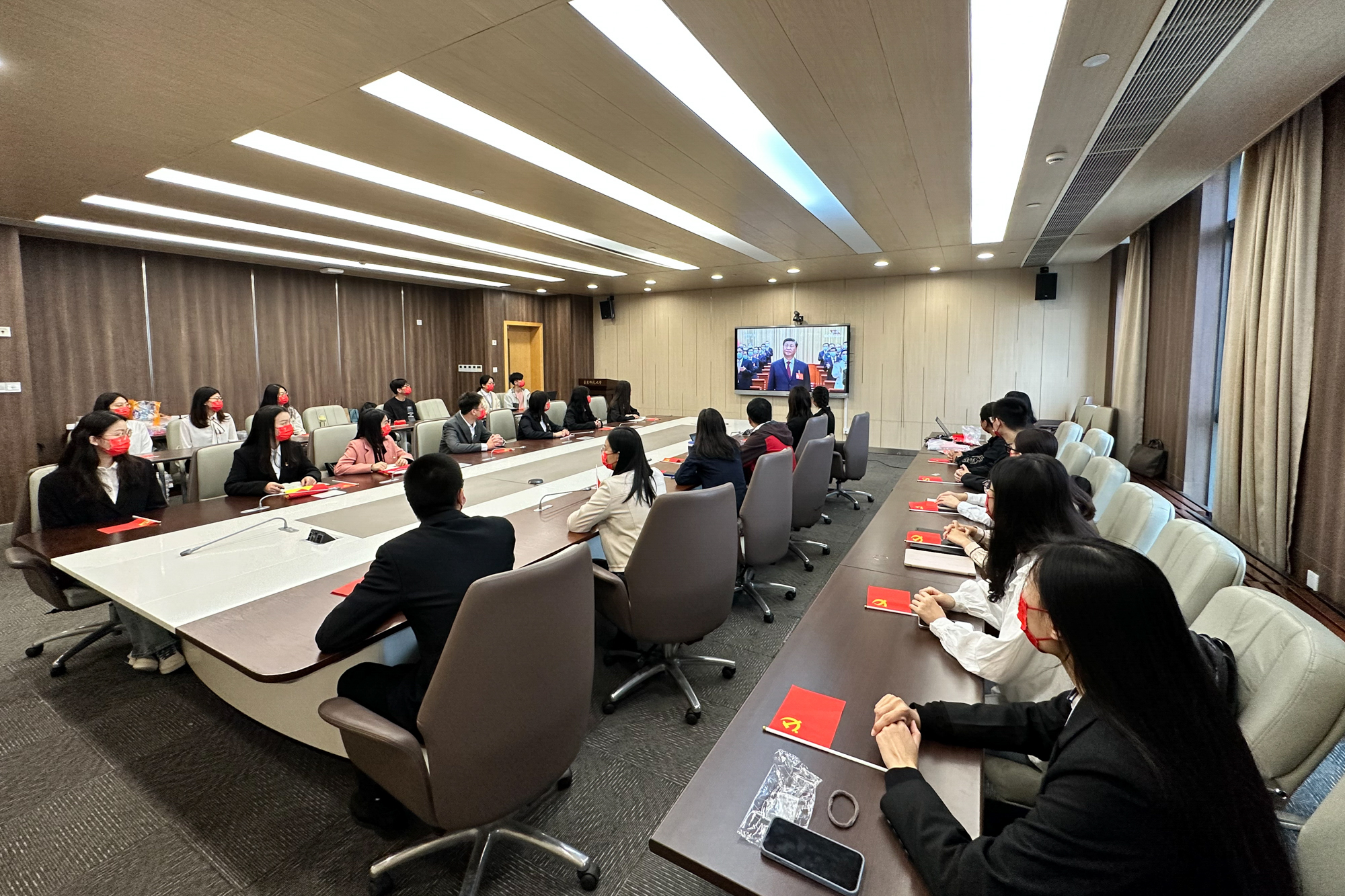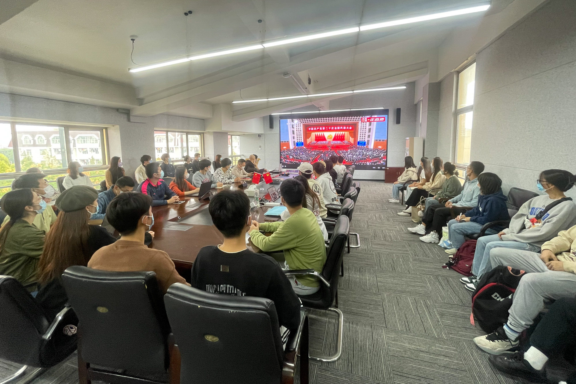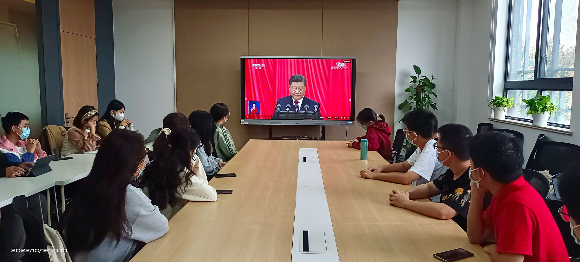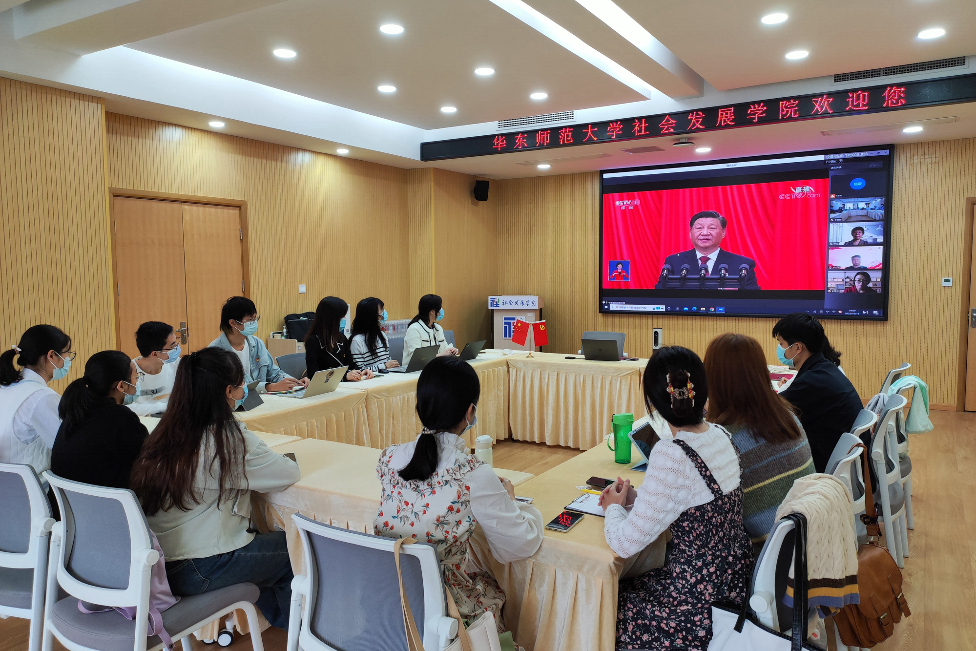 华东师大两校区红旗招展,“热烈庆祝党的二十大胜利召开”的展板分外鲜明,上午10点不到,师生们早早来到屏幕前收看开幕会盛况。华东师大师生或在各会议室、办公室、实验室等公共空间,或在宿舍、家中收看开幕会盛况,一些院系党组织通过开设网络会议室集中收看,关注热议总书记报告。在总书记的报告过程中,收看现场不时自发响起热烈的掌声。