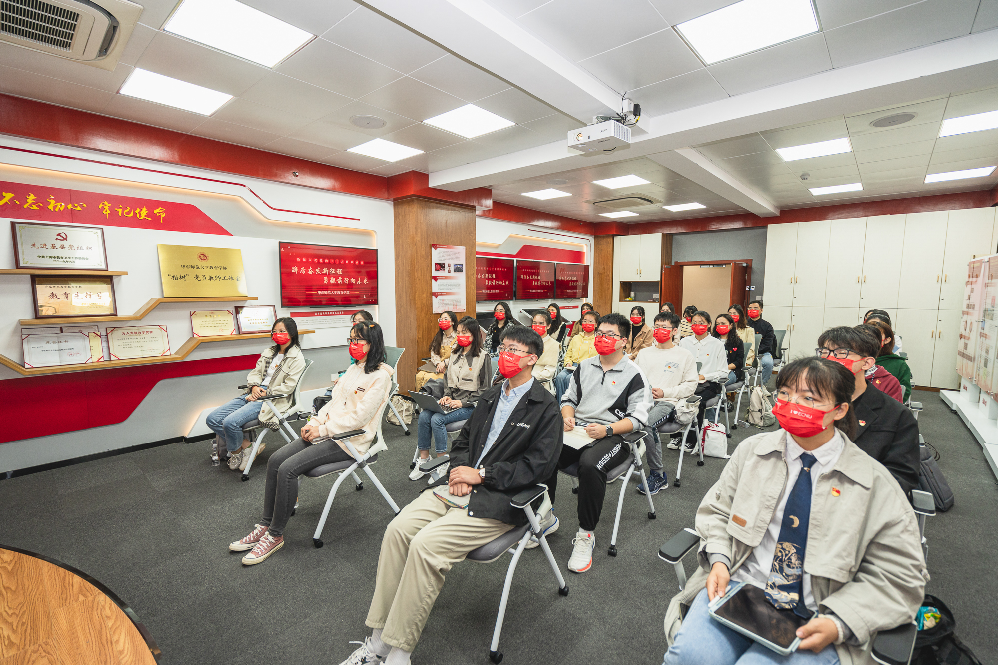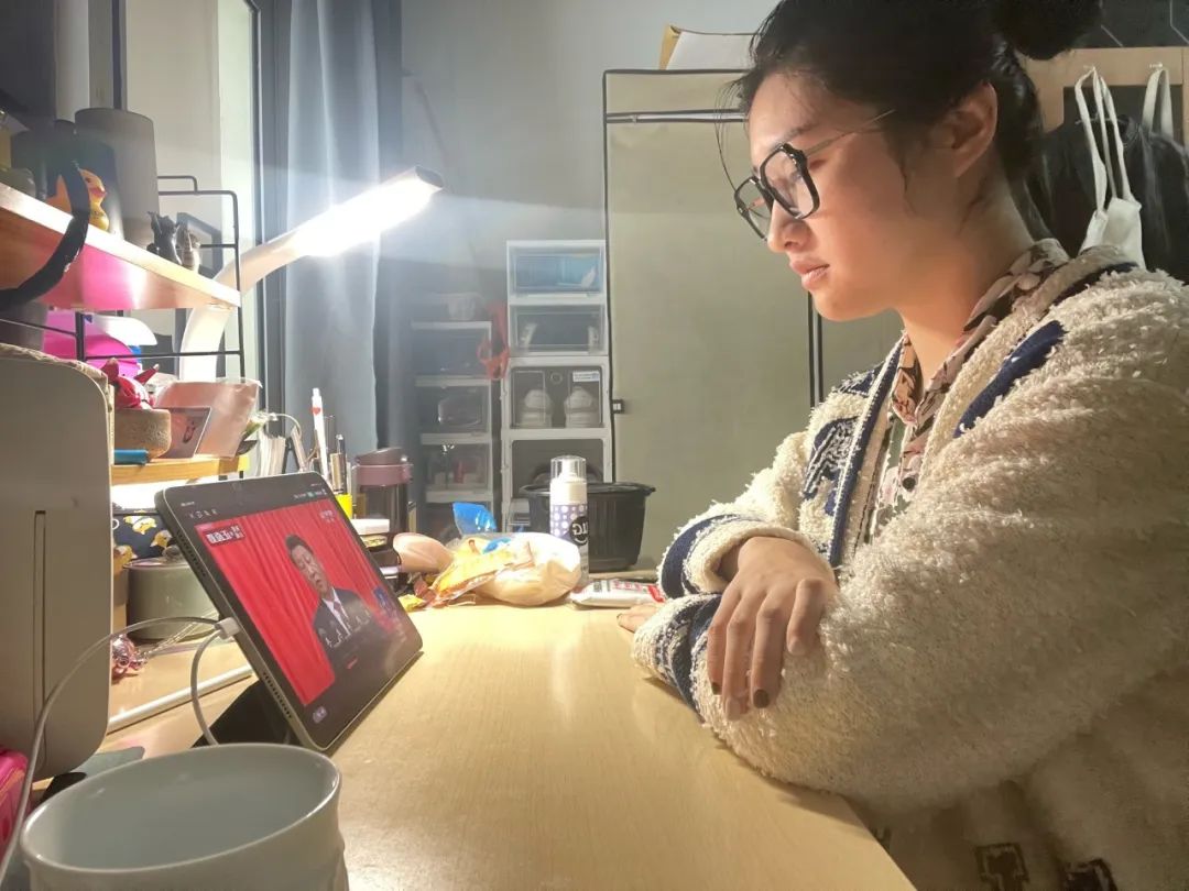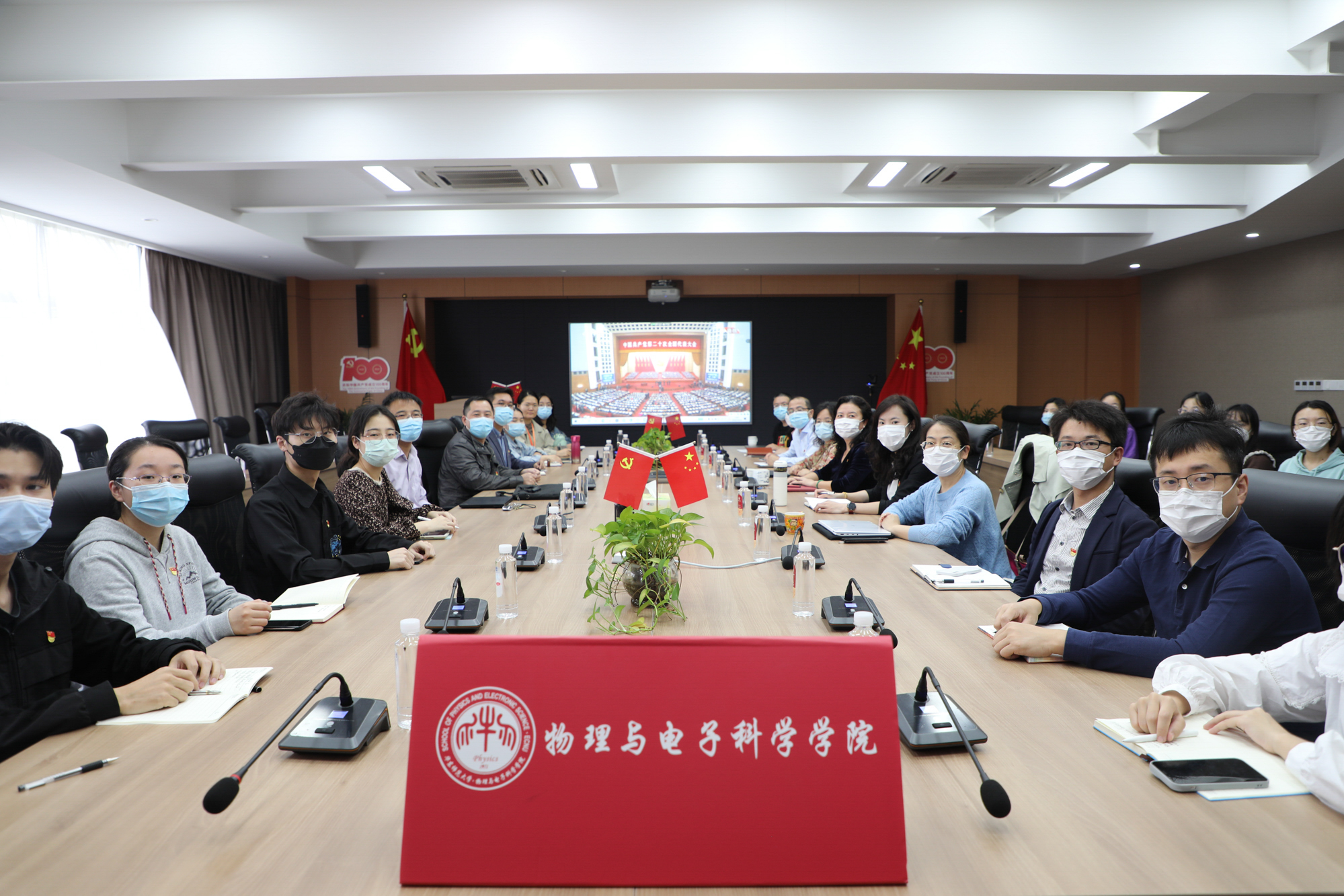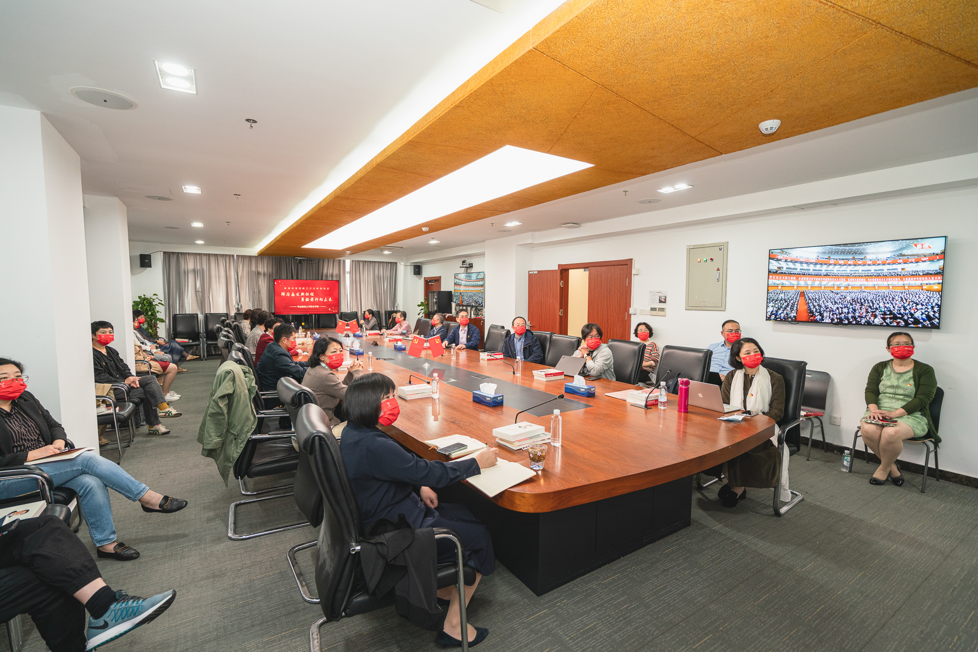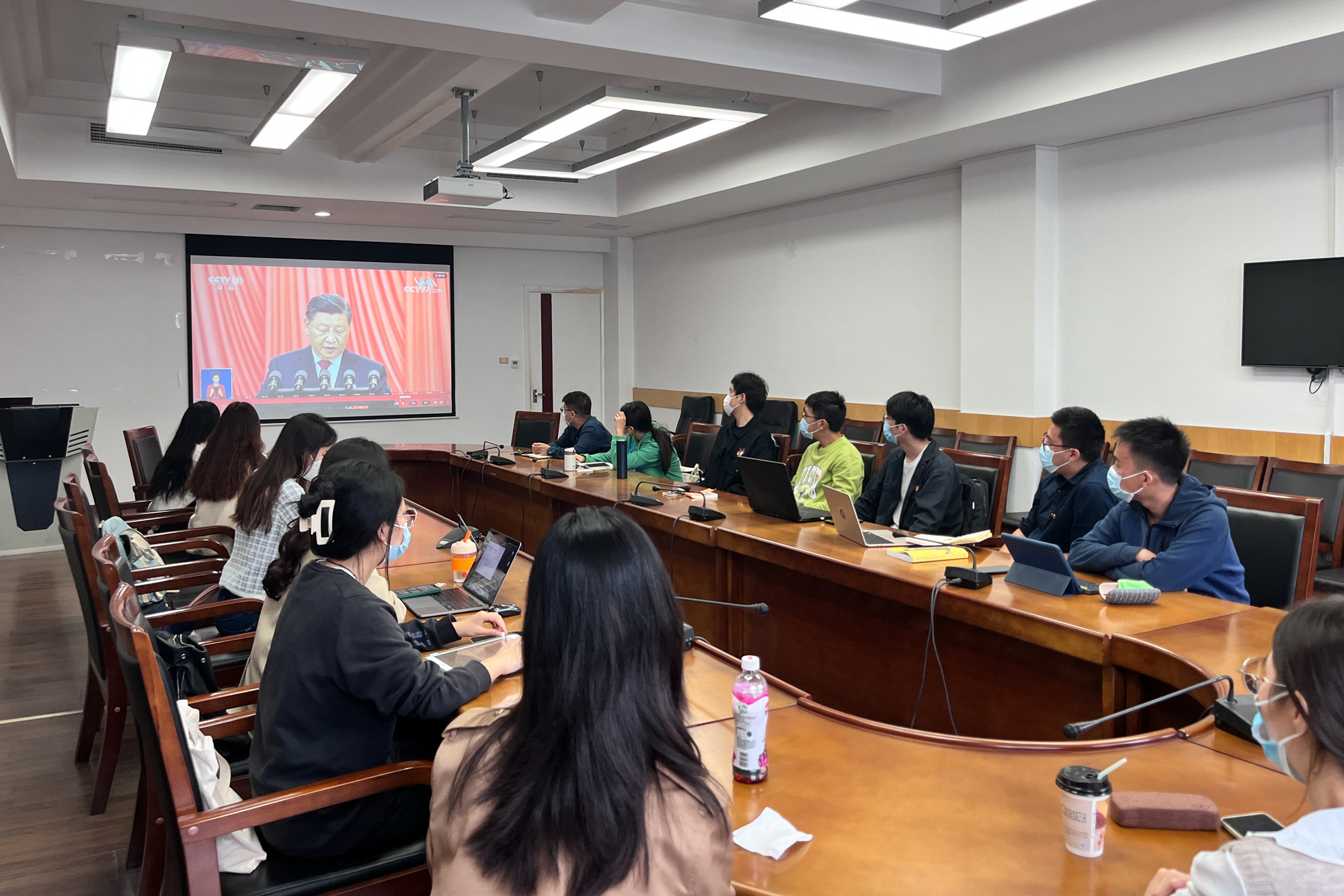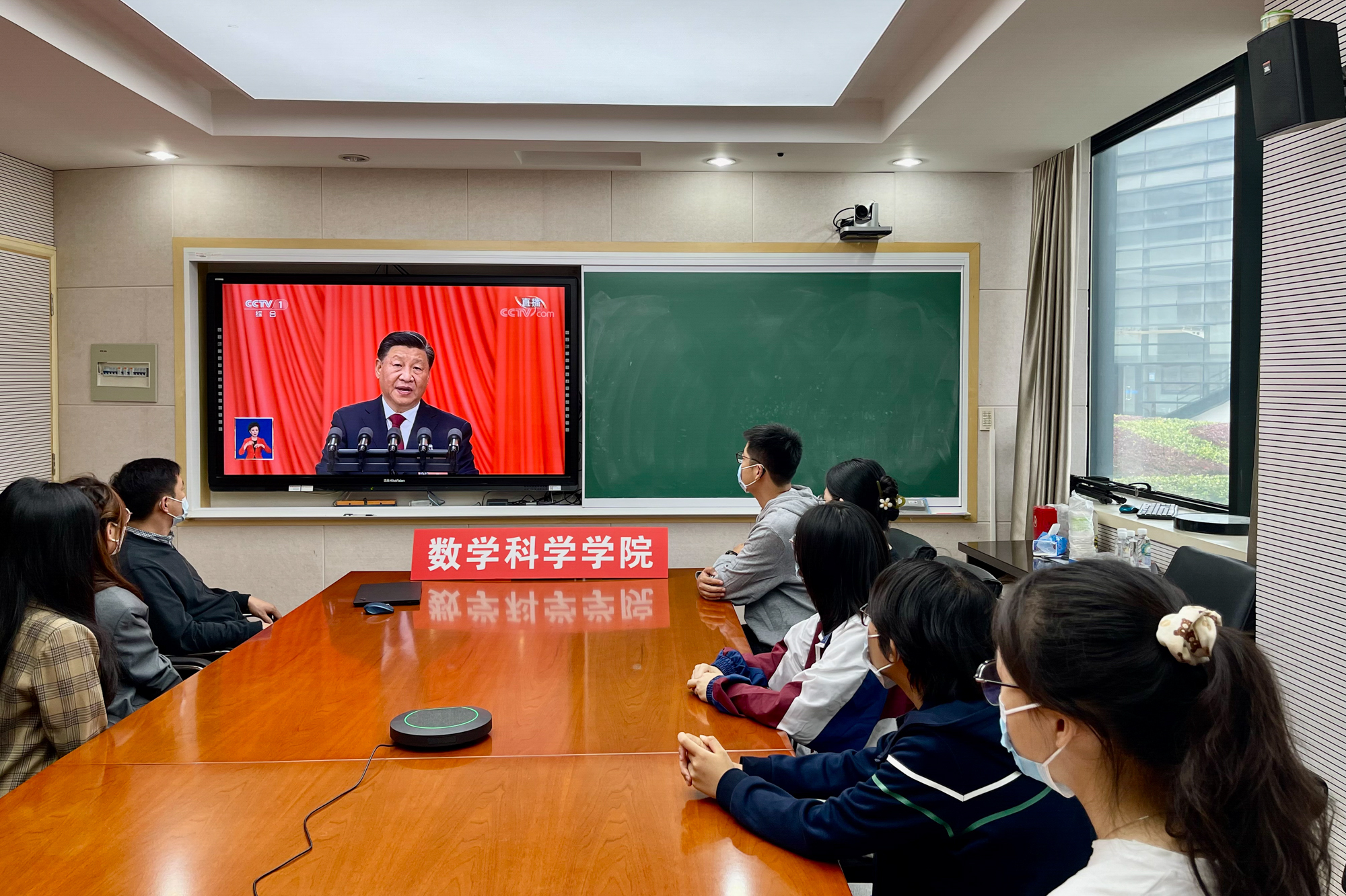 华东师大两校区红旗招展,“热烈庆祝党的二十大胜利召开”的展板分外鲜明,上午10点不到,师生们早早来到屏幕前收看开幕会盛况。华东师大师生或在各会议室、办公室、实验室等公共空间,或在宿舍、家中收看开幕会盛况,一些院系党组织通过开设网络会议室集中收看,关注热议总书记报告。在总书记的报告过程中,收看现场不时自发响起热烈的掌声。