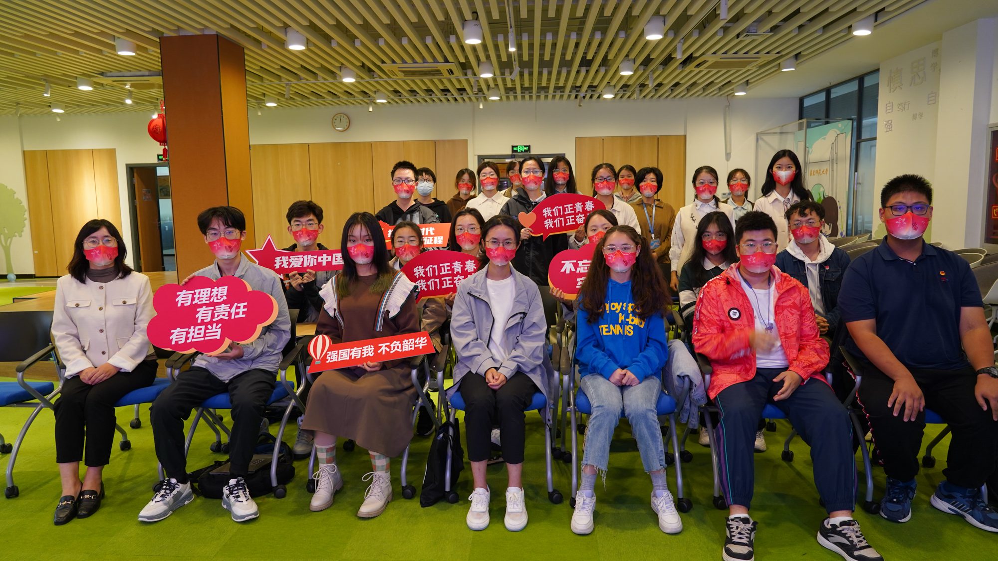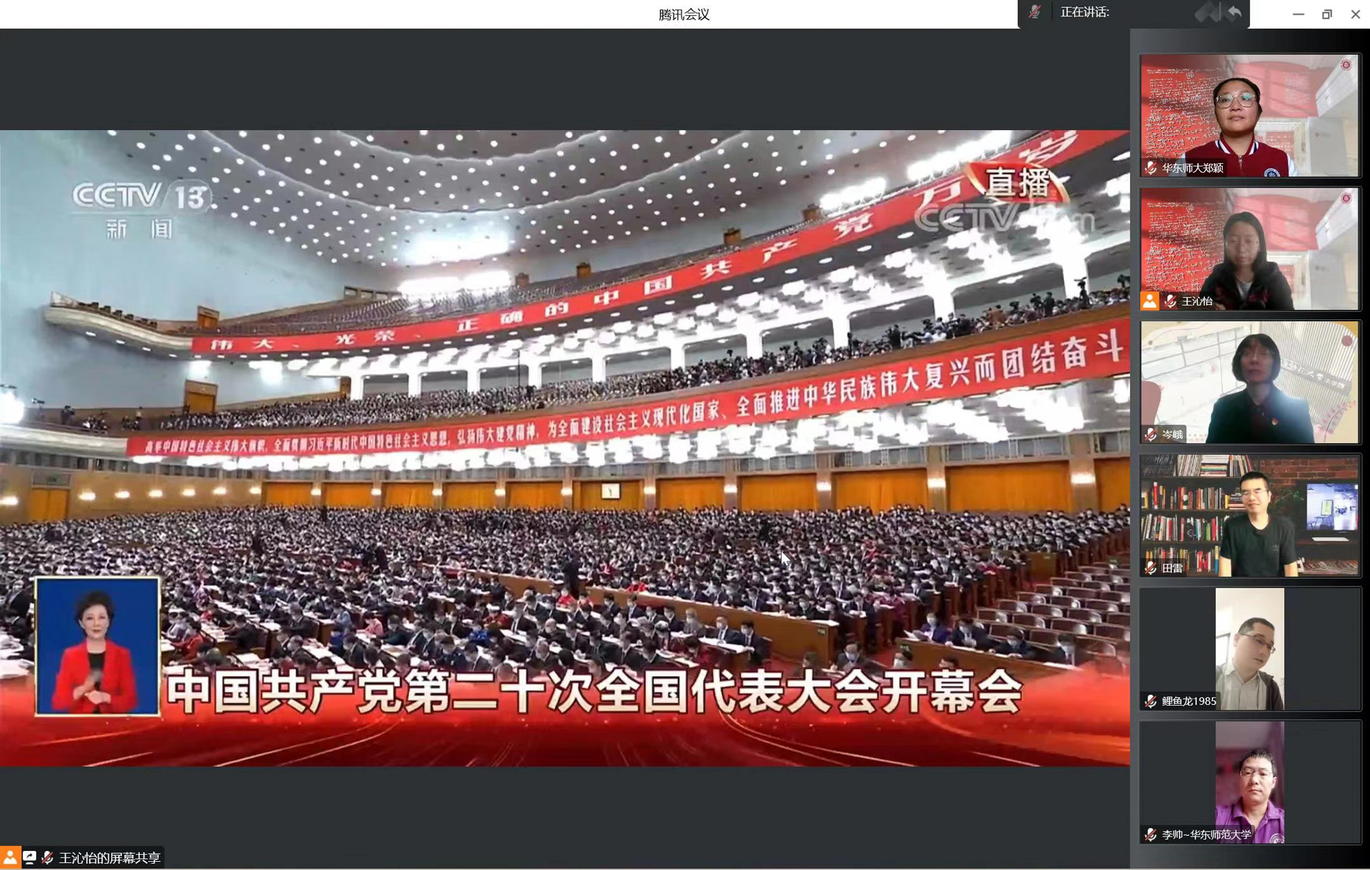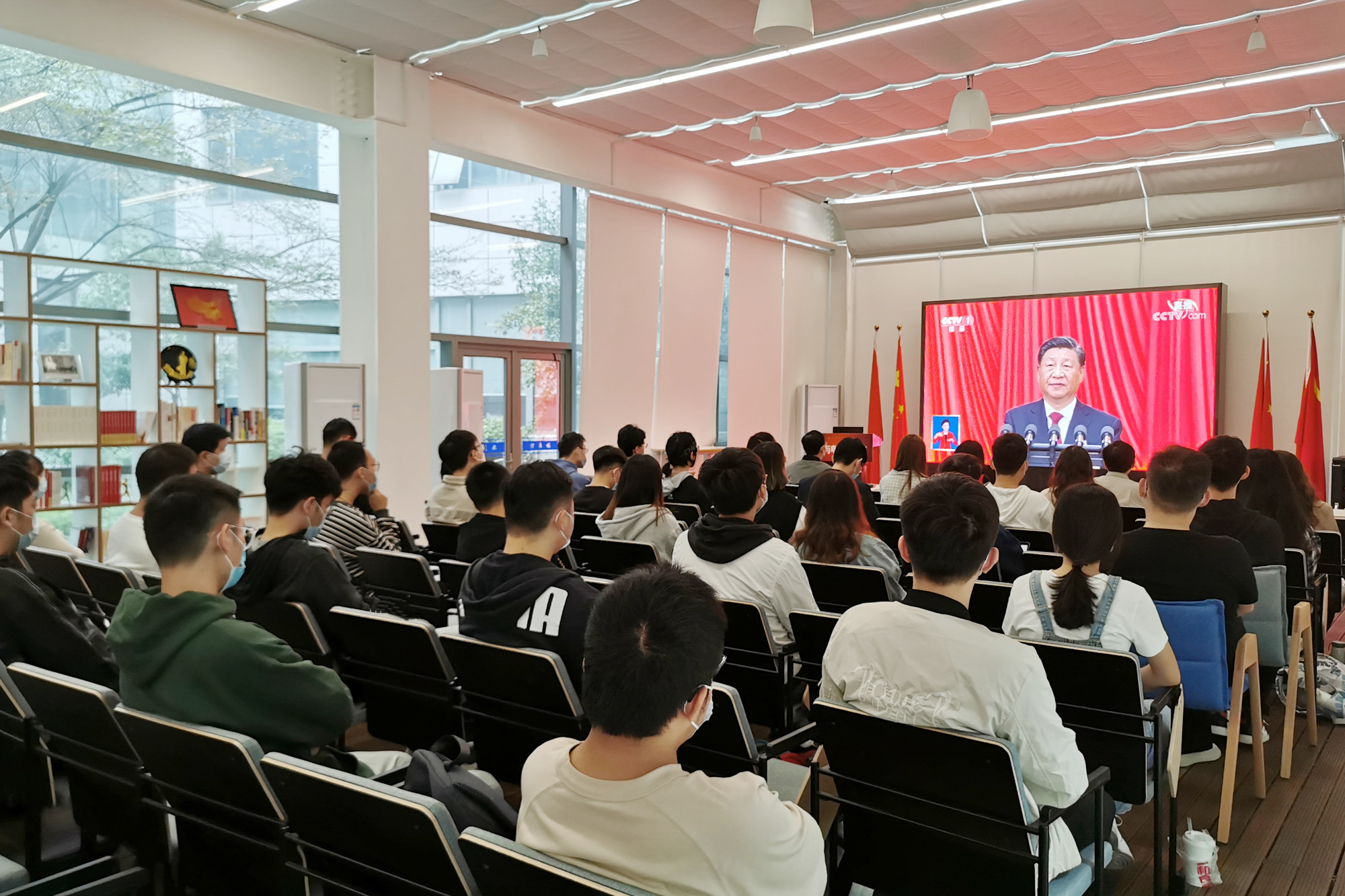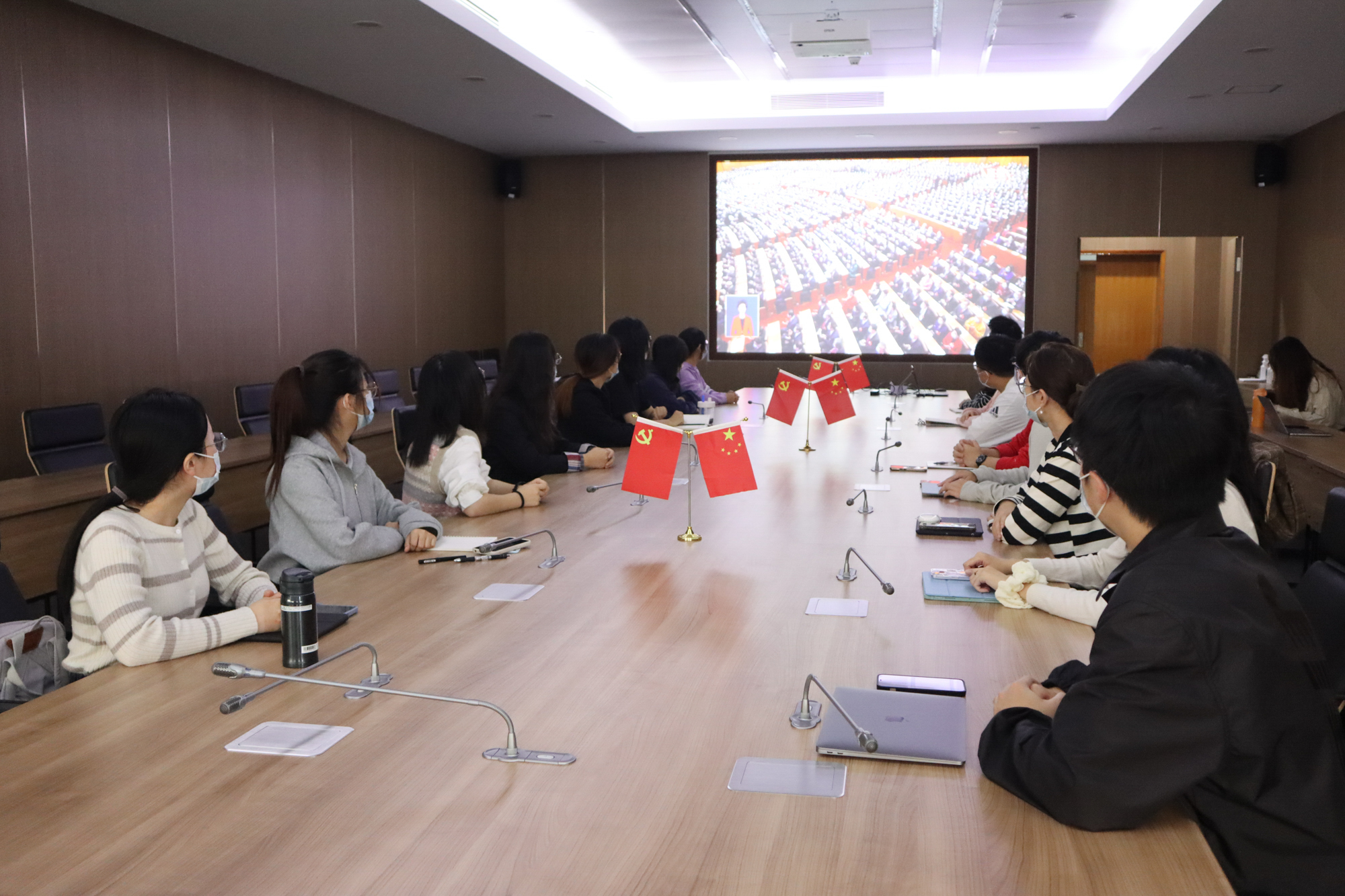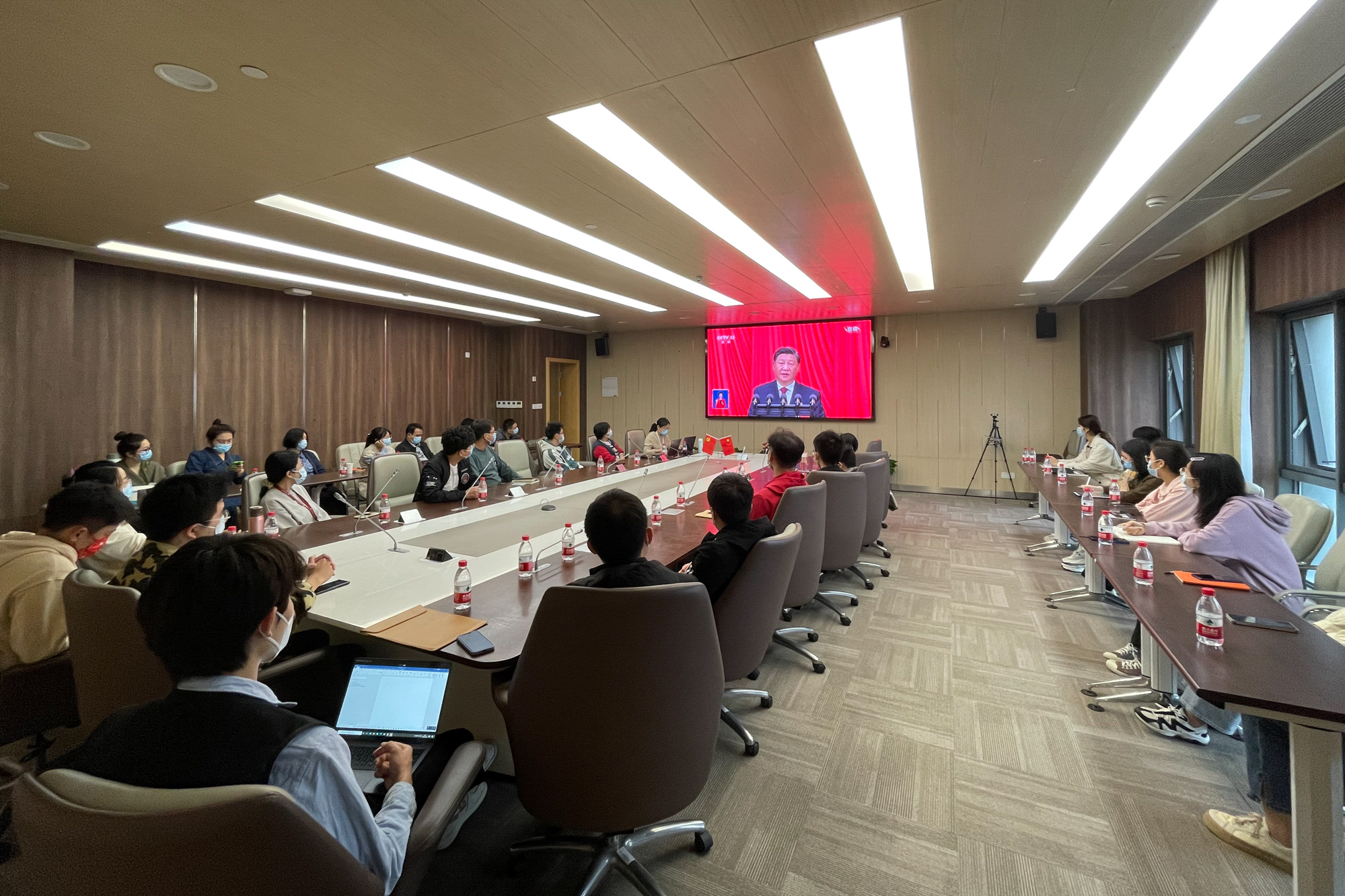 华东师大两校区红旗招展,“热烈庆祝党的二十大胜利召开”的展板分外鲜明,上午10点不到,师生们早早来到屏幕前收看开幕会盛况。华东师大师生或在各会议室、办公室、实验室等公共空间,或在宿舍、家中收看开幕会盛况,一些院系党组织通过开设网络会议室集中收看,关注热议总书记报告。在总书记的报告过程中,收看现场不时自发响起热烈的掌声。