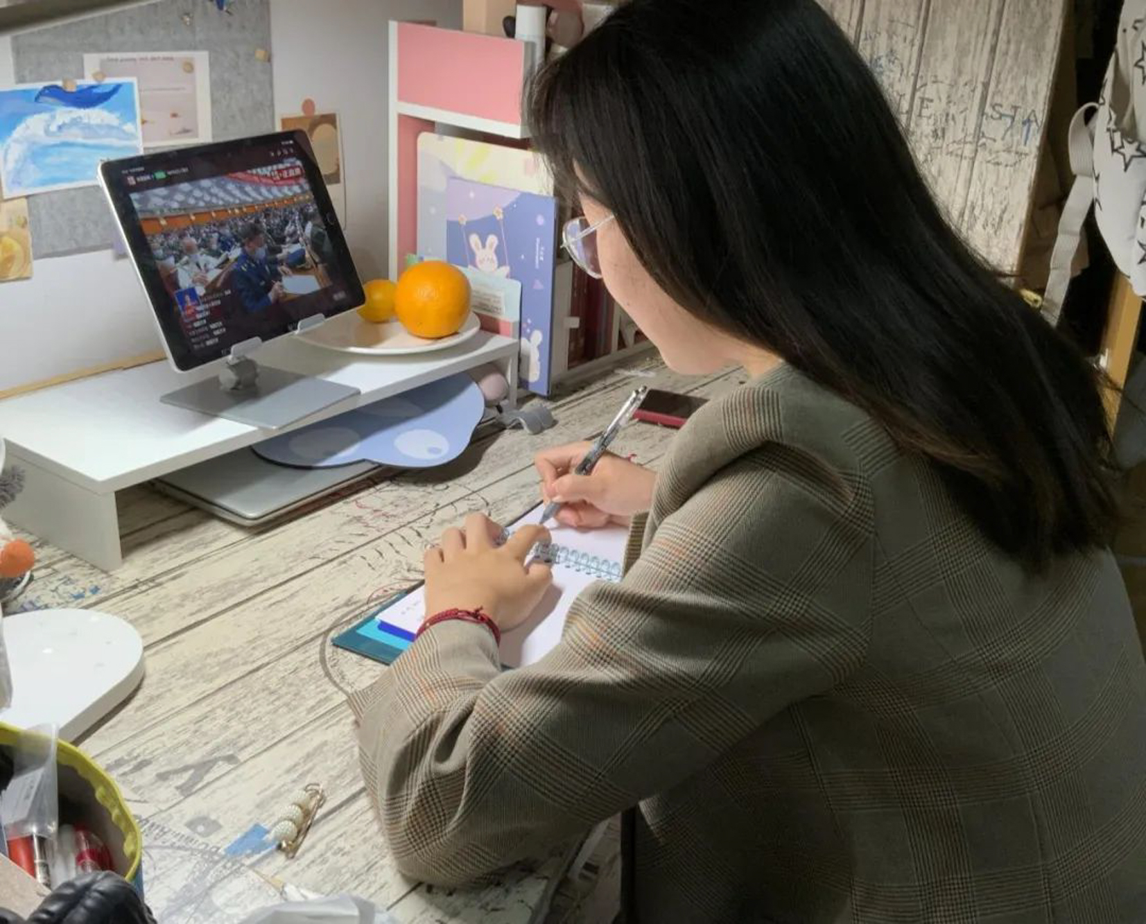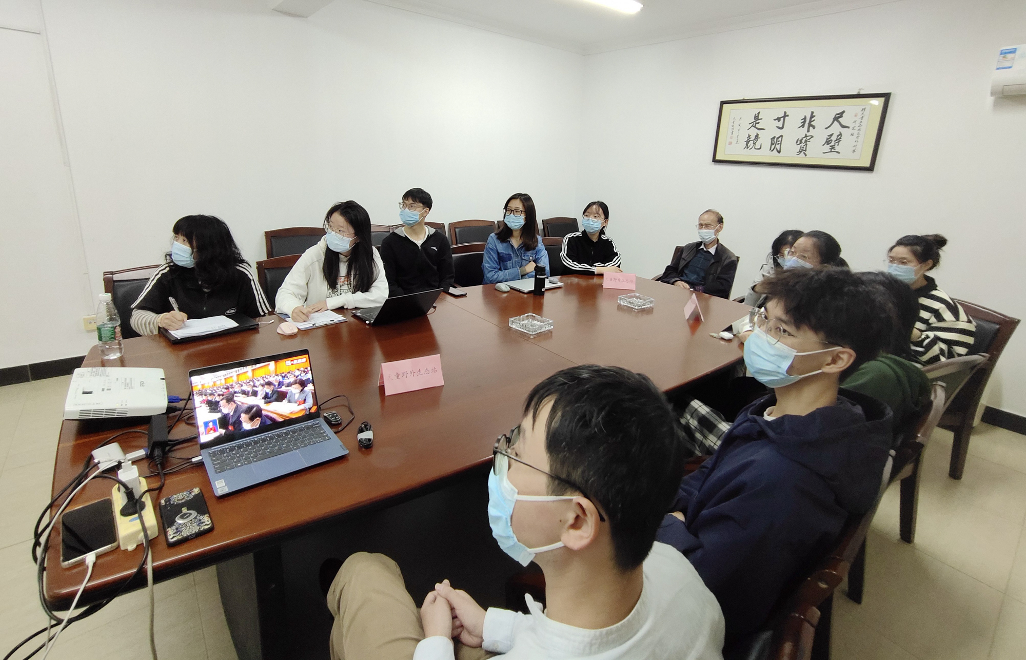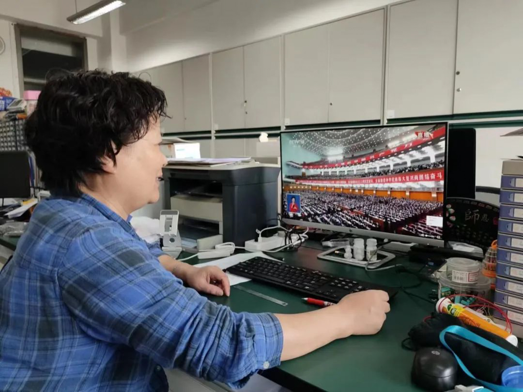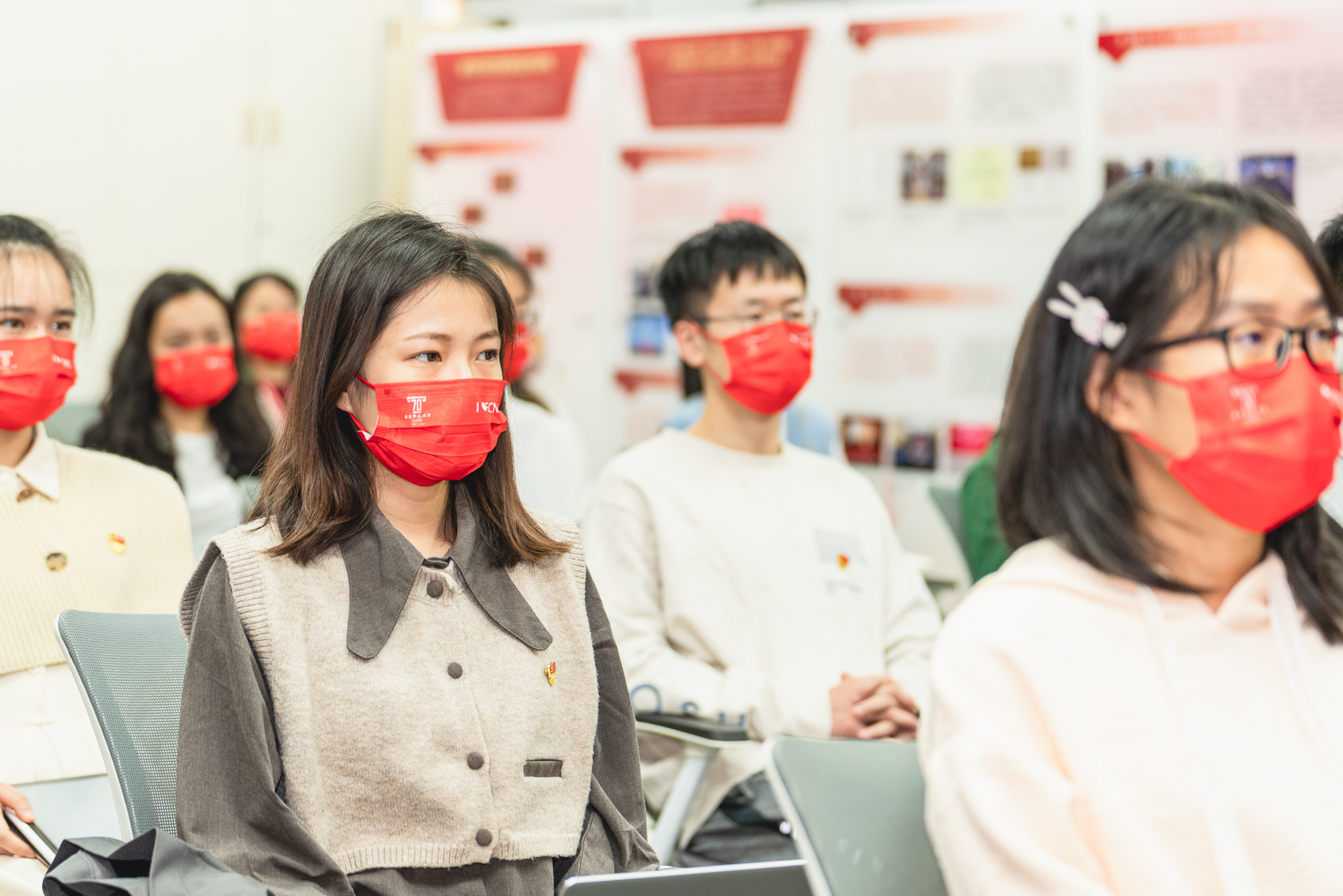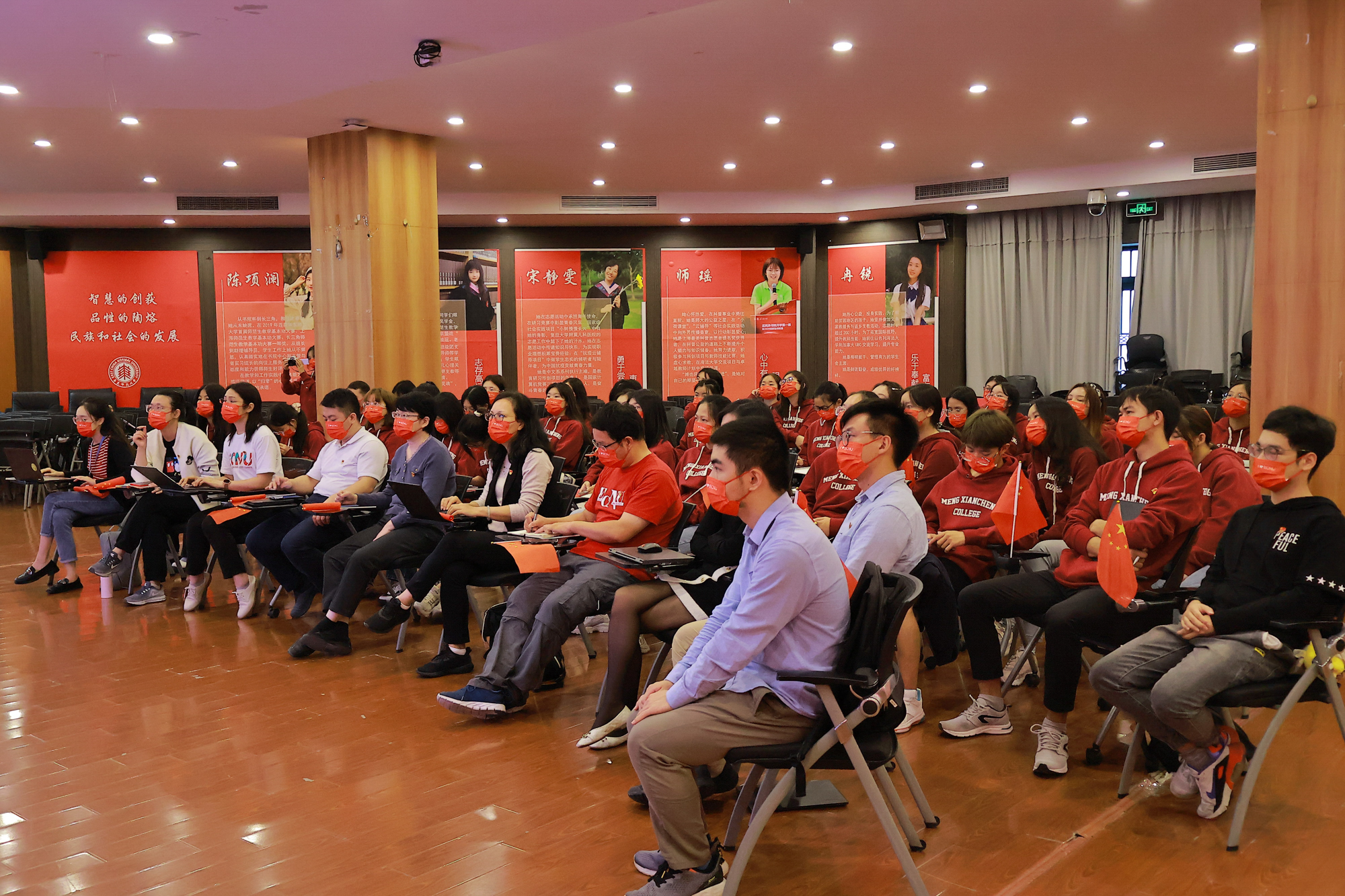 华东师大两校区红旗招展,“热烈庆祝党的二十大胜利召开”的展板分外鲜明,上午10点不到,师生们早早来到屏幕前收看开幕会盛况。华东师大师生或在各会议室、办公室、实验室等公共空间,或在宿舍、家中收看开幕会盛况,一些院系党组织通过开设网络会议室集中收看,关注热议总书记报告。在总书记的报告过程中,收看现场不时自发响起热烈的掌声。