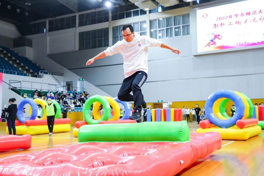 今天普陀校区的体育馆也热力十足,2022年华东师大教职工趣味运动会在此举行,六百余名教职工同场竞技、欢乐无限。在障碍闯关赛、陆地龙舟、雷霆战鼓三大趣味项目中,共决出一等奖14个、二等奖22个、三等奖39个。教职工广播操比赛将后续通过视频参赛的形式在线上举行。