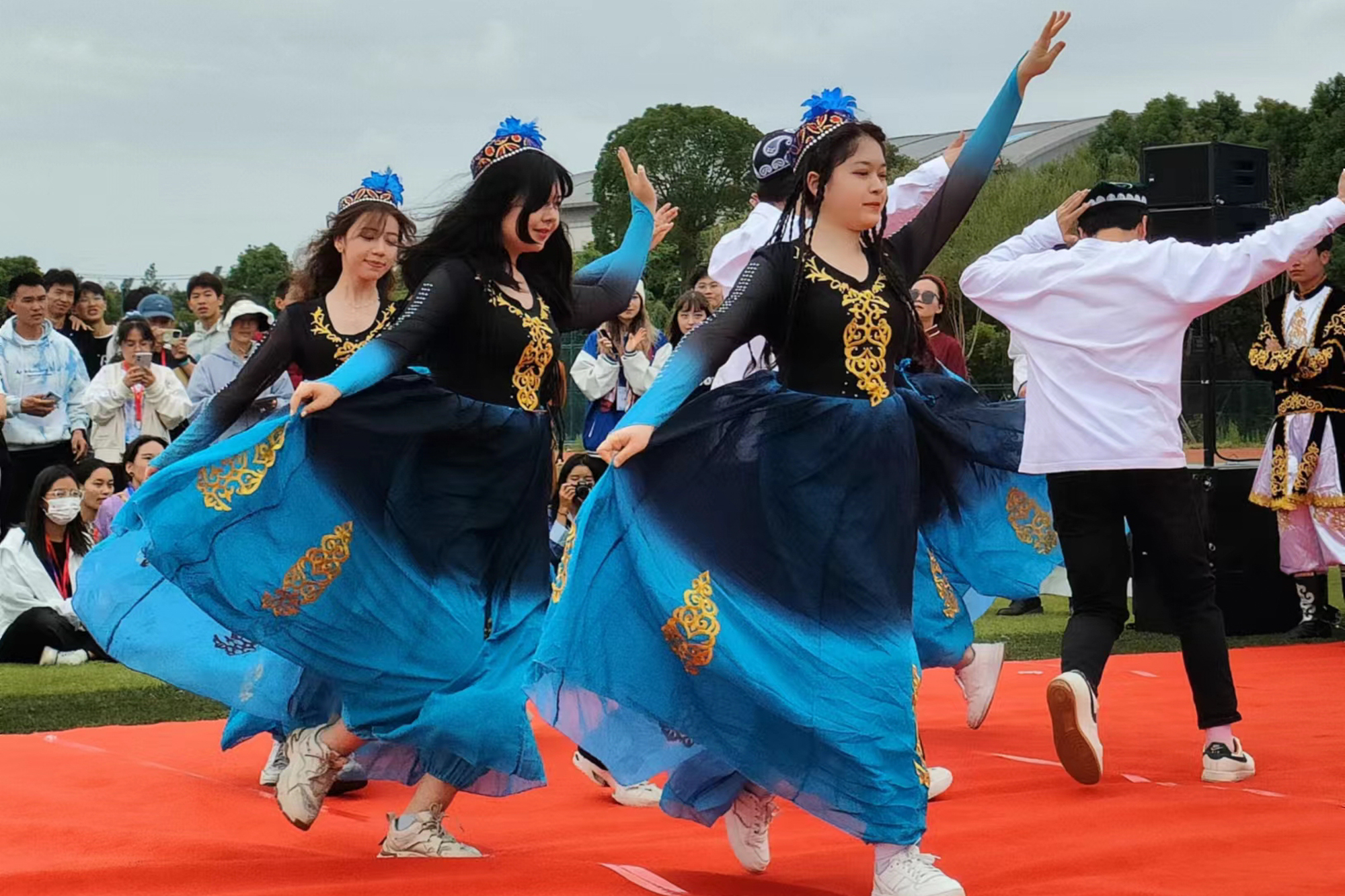 此外,活动还设置了展示区和体验区。在宣传展示区,民族特色体育活动宣传板详细介绍了多项极具代表性的少数民族传统体育项目。在观摩体验区,新疆舞、西藏舞、蒙古舞、竹竿舞等民族特色舞蹈更是精彩绝伦;藏式抱石、押加和有奖问答等活动让观赏的同学融入其中。同时,藏文化社、博格达社团、蒙古族学生代表在展示区搭设了展台,进行民族文化宣传,通过展出各自民族的特色物件、明信片、食品等方式,帮助其他同学了解其民族文化,全方位呈现我校各民族同学团结奋进、幸福和谐的精神风貌。