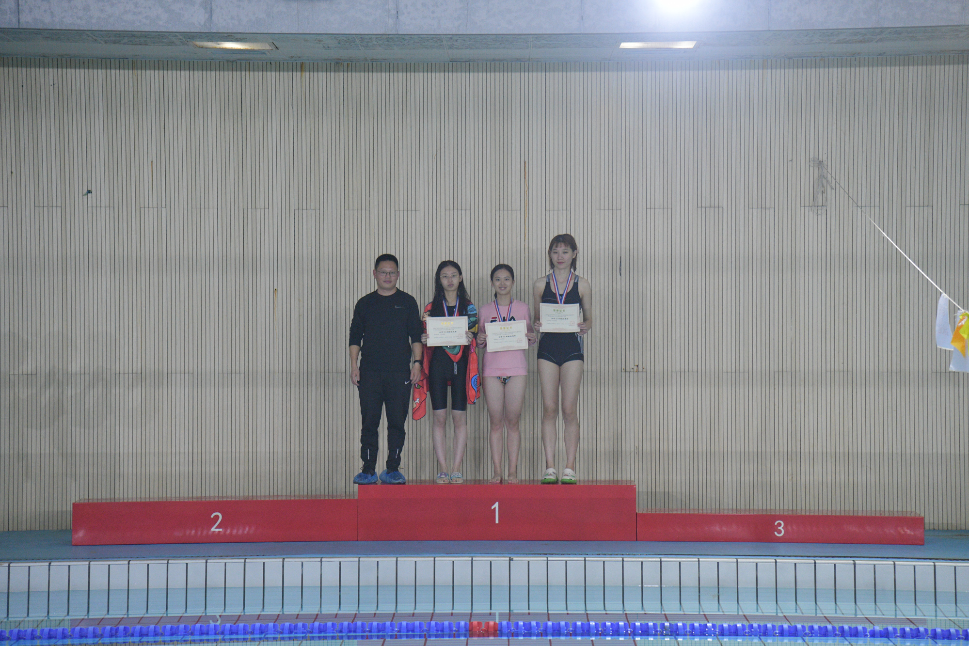 学生(研究生)工作处副处长王新燕为女子25米蛙泳获奖学生颁奖