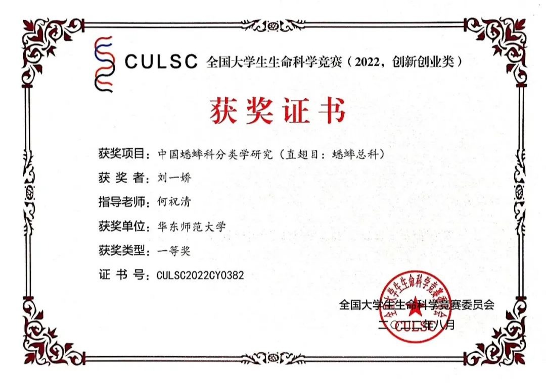 刘一娇,华东师大孟宪承书院2019级生物科学专业公费师范生,2021年度优秀学生一等奖学金获得者。主要以分类学为研究方向,已累计发表描述蟋蟀、螽斯、寄生蜂、睑虎、鞭蛛等4新属20新种。相关成果发表研究型论文17篇,其中一作SCI 6篇。相关研究成果获全国大学生生命科学竞赛国家级一等奖、二等奖、三等奖各一次。上海市生命科学竞赛一等奖、三等奖各一次。