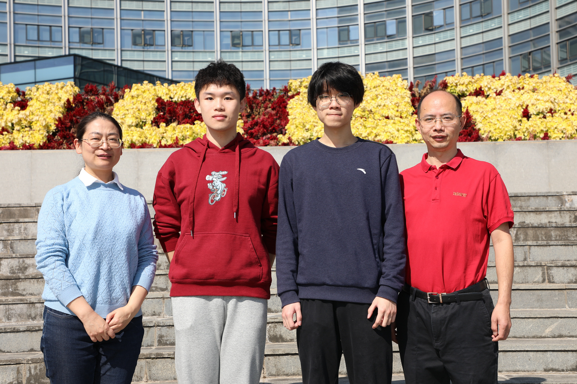 赵一航(左二)、王莘竹与指导教师董光炯(右一)、徐敏