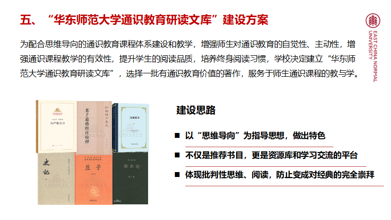 成立通识教育委员会和建设“通识教育研读文库”是华东师大推进通识教育改革的重要举措。近年来,在“卓越育人”改革背景下,华东师大积极推行“思维导向的通识教育”,为配合课程体系的建设和实施,决定建立“通识教育研读文库”,联动第一和第二课堂,通过阅读提升学生的思维品质。
