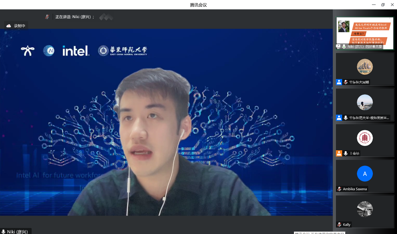 开营仪式之后,戴金权、祝智庭、闫寒冰、英特尔AI for Youth全球种子教师Ambika Saxena、教练Niki Lee五位专家分别从国际和国内视角,分享了人工智能+教育的前沿发展与创新实践。