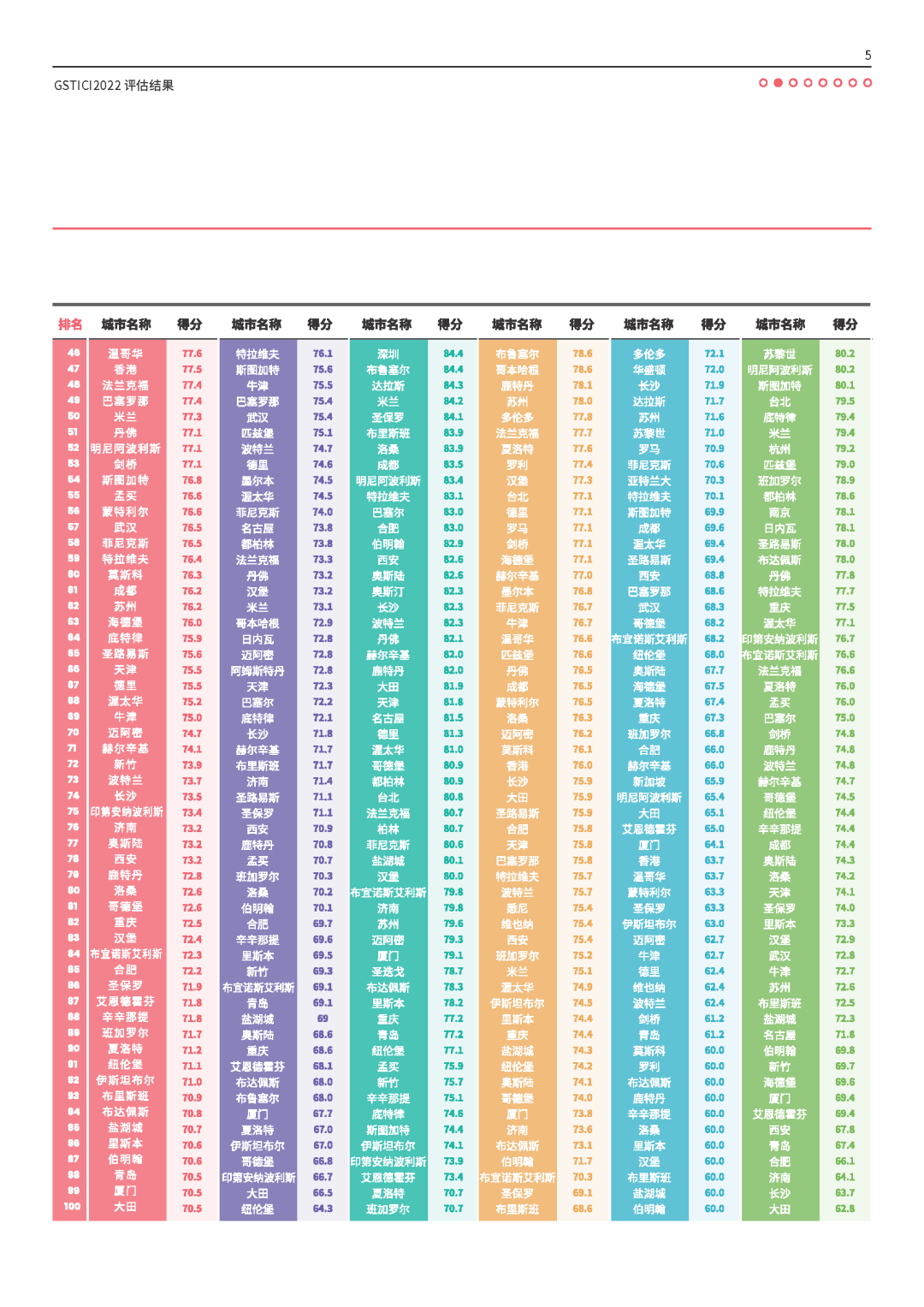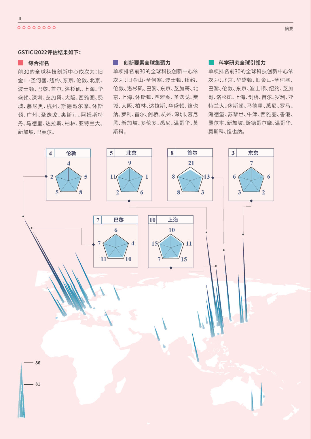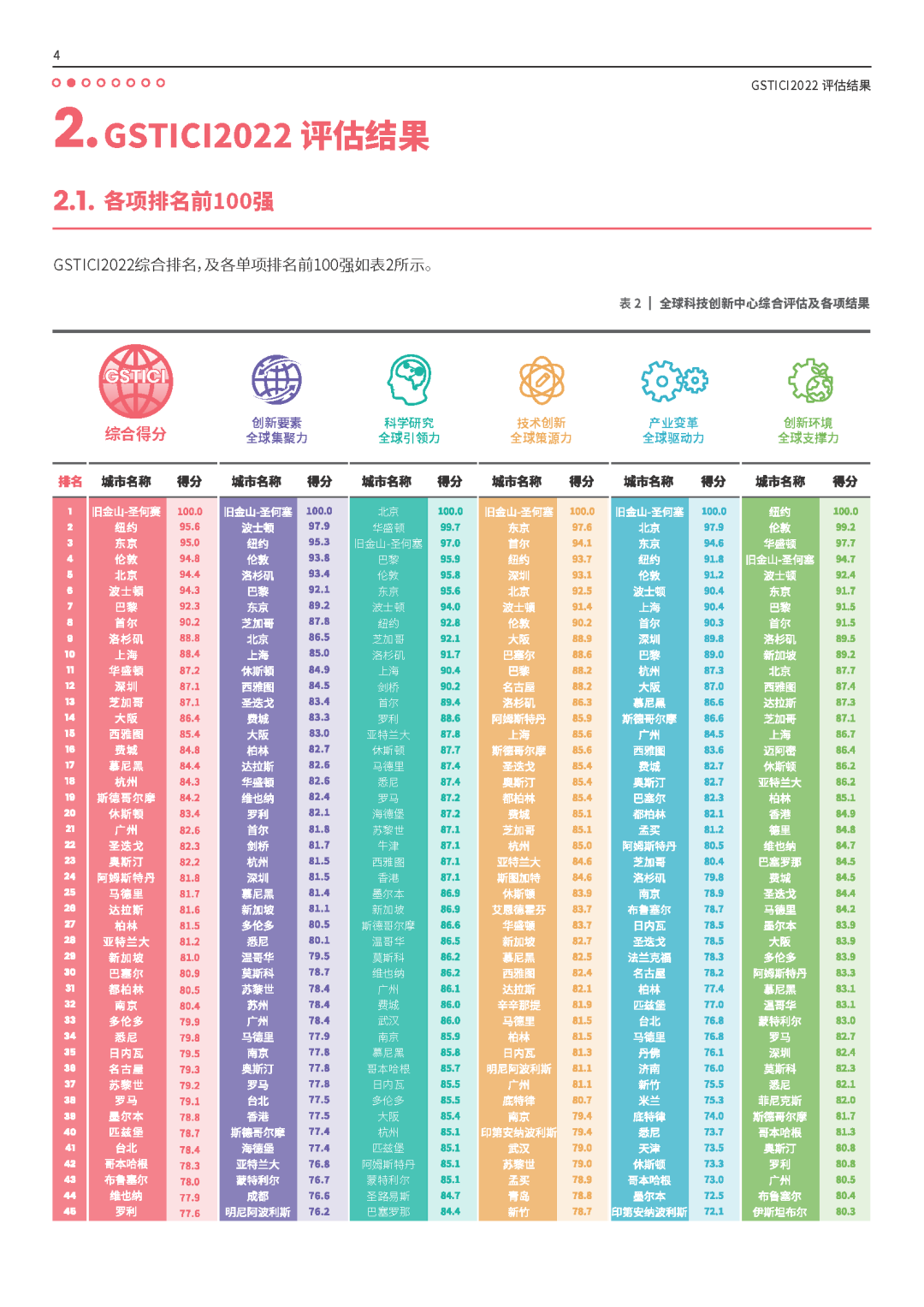GSTICI2022综合排名前30的全球科技创新中心依次为:旧金山-圣何塞、纽约、东京、伦敦、北京、波士顿、巴黎、首尔、洛杉矶、上海、华盛顿、深圳、芝加哥、大阪、西雅图、费城、慕尼黑、杭州、斯德哥尔摩、休斯顿、广州、圣迭戈、奥斯汀、阿姆斯特丹、马德里、达拉斯、柏林、亚特兰大、新加坡、巴塞尔。
