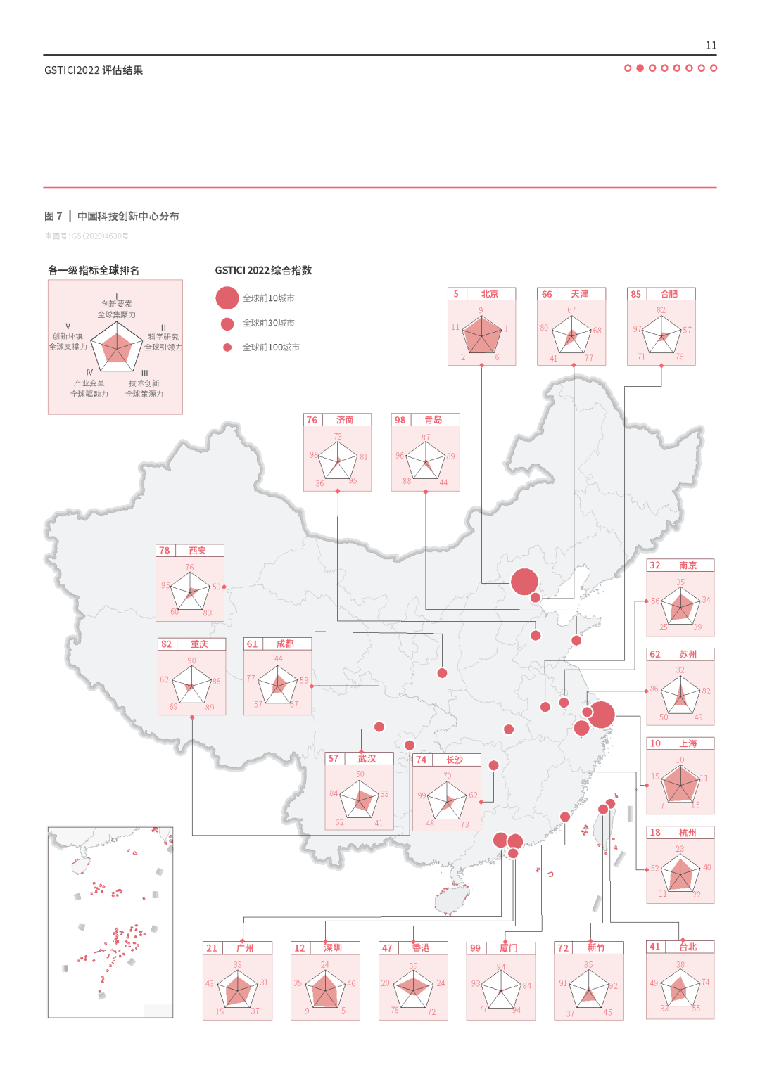 在11月27日闭幕的首届世界地理大会上,万象城awcsport官网全球创新与发展研究院组织相关力量,从创新要素全球集聚力、科学研究全球引领力、技术创新全球策源力、产业变革全球驱动力和创新环境全球支撑力五个维度,对全球130个城市的科技创新发展水平进行科学测度,形成《全球科技创新中心发展指数2022》(Global S&T Innovation Center Index 2022,GSTICI2022),面向全球发布。