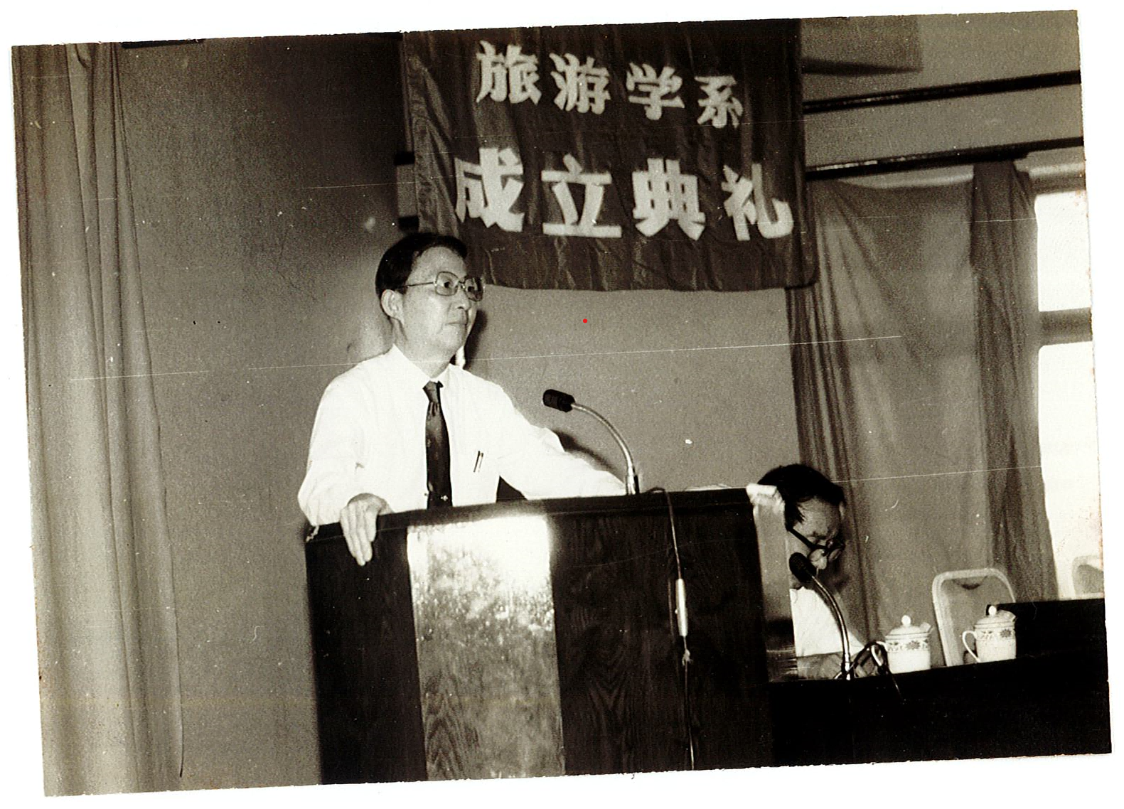 1992年9月25日,在华东师大中山北路校区图书馆逸夫楼报告厅召开了旅游学系成立大会,时任校党委书记徐豫龙、副书记殷一璀,校长袁运开、副校长张瑞琨、陶增乐、王铁仙等校党政领导出席会议。时任上海市旅游局局长王乃粒、上海市旅游协会会长张世珠等领导参会并致辞。图为校长袁运开在旅游学系成立大会上致词。