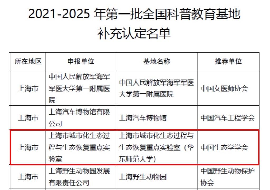 11月29日,中国科协发布关于命名2021-2025年第一批补充认定的全国科普教育基地的决定,华东师大上海市城市化生态过程与生态恢复重点实验室(以下简称“城市生态重点实验室”)经中国生态学学会推荐,顺利通过评审,成功入选全国科普教育基地。
