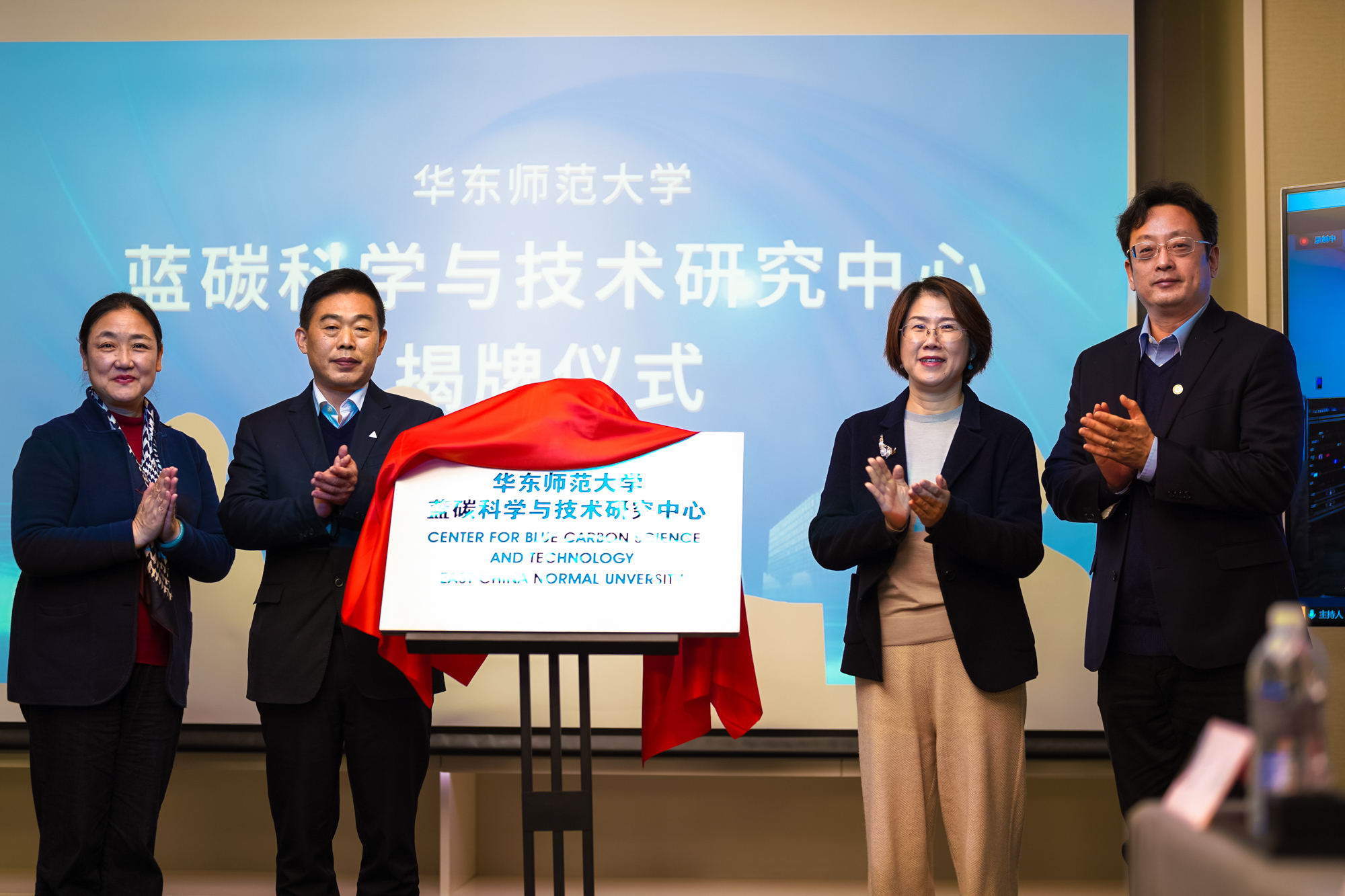 会上,上海市科委二级巡视员郑广宏、生态环境部太湖东海局副局长金左文、华东师大校长助理施国跃和河口海岸学国重室主任何青共同为“蓝碳中心”揭牌。