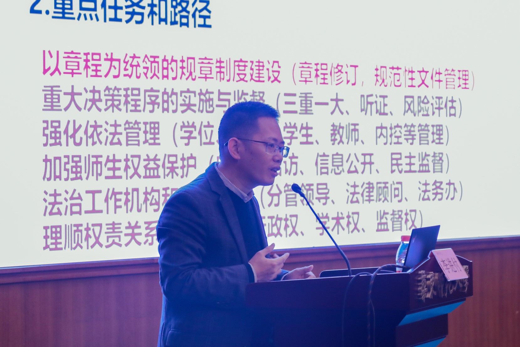 上海市教委政策法规处副处长李进付作题为“当前高校法治热点问题探讨”的报告