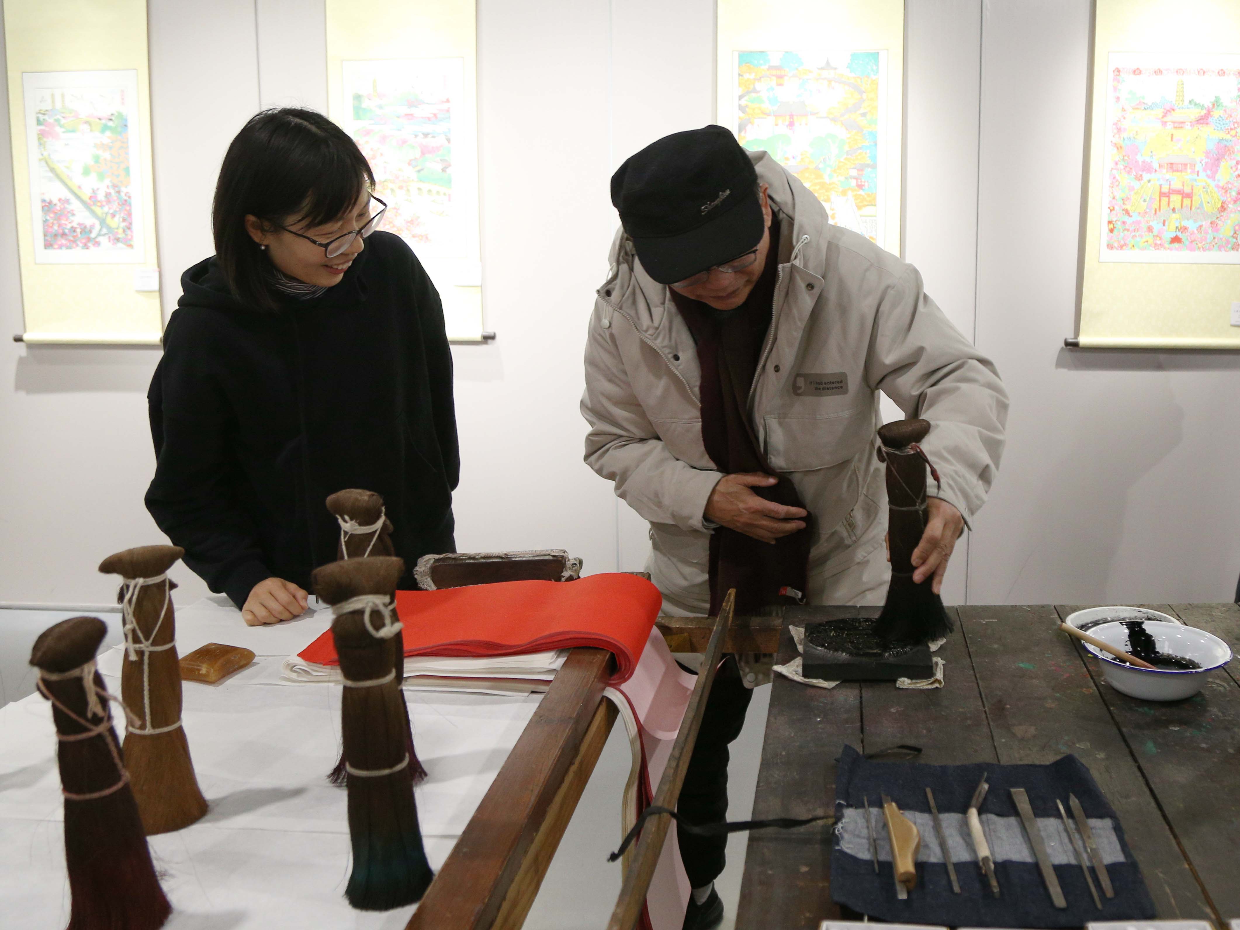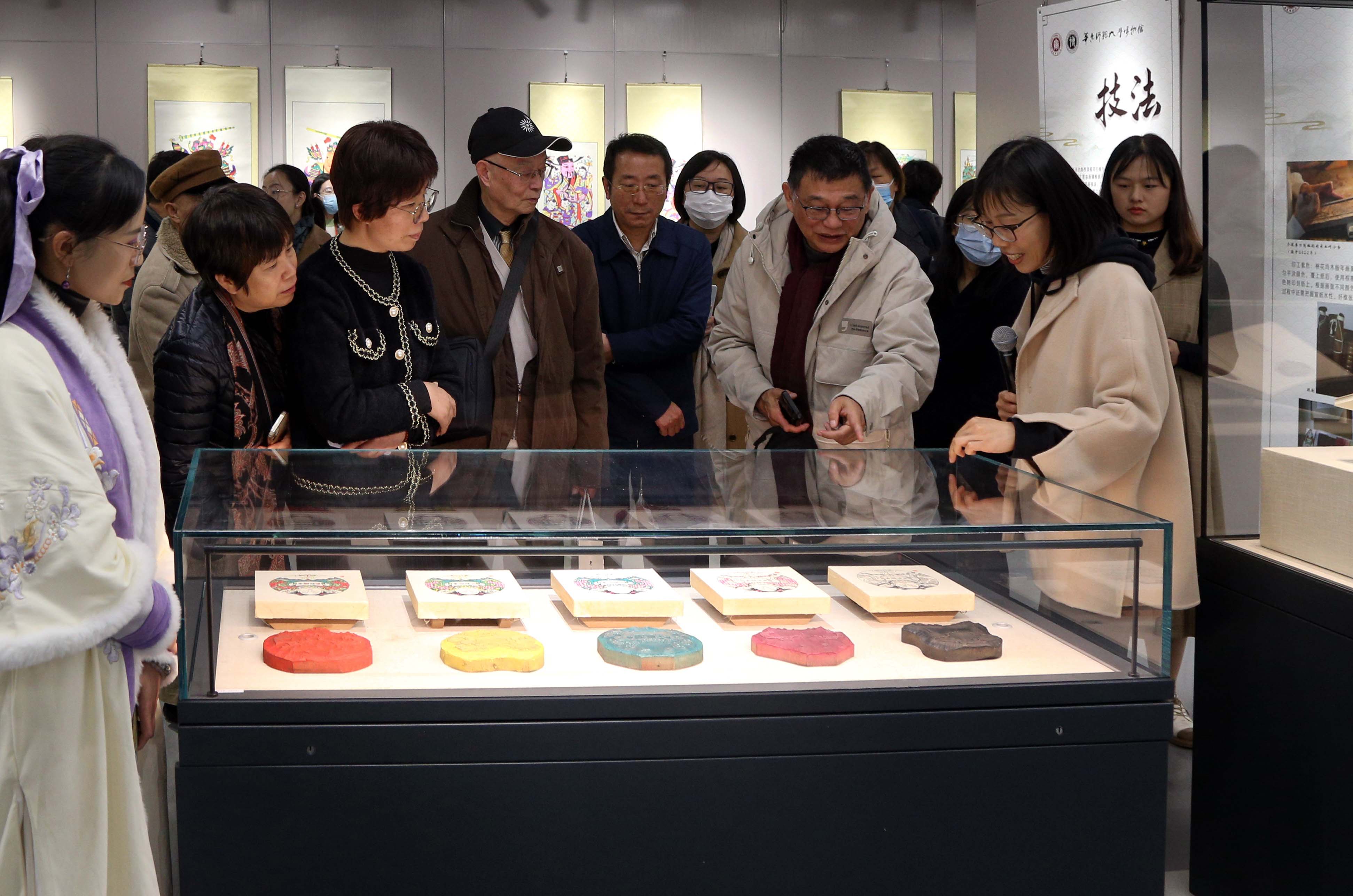 与会嘉宾和师生共同观看了展览宣传片,并在传承人的指引下,按照展陈理念绕场欣赏所展精美桃花坞木版年画作品。嘉宾和师生们感受到的不仅仅是眼前的一幅幅作品,还有年画传承人们在长期的传承过程中所沉淀下来的坚守和执着。