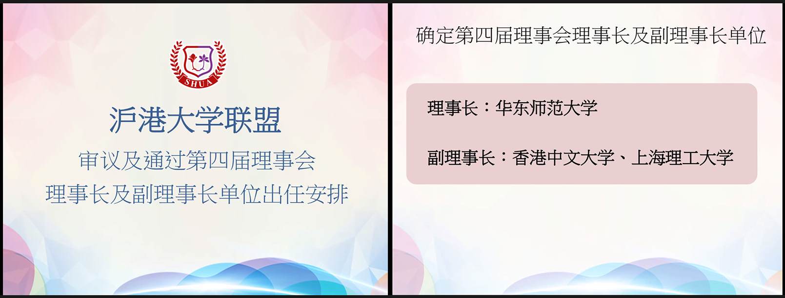 理事会会议上,复旦大学作为联盟秘书处单位,总结报告了含暑期学校、实习项目、财务状况等在内的2022年沪港大学联盟整体工作情况,并对联盟高校间即将开展的“学术成果奖”“交流合作奖”的评定进行方案介绍。随后,全体沪港联盟成员审议并通过了第四届沪港联盟理事会理事长及副理事长单位出任安排,一致同意第四届理事会理事长单位由万象城awcsport官网担任,副理事长单位由香港中文大学、上海理工大学担任。