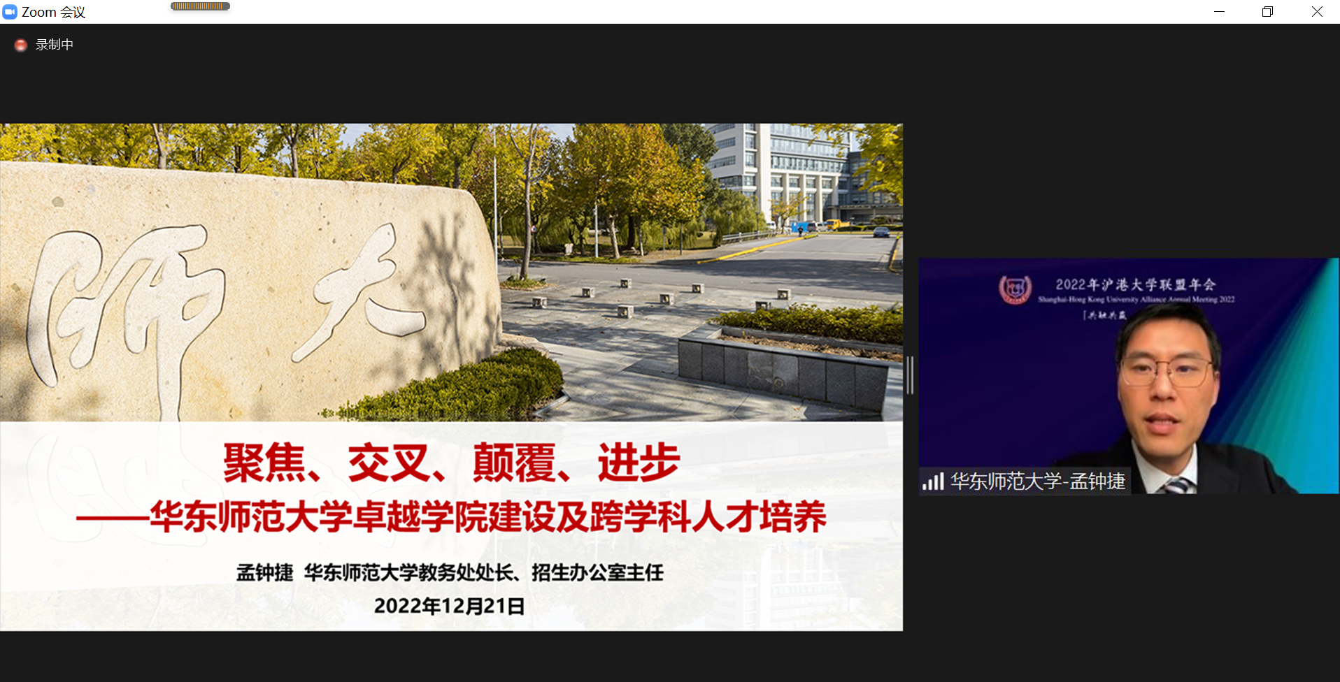 2022年沪港大学联盟年会暨“共融共赢 共创新科学”沪港高校跨学科的发展与创新论坛于12月21日召开,此次年会采取线上形式,由沪港大学联盟年会开幕式、理事会会议及主题论坛三部分组成。华东师大副校长顾红亮代表学校参加了本届年会理事会会议,并作为2023年度联盟理事长单位代表发言。教务处处长兼招生办公室主任孟钟捷参加主题论坛并作主题报告,来自教务处、科技处、人文与社会科学研究院、港澳台办公室等单位的10余名代表上线参会。本次年会由香港浸会大学内地发展办公室处长李进秋主持。