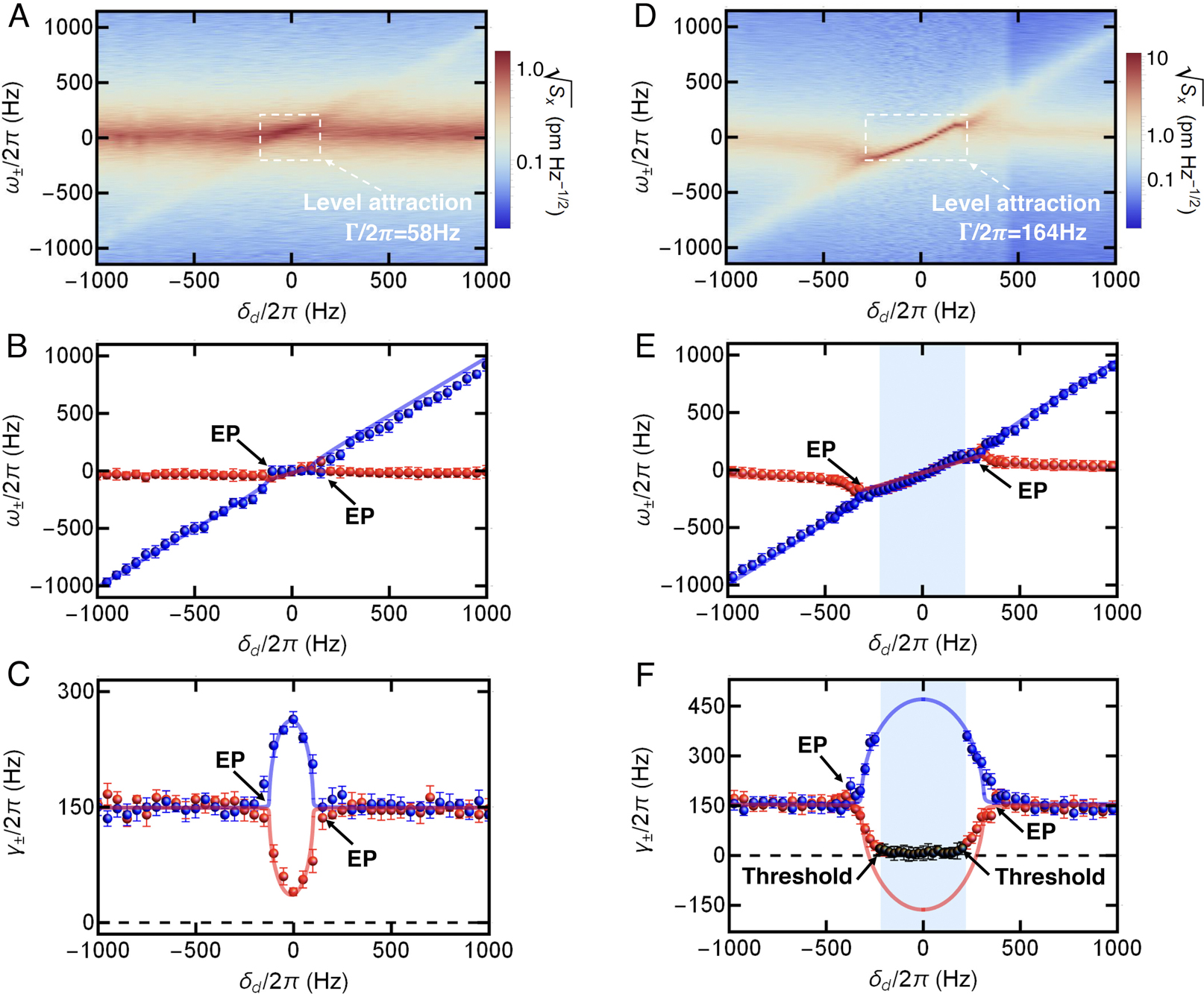 (A-C)分别为耗散耦合强度较弱时测得的机械振子功率谱以及对应的实部和虚部;(D-F)分别为耗散耦合强度较强时测得的机械振子功率谱以及对应的实部和虚部