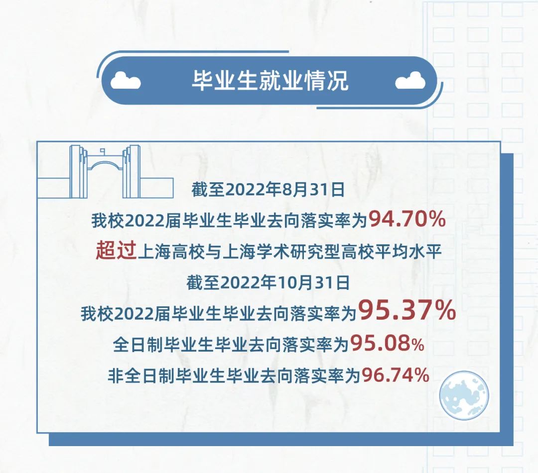 截至10月31日,华东师大2022届毕业生去向落实率为95.37%,其中全日制毕业生毕业去向落实率为95.08%,非全日制毕业生毕业去向落实率为96.74%。