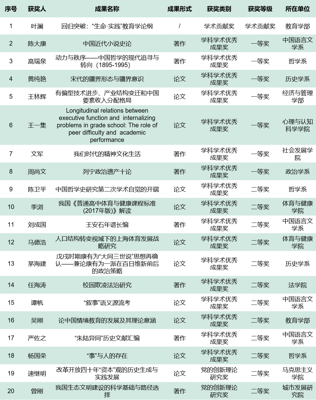 20项成果获上海市第十五届哲学社会科学优秀成果奖,获奖总数和学科学术奖获奖数均位居上海第2。