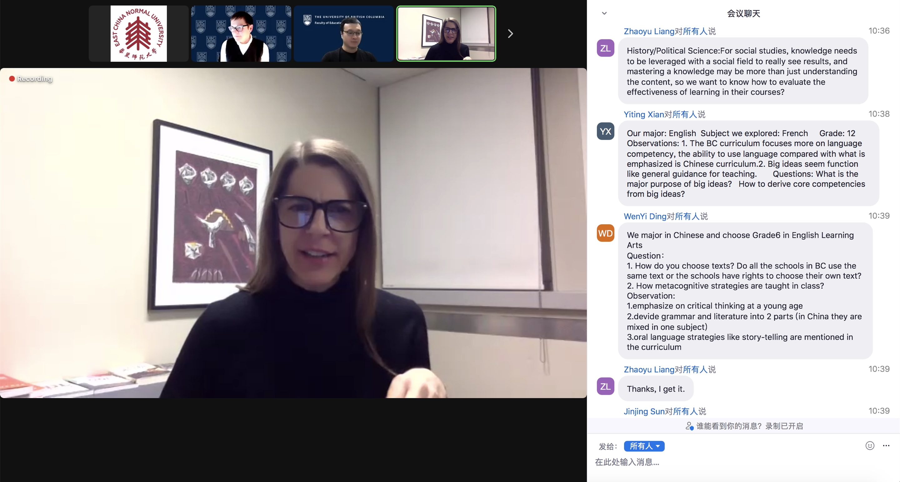 项目安排了基础教育学校云参访及师生互动。通过与BC省中学生的互动,同学们了解了当地基础教育学校的教学设施、第二课堂、艺术教育,两地学生就教学、活动、校园生活等展开热烈讨论。第三周安排了当地中学一线教师见面会,同学们与BC省教授中学科目的优秀教师交流,涵盖教育理念、教学法、教学实践案例等。