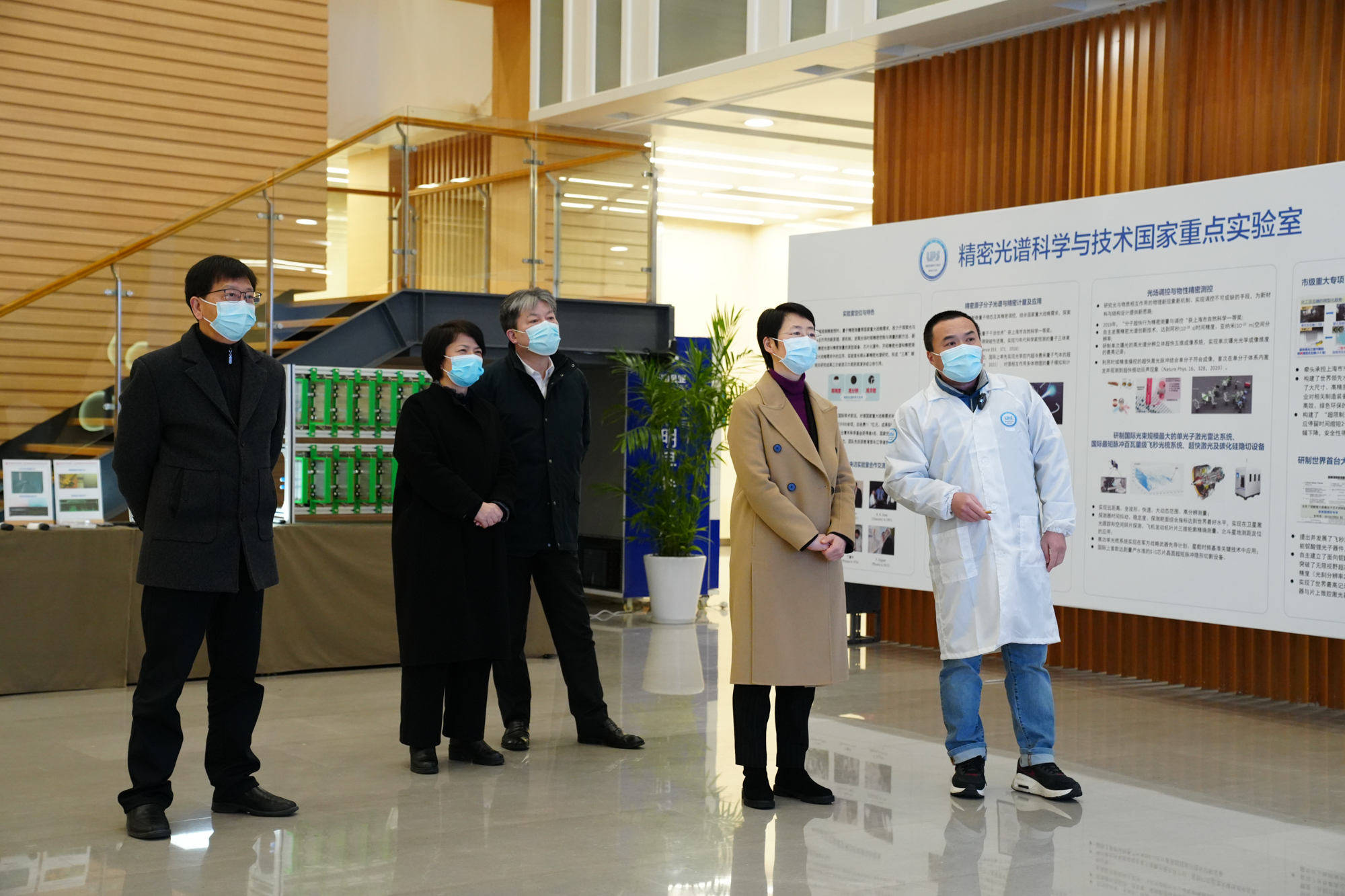 解冬一行随后来到光学大楼,参观精密光谱科学与技术国家重点实验室,听取国家重点实验室主任程亚关于国重室的发展历史、近年来的重大科学发现和关键核心技术突破、未来发展方向等方面的工作汇报。