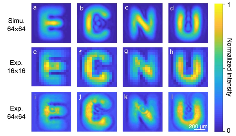 图 3:基于Hadamard空间编码的中红外单像素成像数值模拟与实验结果