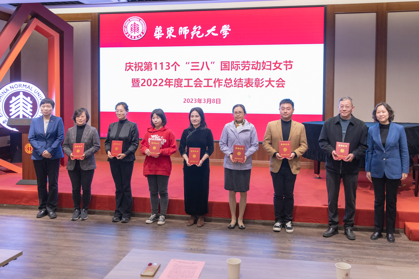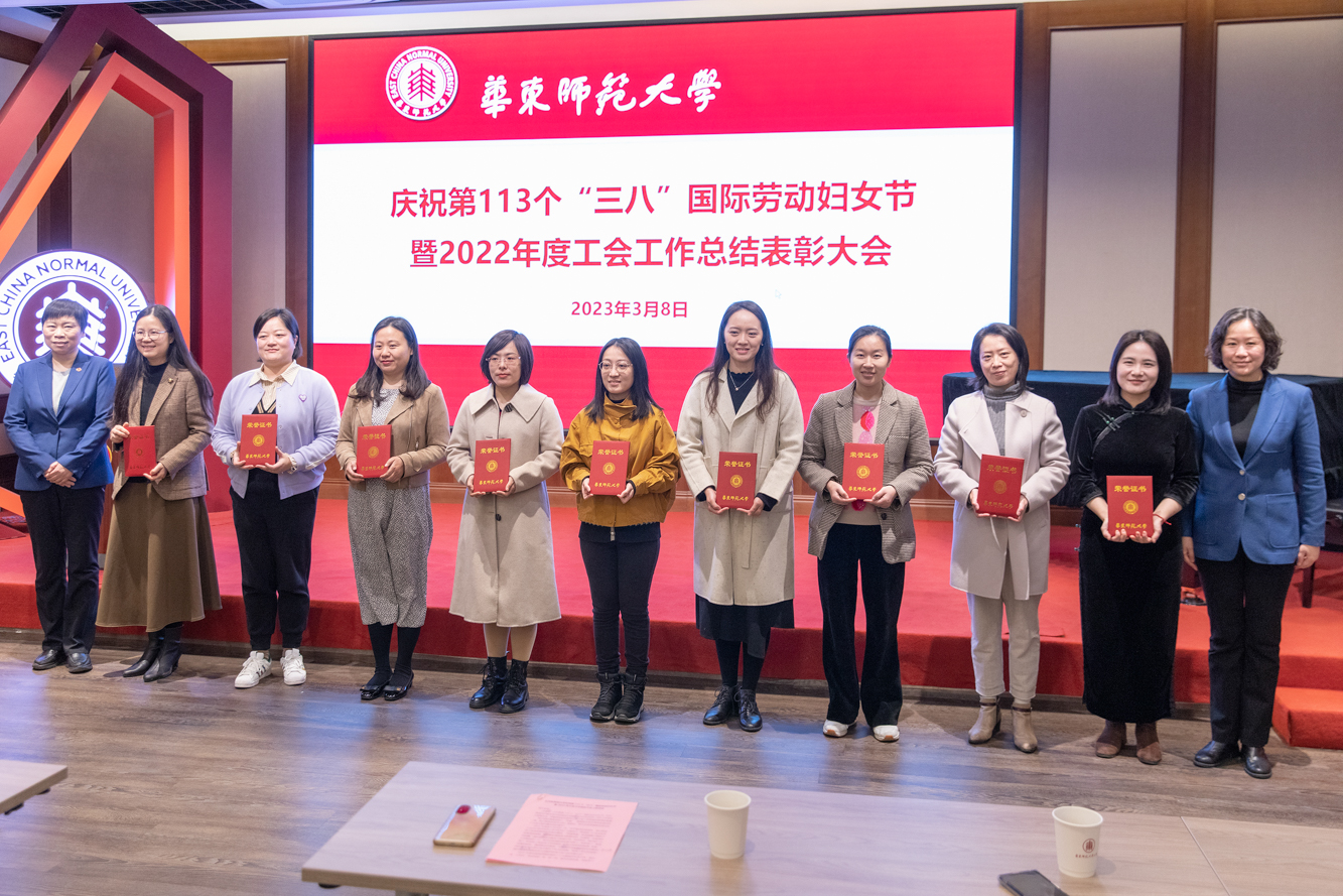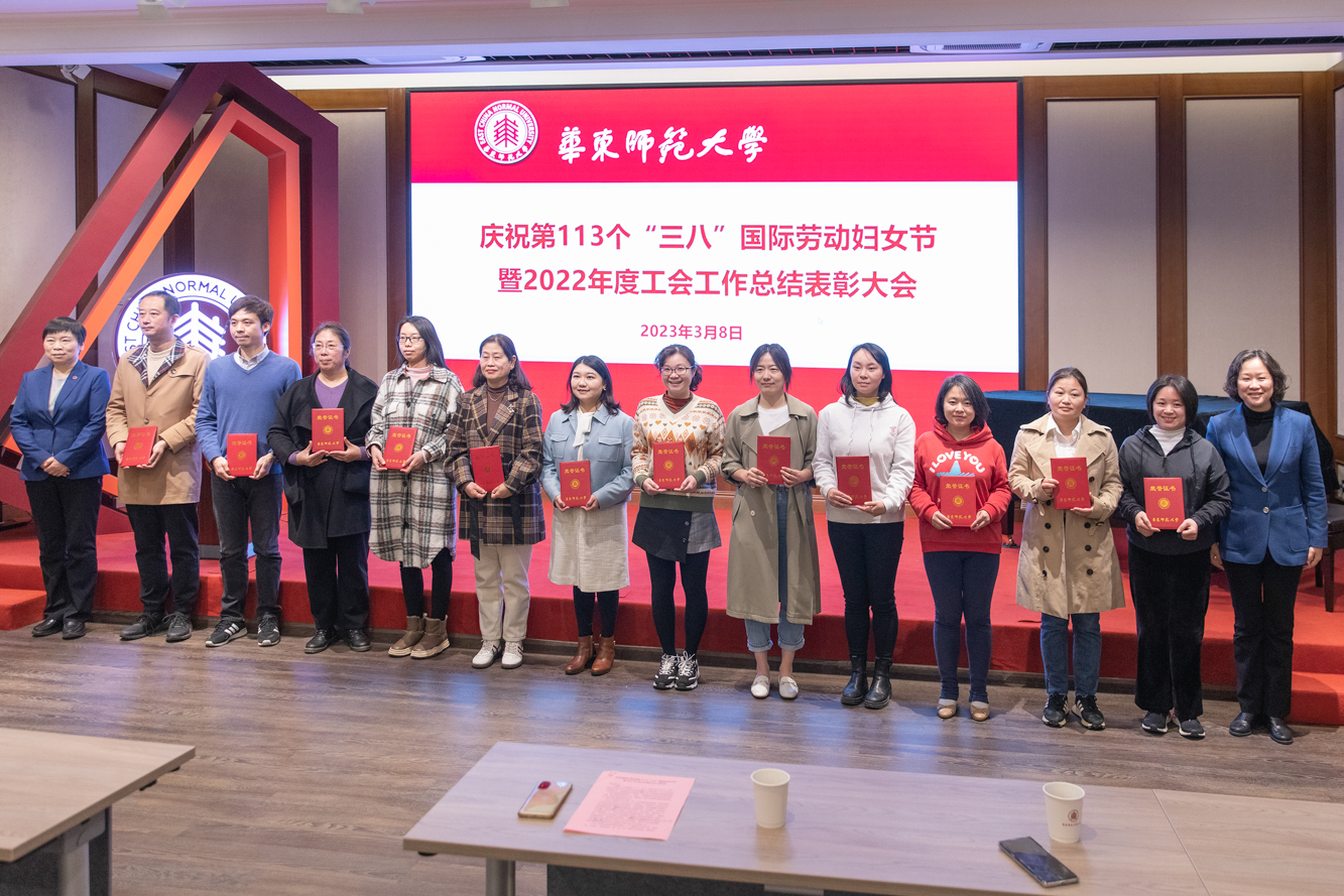 3月8日上午,华东师大庆祝第113个“三八”国际劳动妇女节暨2022年度工会工作总结表彰大会在普陀校区工会一楼多功能厅举行。校工会两委委员,妇委会委员、各部门工会主席以及获得各类荣誉称号的先进个人和先进集体代表70余人参加了表彰会。校领导杨昌利、程静出席会议,并为获奖个人和单位颁奖。