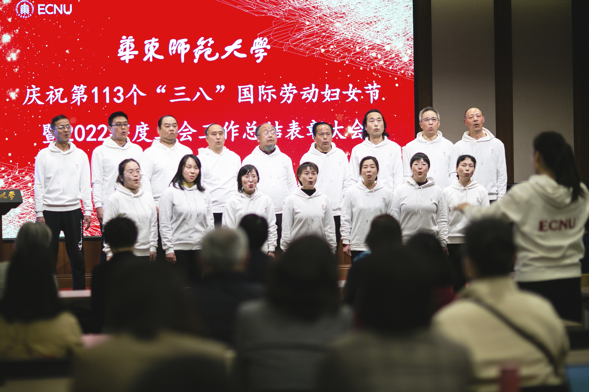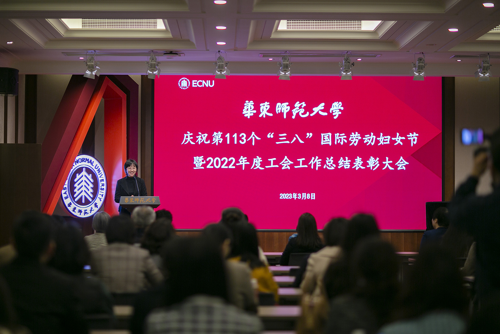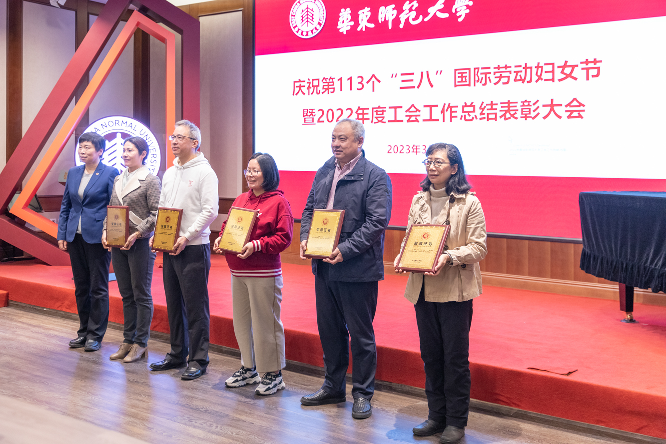 3月8日上午,华东师大庆祝第113个“三八”国际劳动妇女节暨2022年度工会工作总结表彰大会在普陀校区工会一楼多功能厅举行。校工会两委委员,妇委会委员、各部门工会主席以及获得各类荣誉称号的先进个人和先进集体代表70余人参加了表彰会。校领导杨昌利、程静出席会议,并为获奖个人和单位颁奖。