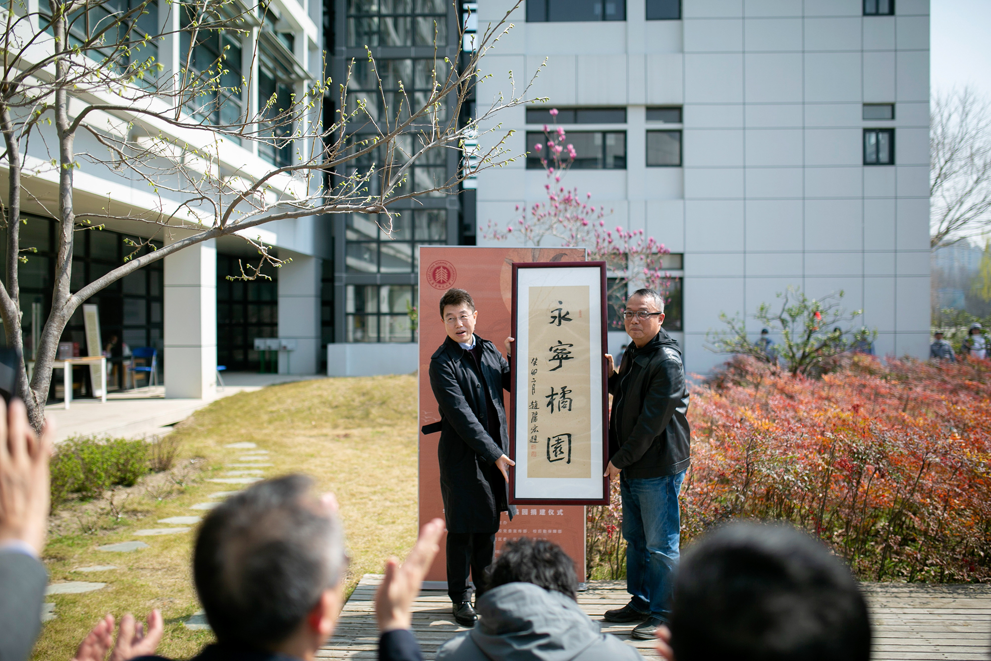 捐赠仪式上,外语学院院长杨延宁与校后勤保障部党委书记魏勇共同展示了“永宁橘园”题名。题名由著名作家、华东师大校友赵丽宏先生所书。