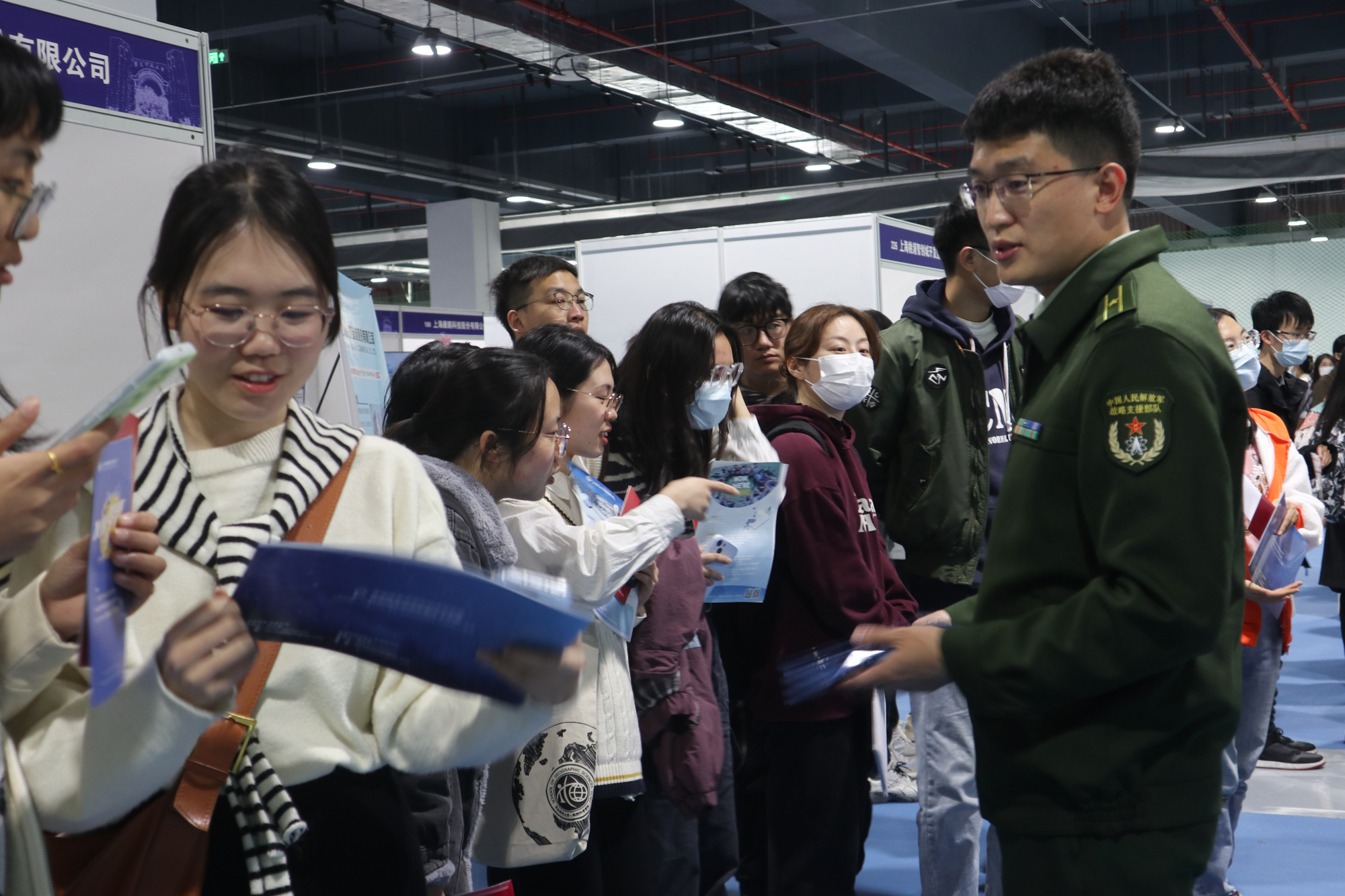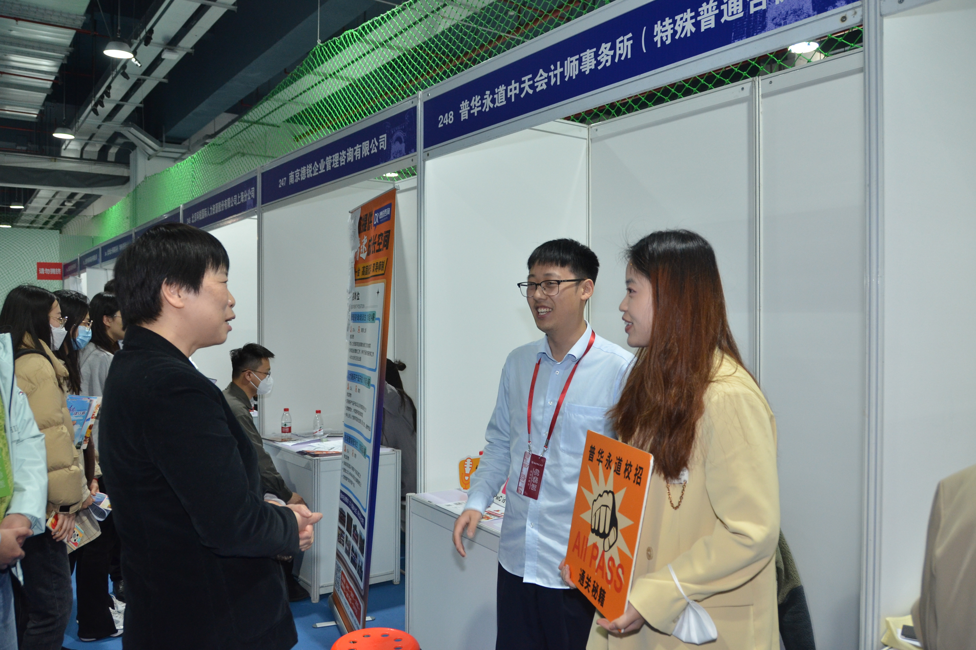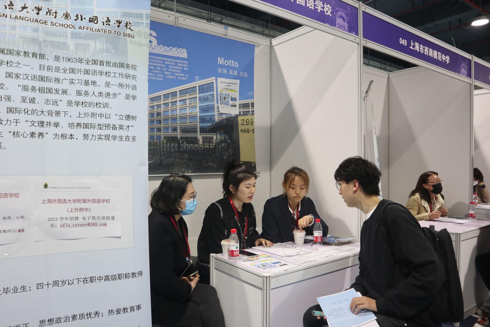 华东师大附属学校,上海、浙江、江苏各类中小学、银行、出版社、基金会、医院、科技公司、大型国企、军官直招……251家名校、名企齐聚华东师大普陀校区体育馆,涉及教育、金融、信息技术、文化出版、节能环保、新能源等行业领域,招聘专业涵盖中文、数学、外语、思政、历史、地理、化学、生物、心理、电子信息、经济等学科,提供3000多个岗位,近万人发布需求。招聘会吸引了2000多名学生,馆内馆外人潮涌动,热度非常。